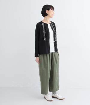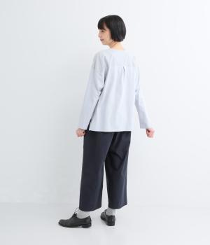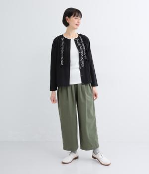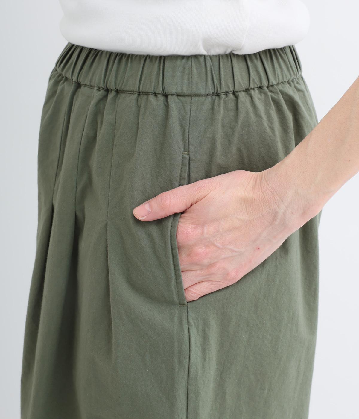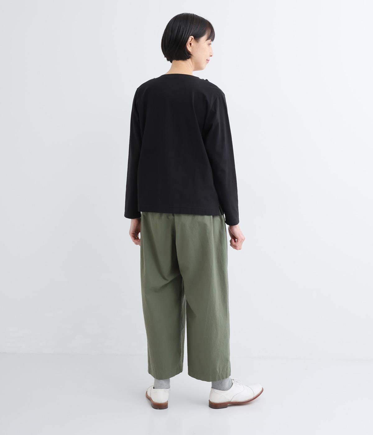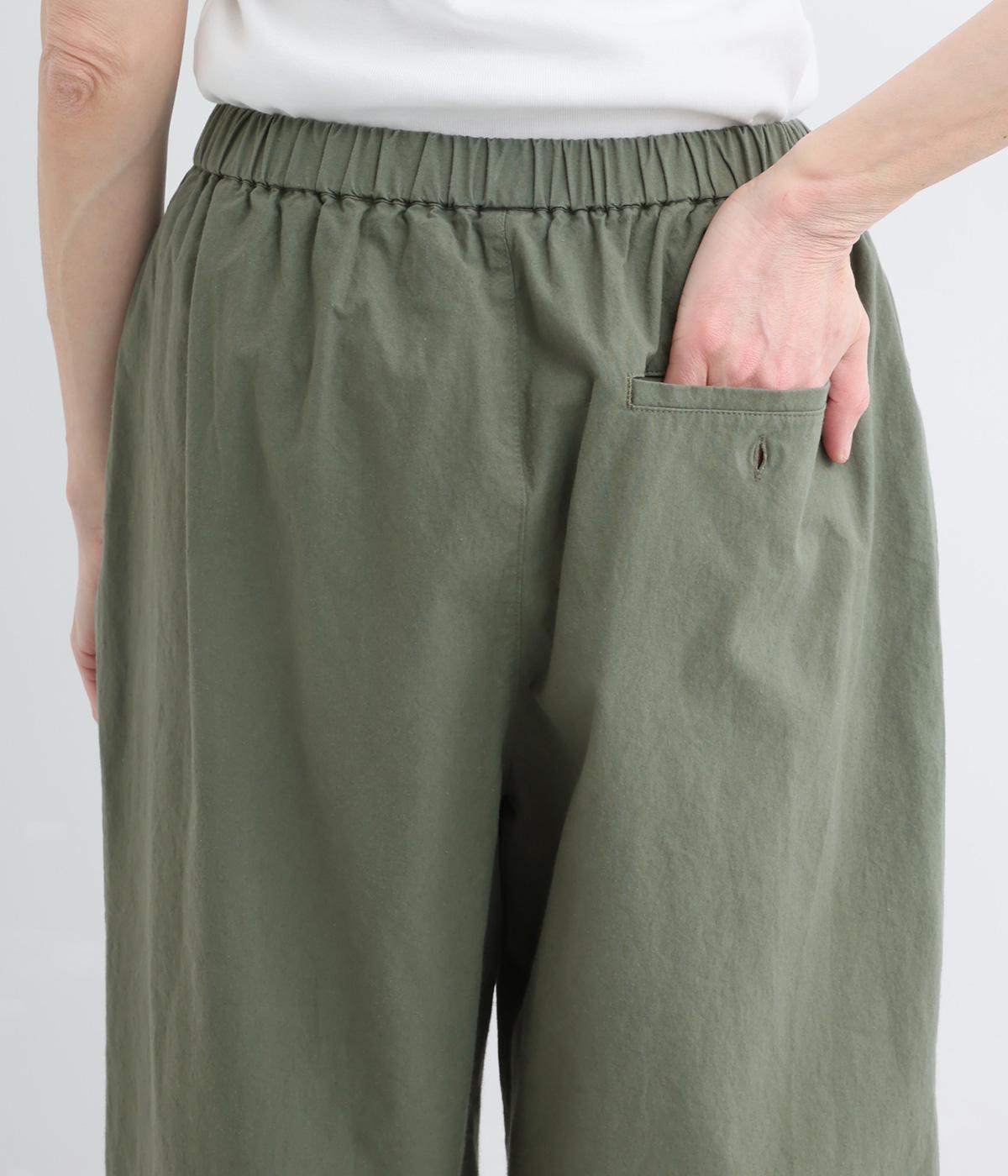 ゆるやかなテーパードシルエットで脚のラインを拾いにくく、たっぷりとほどこしたタックが腰まわりをカバーします。ウエストは総ゴムでリラックス感のある穿き心地。内紐でサイズ調節も可能です。