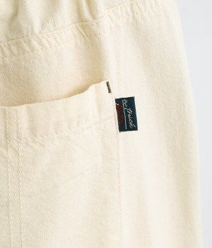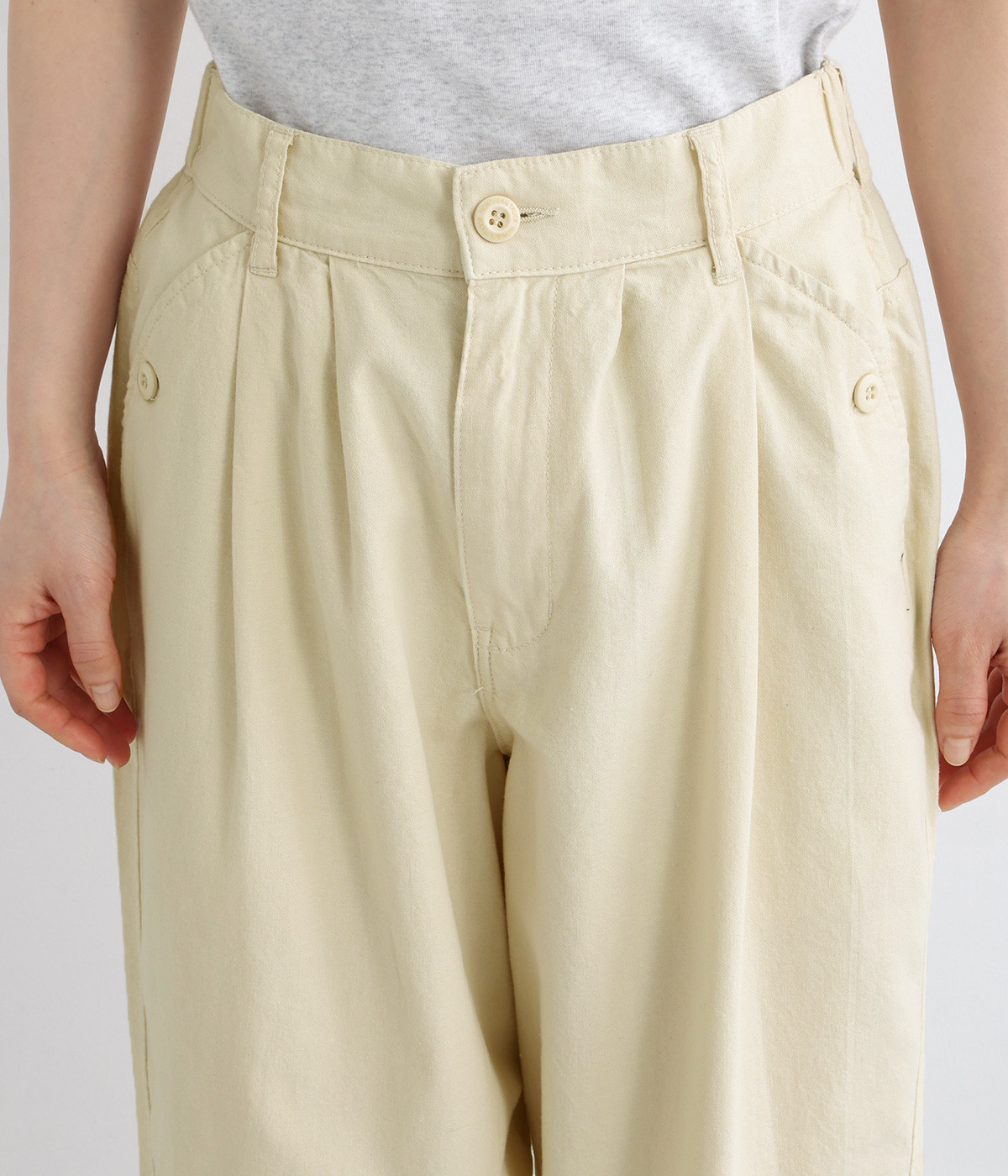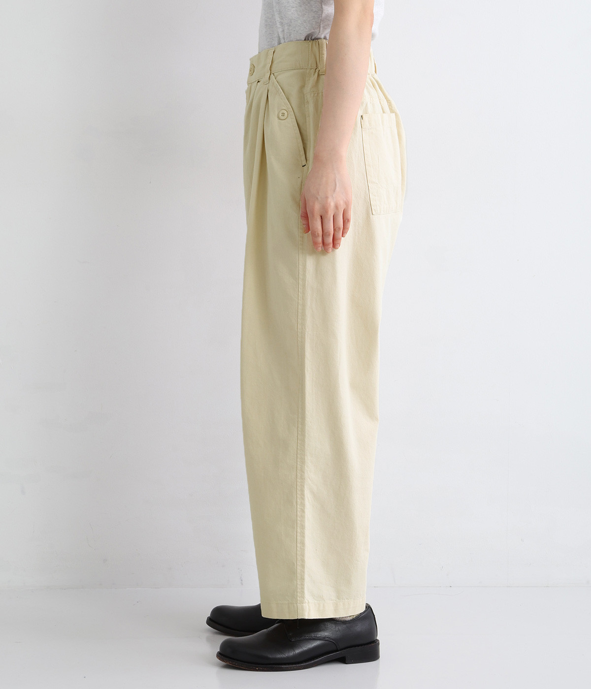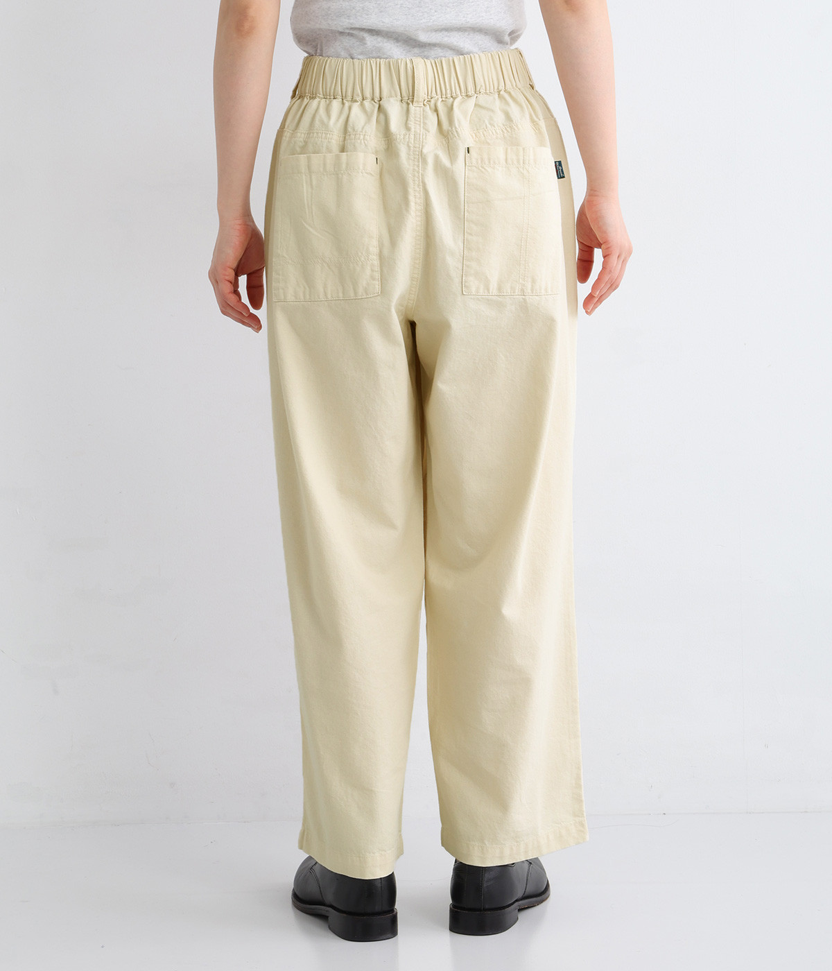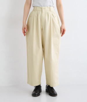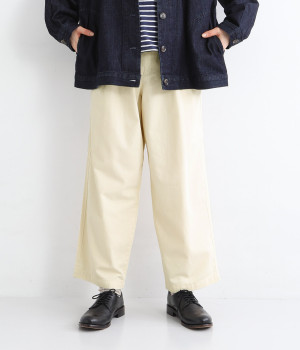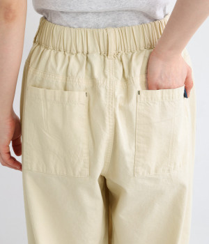 ボタンをあしらったサイドポケットがさり気なく個性を発揮します。ゆったりとリラクシーにはけるワイドテーパードシルエットに仕上げました。バックゴムウエストになっていて着脱しやすく、窮屈になり過ぎないはき心地に。