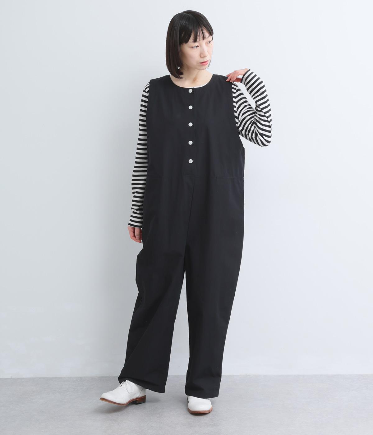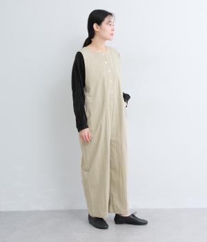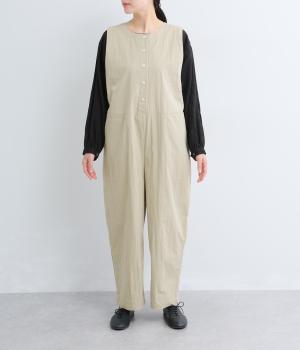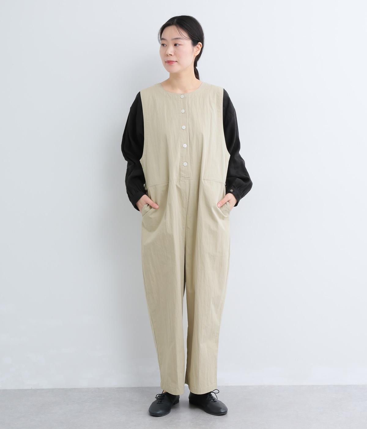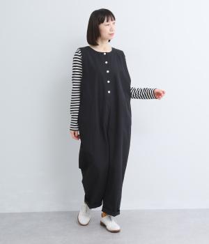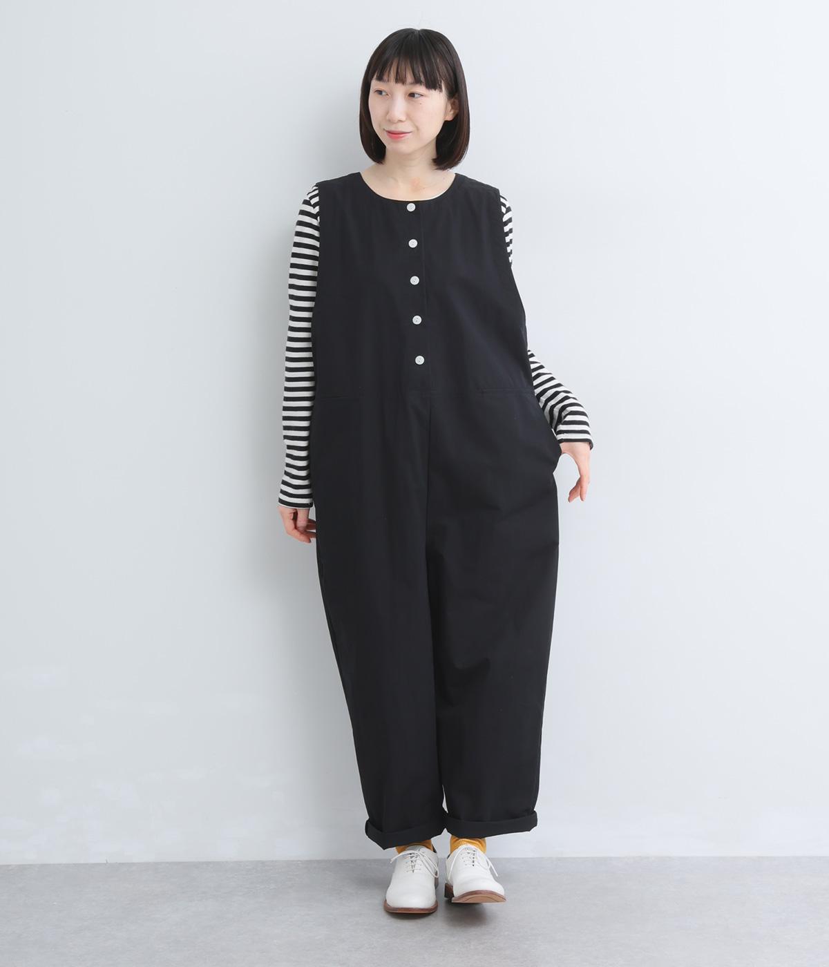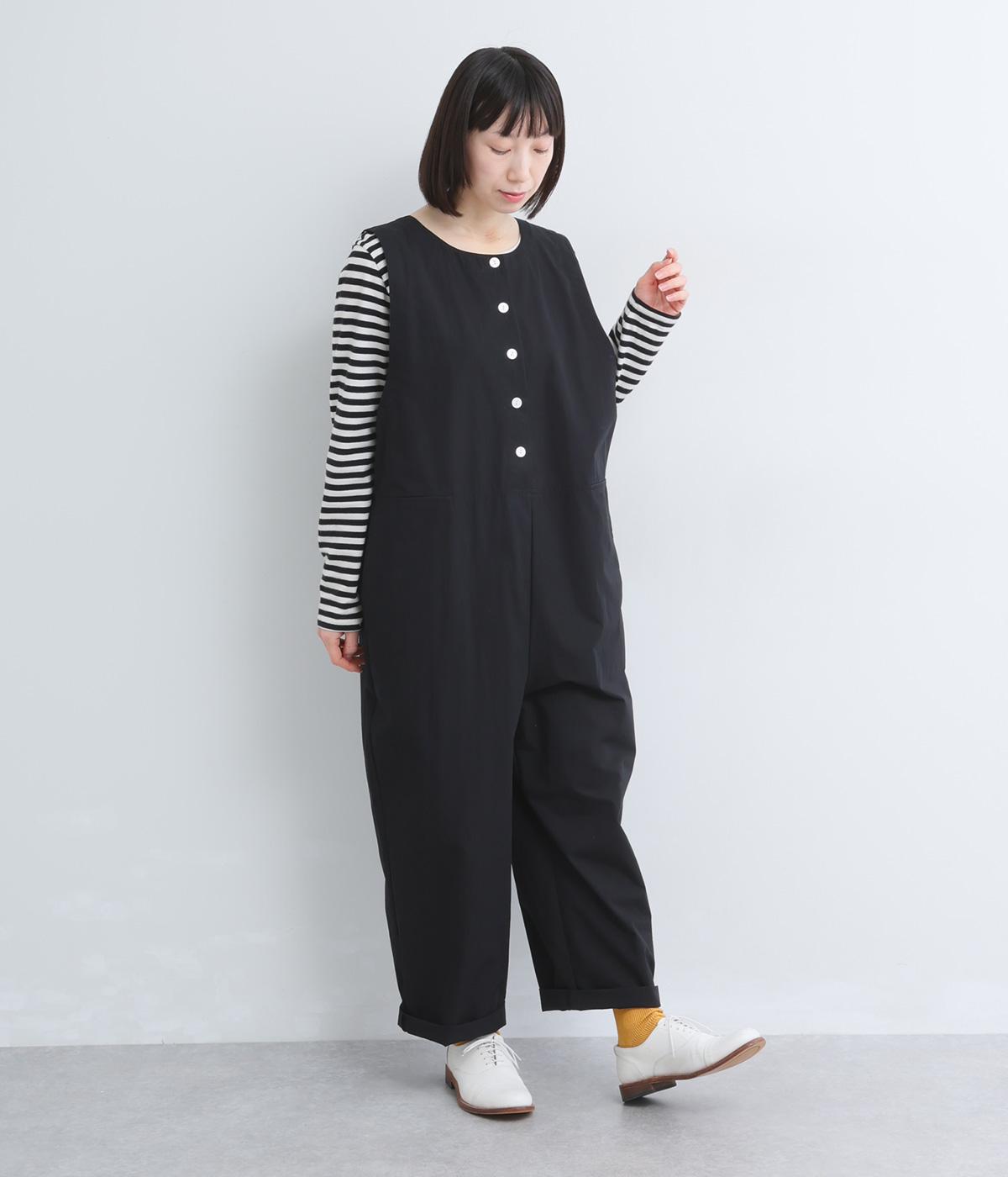 すっきりとしたタテラインを意識したオールインワンパンツ。シャリ感のある素材が洗練された印象を運び、シンプルながらも存在感を発揮。白ボタンがさわやかなアクセント。アームホールが広めなのでさまざまなトップスと合わせられます。