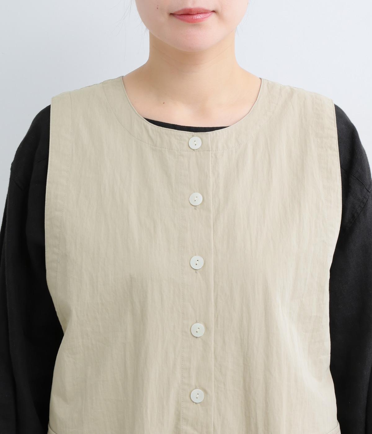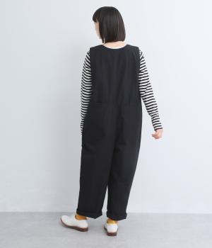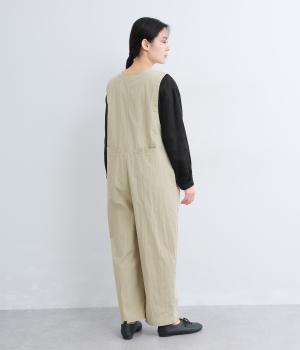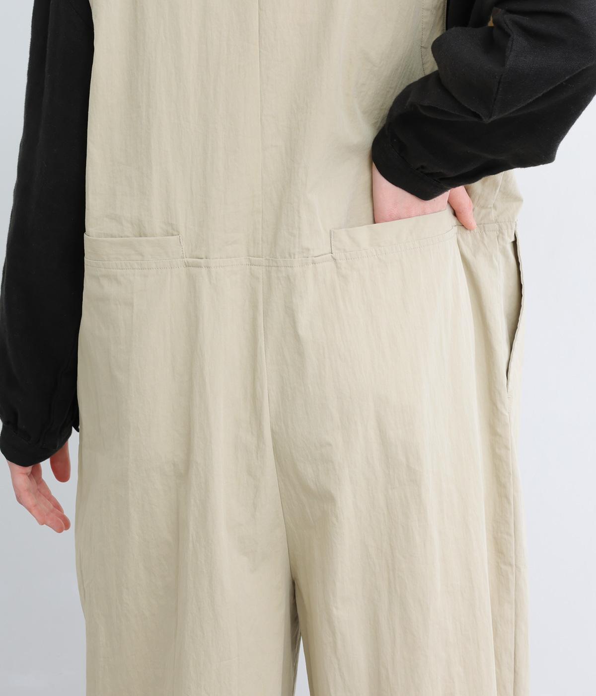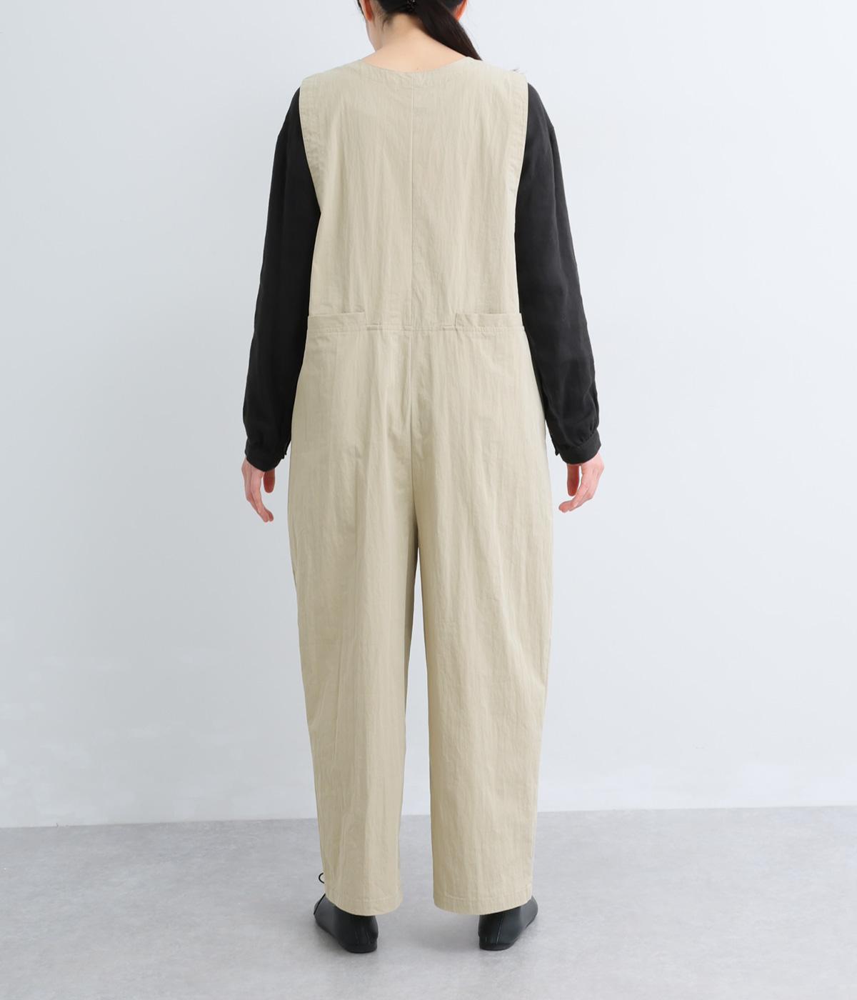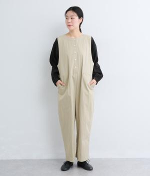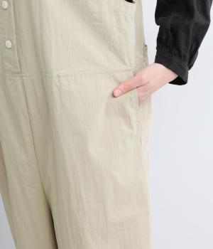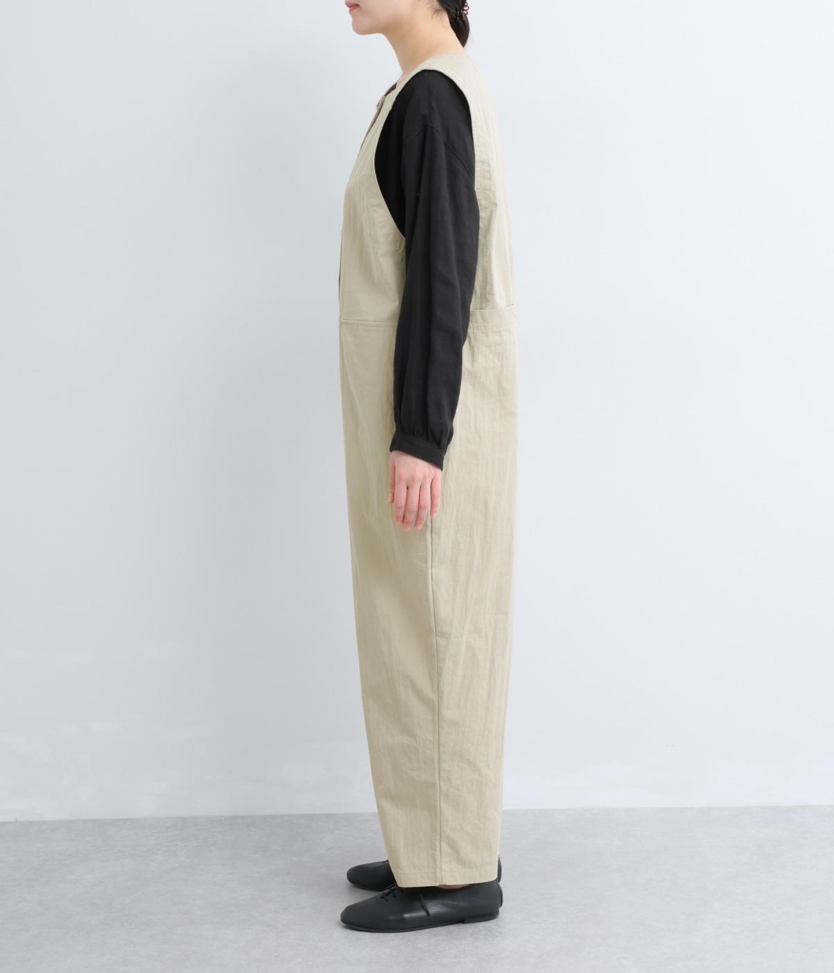 すっきりとしたタテラインを意識したオールインワンパンツ。シャリ感のある素材が洗練された印象を運び、シンプルながらも存在感を発揮。白ボタンがさわやかなアクセント。アームホールが広めなのでさまざまなトップスと合わせられます。