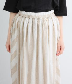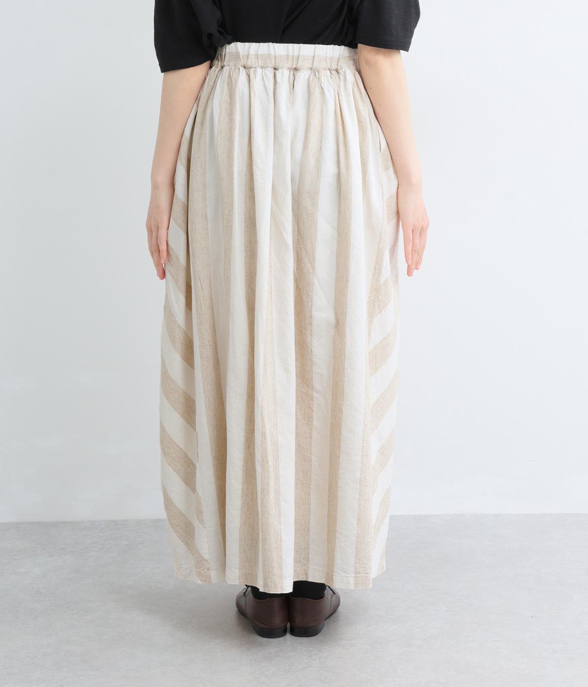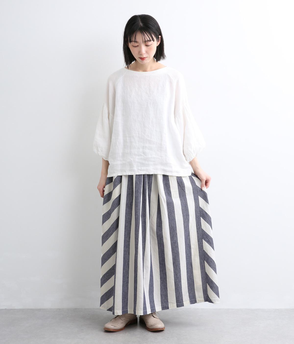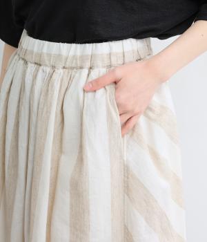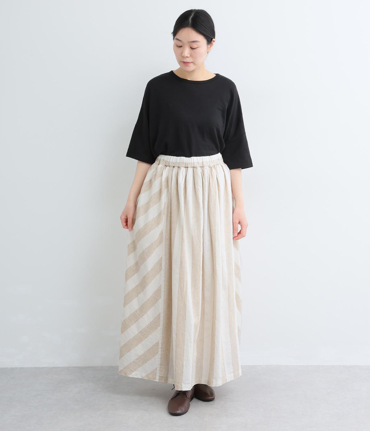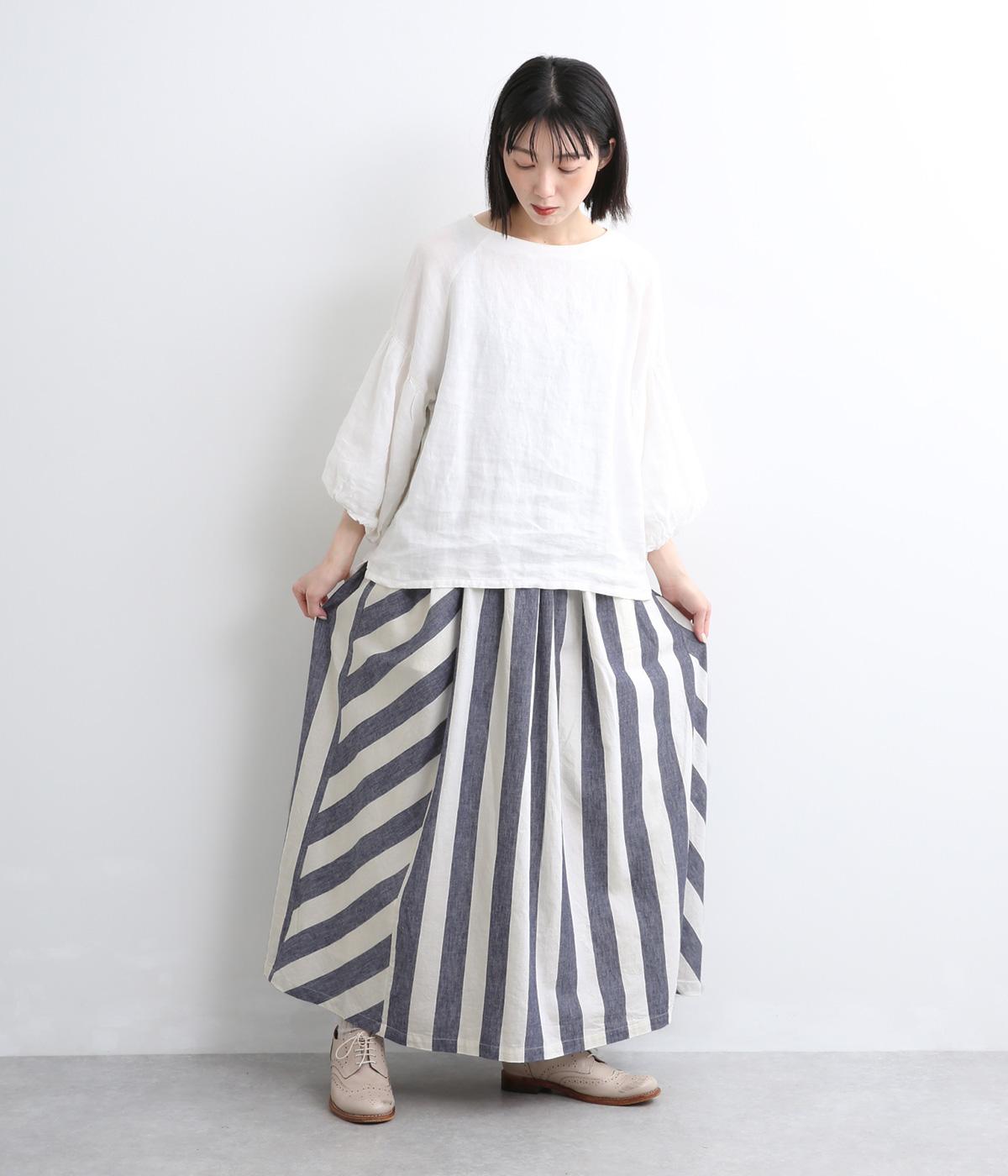 ストライプとボーダーの切り替えがさわやかに映えるスカートです。ウエストはゴム仕様でゆったりとした着心地。ふんわり広がるシルエットが女性らしさを引き立て、シンプルなトップスと合わせるだけでスタイリングが完成します。