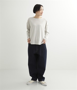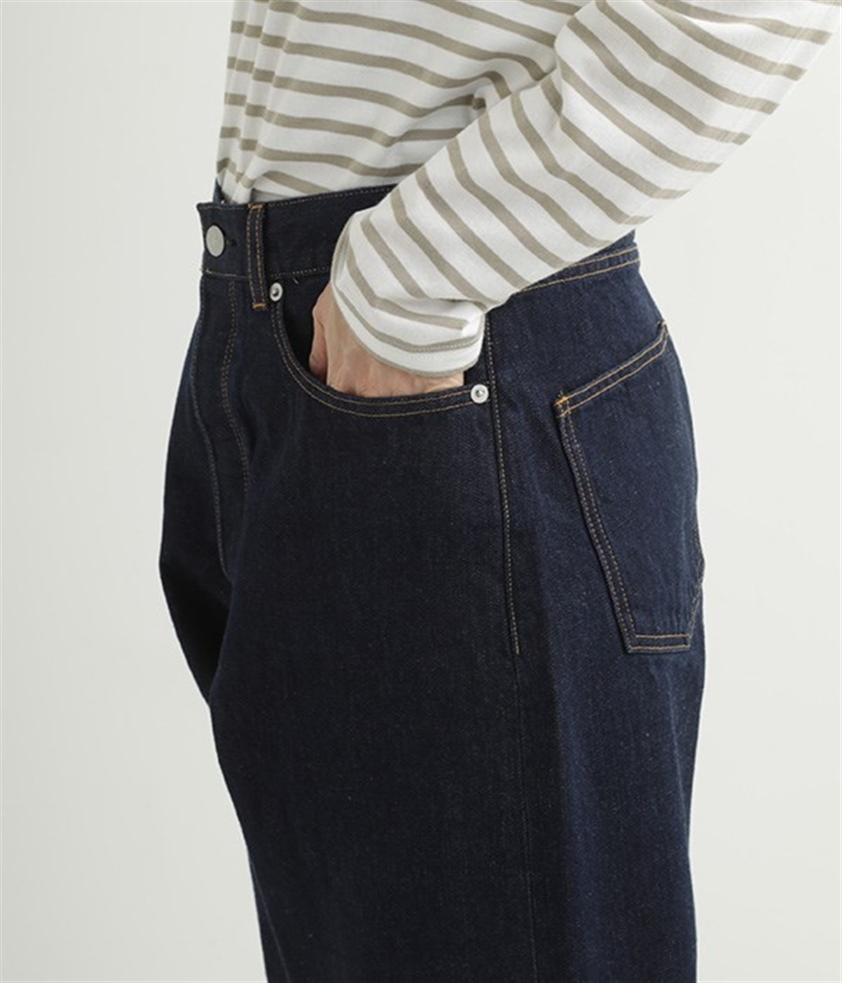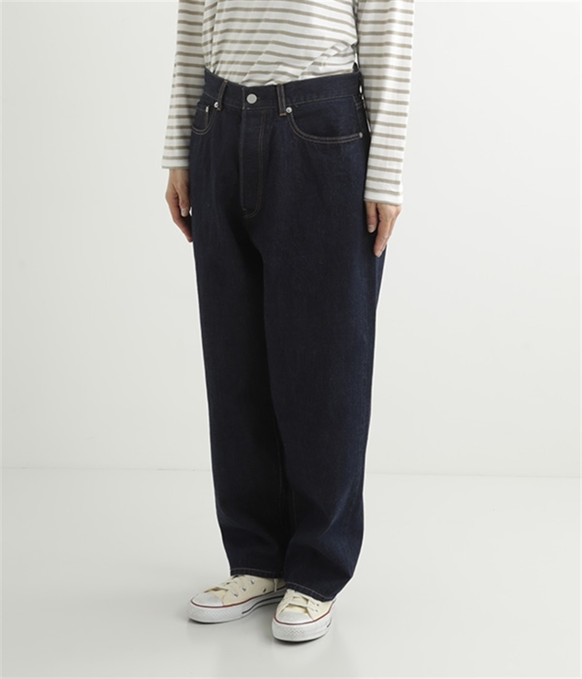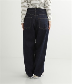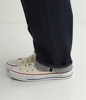 ルーズなシルエットがこなれた印象のデニムパンツです。インディゴ染めの深みのある色合いが美しく、はき続けるほどになじんでいく経年変化も楽しめます。5ポケットにフロントはボタンフライの本格的なディテールで、カジュアルな装いがワンランクアップ。折り返すとのぞく耳(生地の端)がロールアップした時のアクセントに。