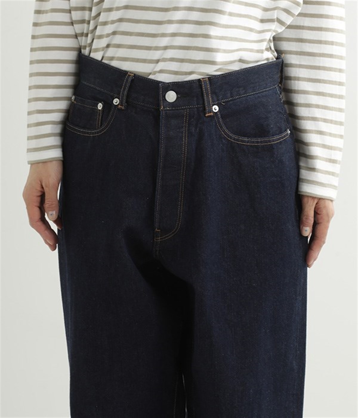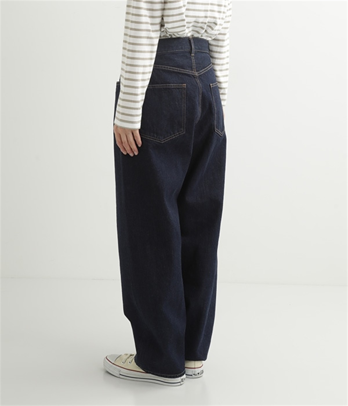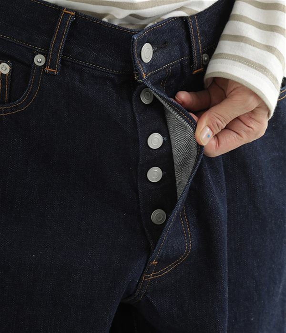ルーズなシルエットがこなれた印象のデニムパンツです。インディゴ染めの深みのある色合いが美しく、はき続けるほどになじんでいく経年変化も楽しめます。5ポケットにフロントはボタンフライの本格的なディテールで、カジュアルな装いがワンランクアップ。折り返すとのぞく耳(生地の端)がロールアップした時のアクセントに。