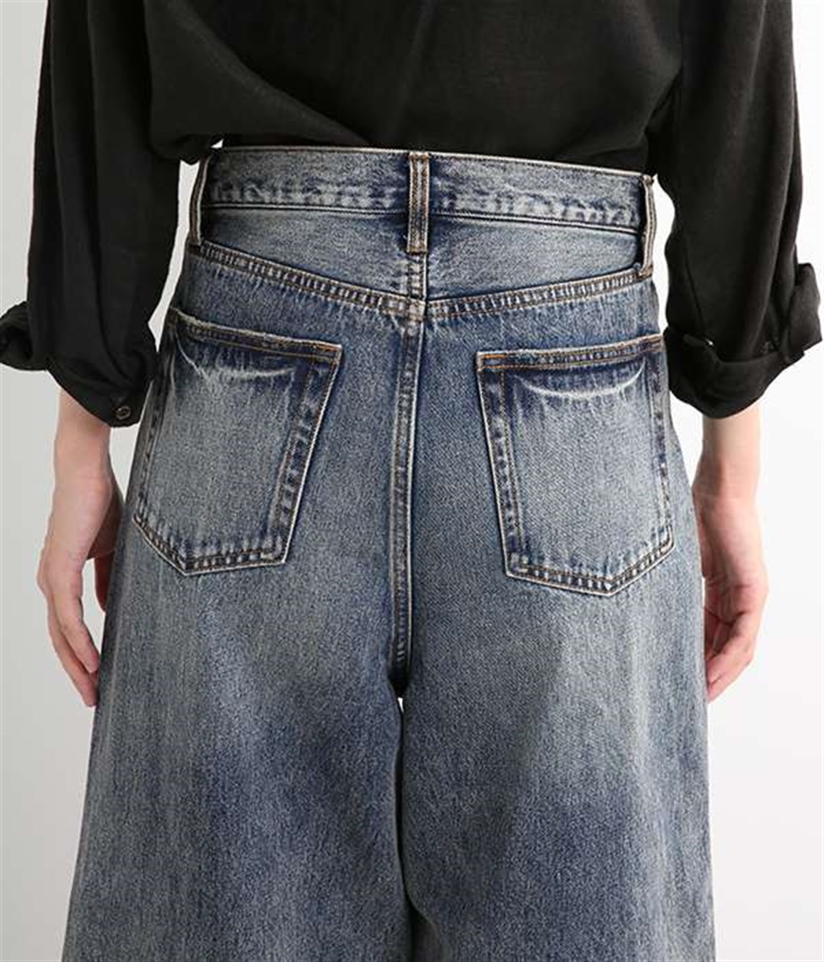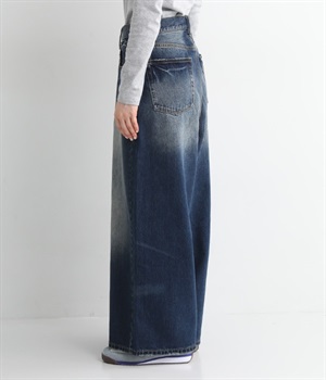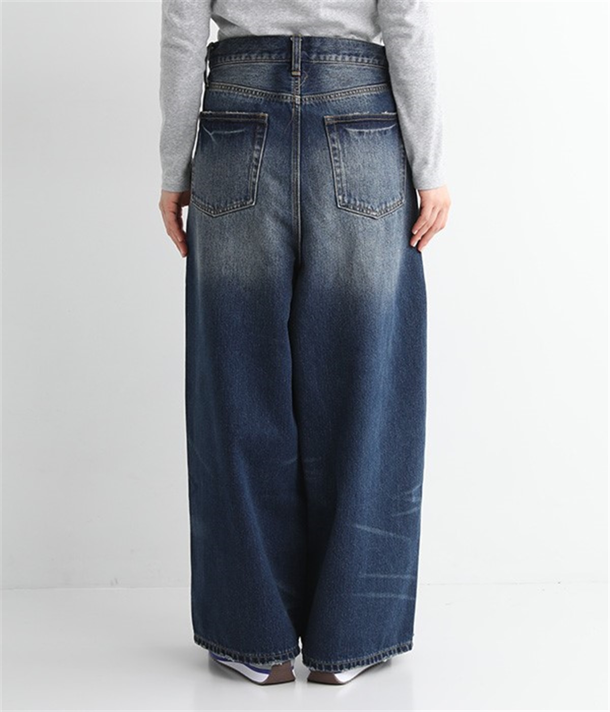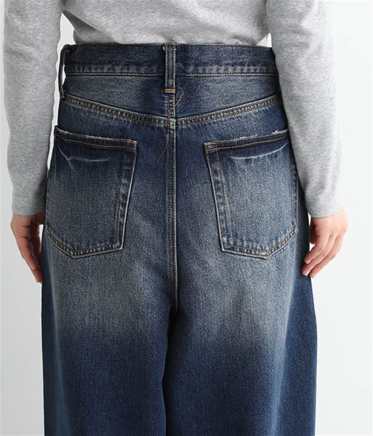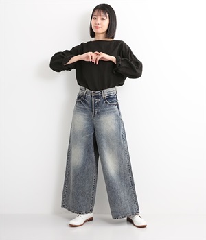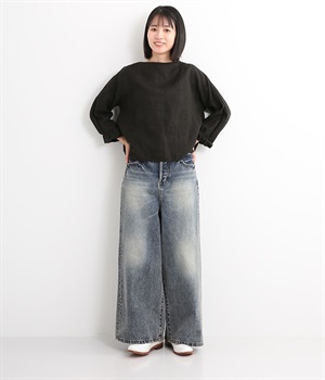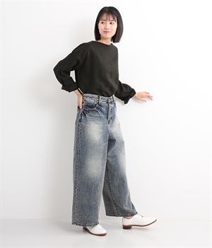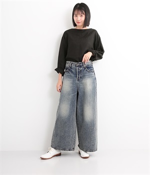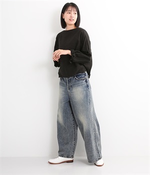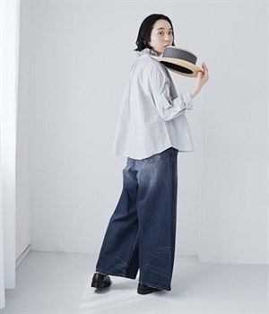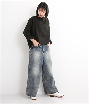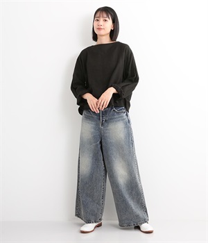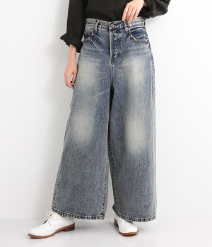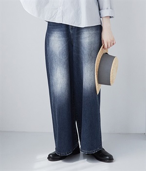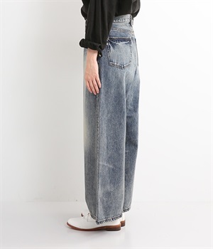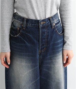 足のラインをすっぽりとおおうワイドシルエットが自慢のデニムパンツ。長年はきこんだようなリアルな色落ち感を出して、古着見えするのが特徴です。ポケット口や裾まわりには糸がわずかに露出したクラッシュ加工を施す細かな演出も。ナナメにはややストレッチをきかせて、足の動きにさりげなく順応してくれます。生地も地厚すぎないので季節を問わずに着用できるのが魅力です。