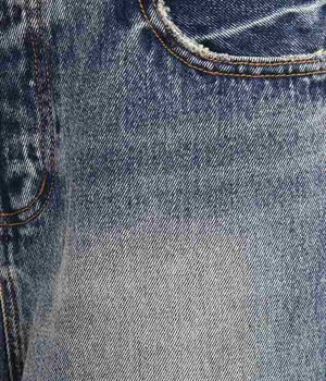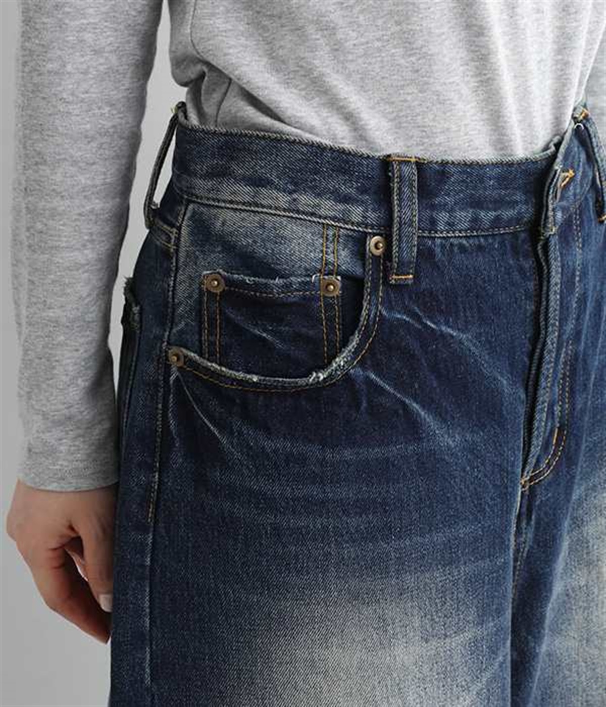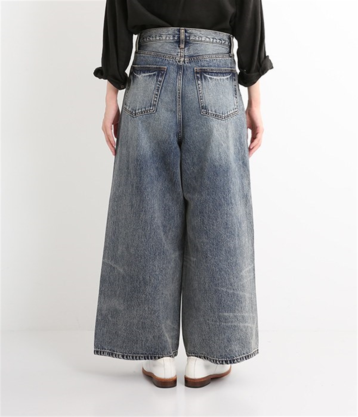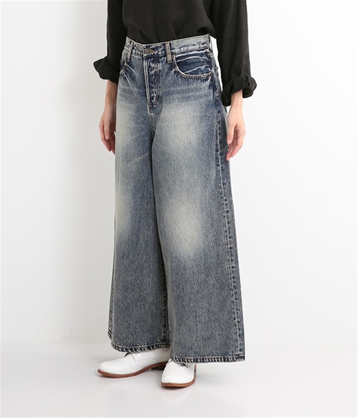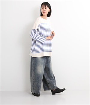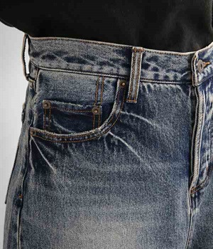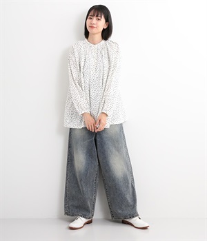 足のラインをすっぽりとおおうワイドシルエットが自慢のデニムパンツ。長年はきこんだようなリアルな色落ち感を出して、古着見えするのが特徴です。ポケット口や裾まわりには糸がわずかに露出したクラッシュ加工を施す細かな演出も。ナナメにはややストレッチをきかせて、足の動きにさりげなく順応してくれます。生地も地厚すぎないので季節を問わずに着用できるのが魅力です。