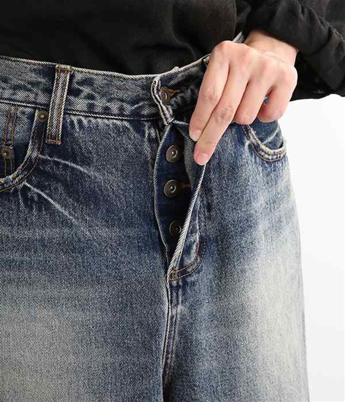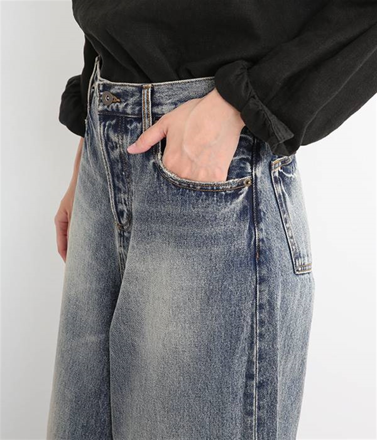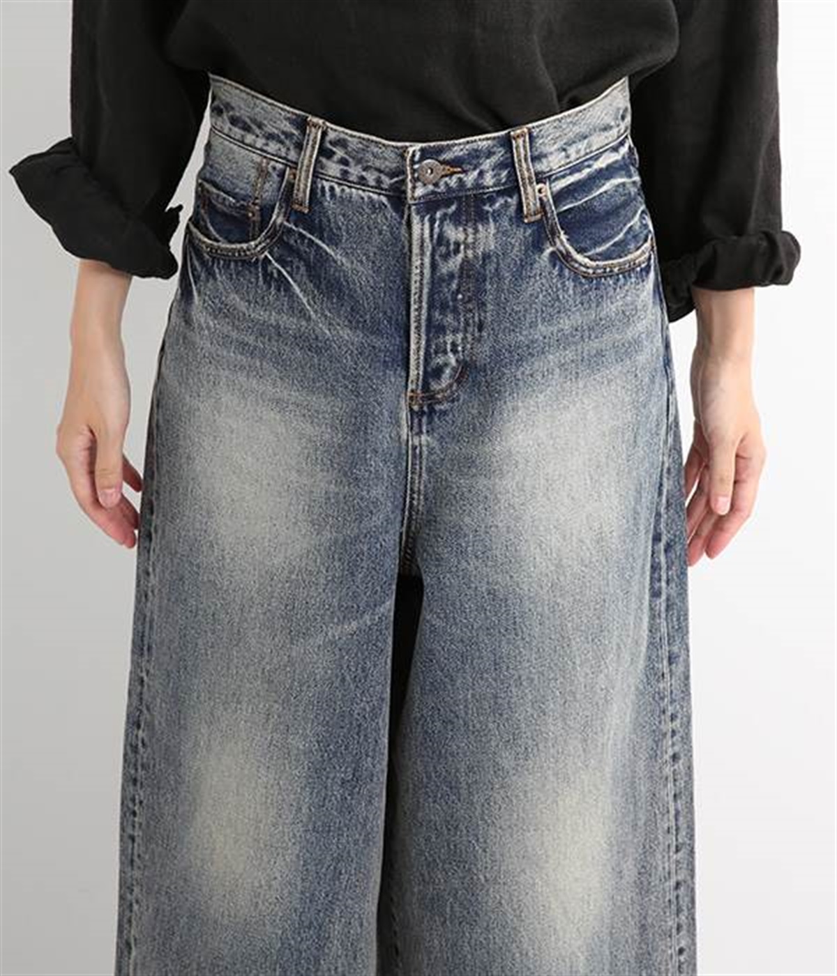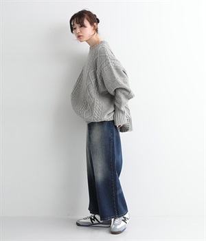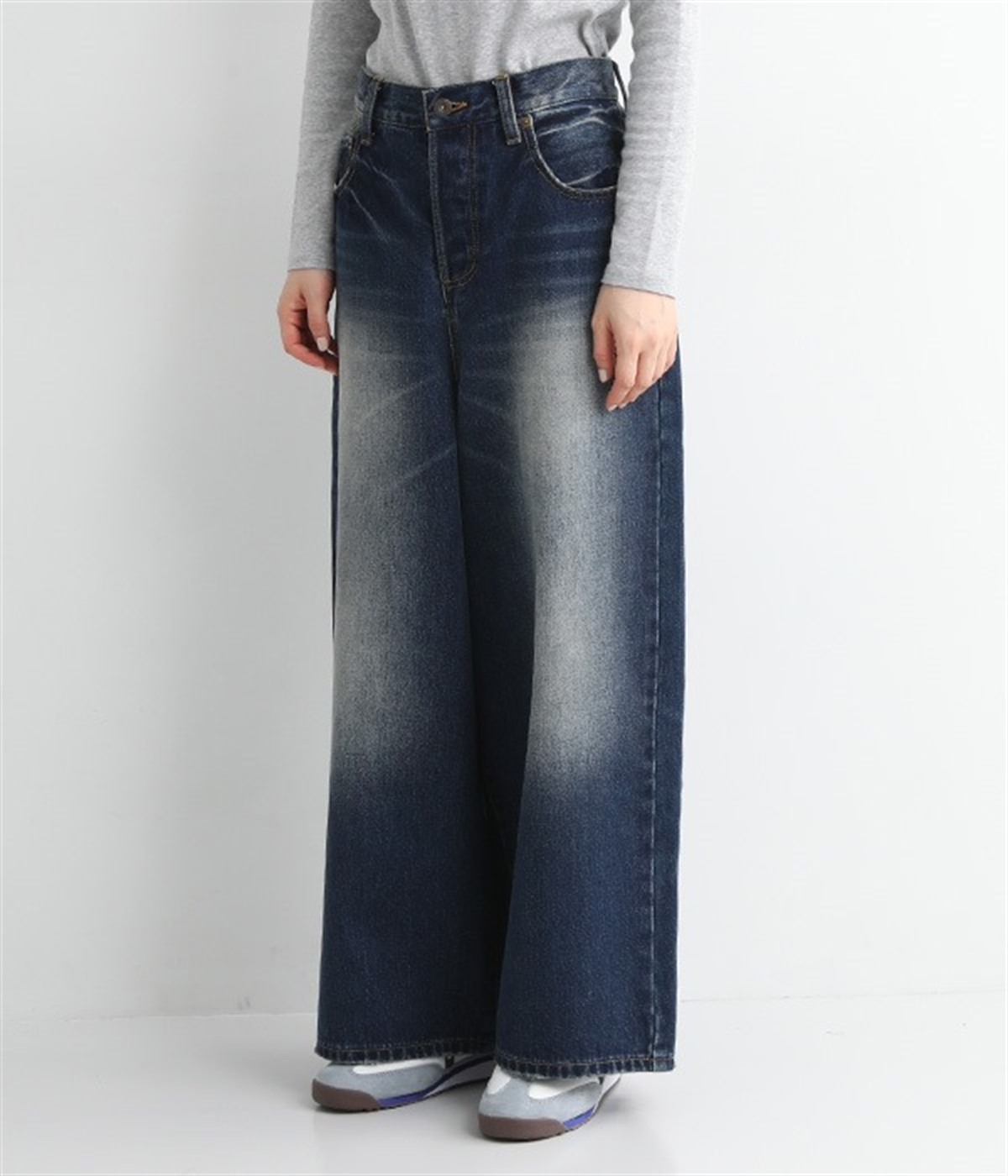足のラインをすっぽりとおおうワイドシルエットが自慢のデニムパンツ。長年はきこんだようなリアルな色落ち感を出して、古着見えするのが特徴です。ポケット口や裾まわりには糸がわずかに露出したクラッシュ加工を施す細かな演出も。ナナメにはややストレッチをきかせて、足の動きにさりげなく順応してくれます。生地も地厚すぎないので季節を問わずに着用できるのが魅力です。