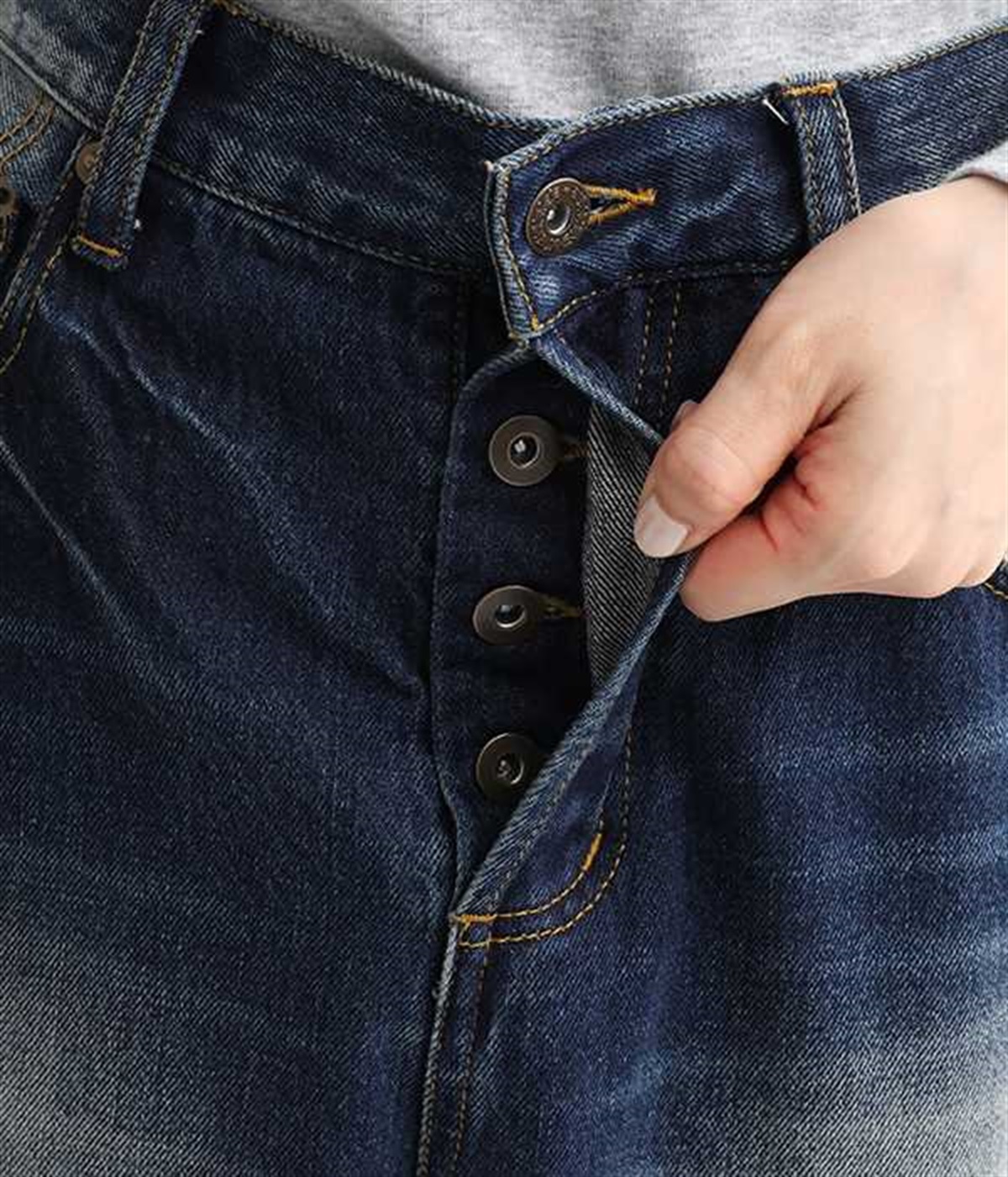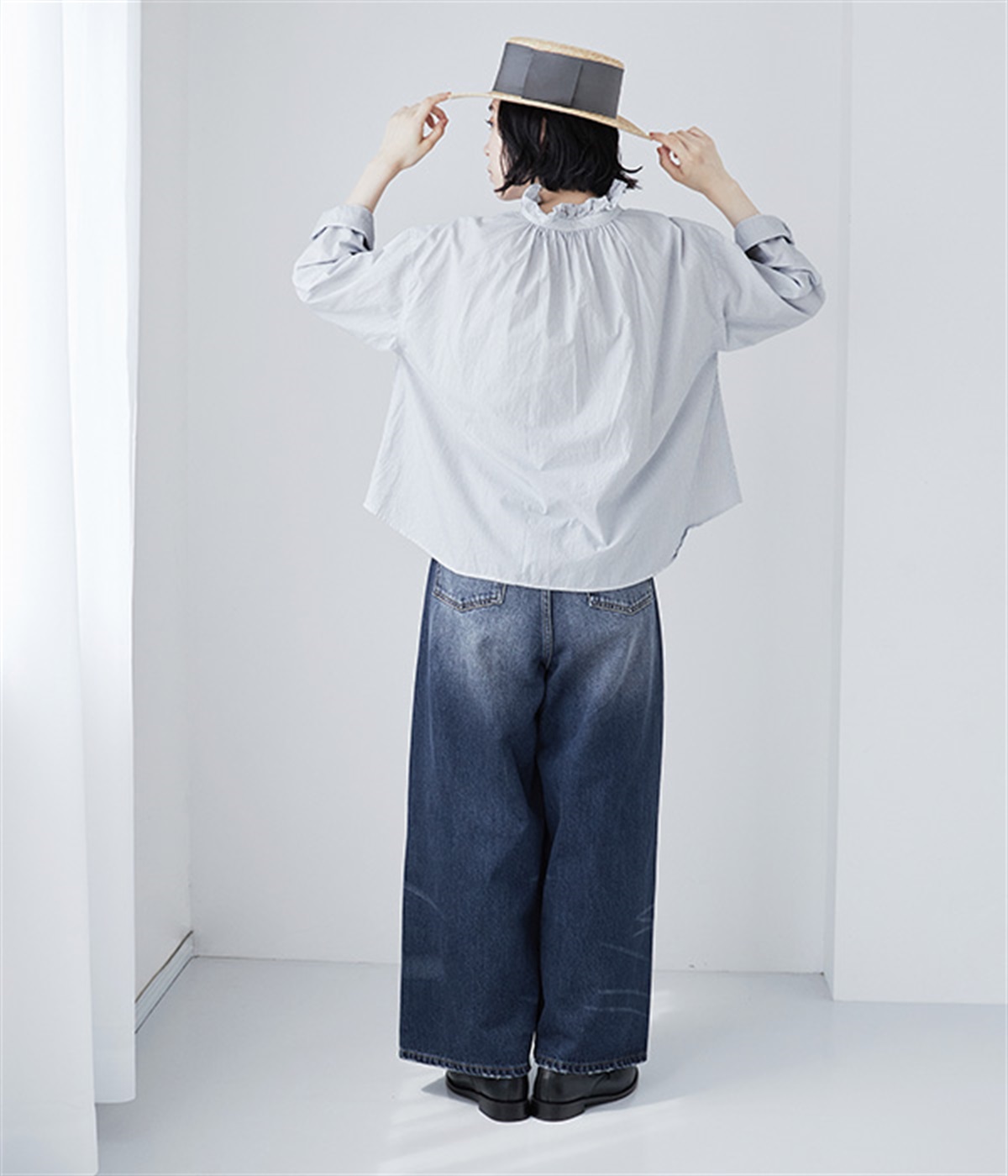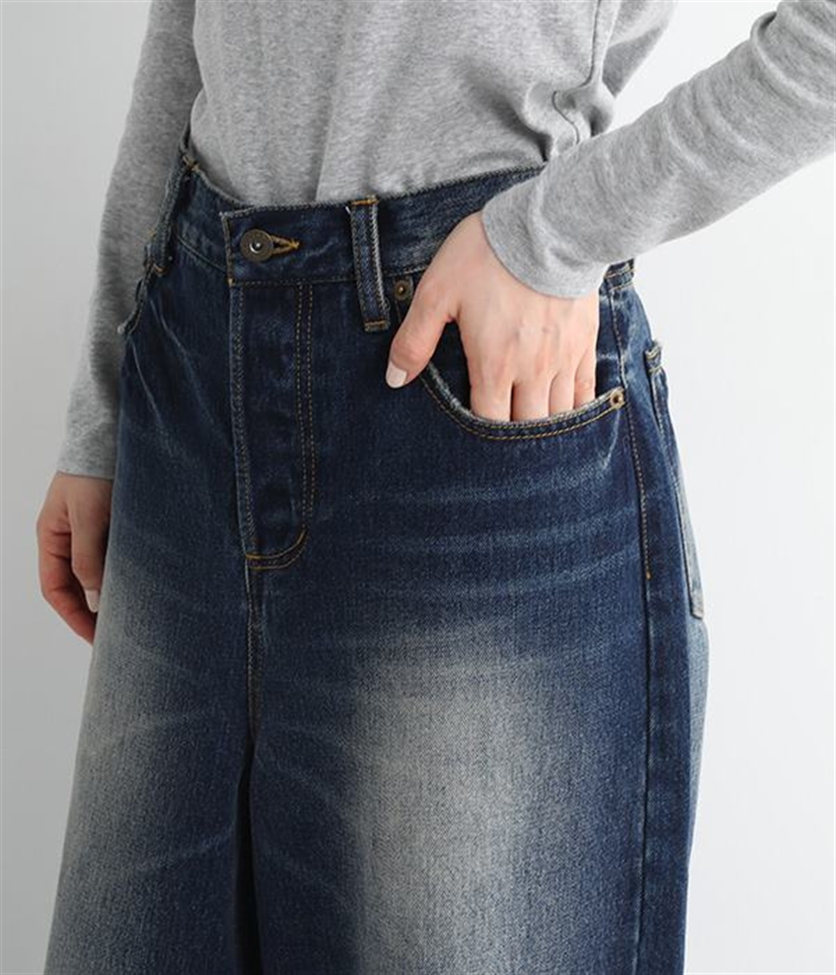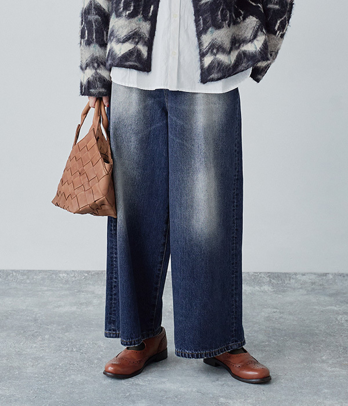 足のラインをすっぽりとおおうワイドシルエットが自慢のデニムパンツ。長年はきこんだようなリアルな色落ち感を出して、古着見えするのが特徴です。ポケット口や裾まわりには糸がわずかに露出したクラッシュ加工を施す細かな演出も。ナナメにはややストレッチをきかせて、足の動きにさりげなく順応してくれます。生地も地厚すぎないので季節を問わずに着用できるのが魅力です。