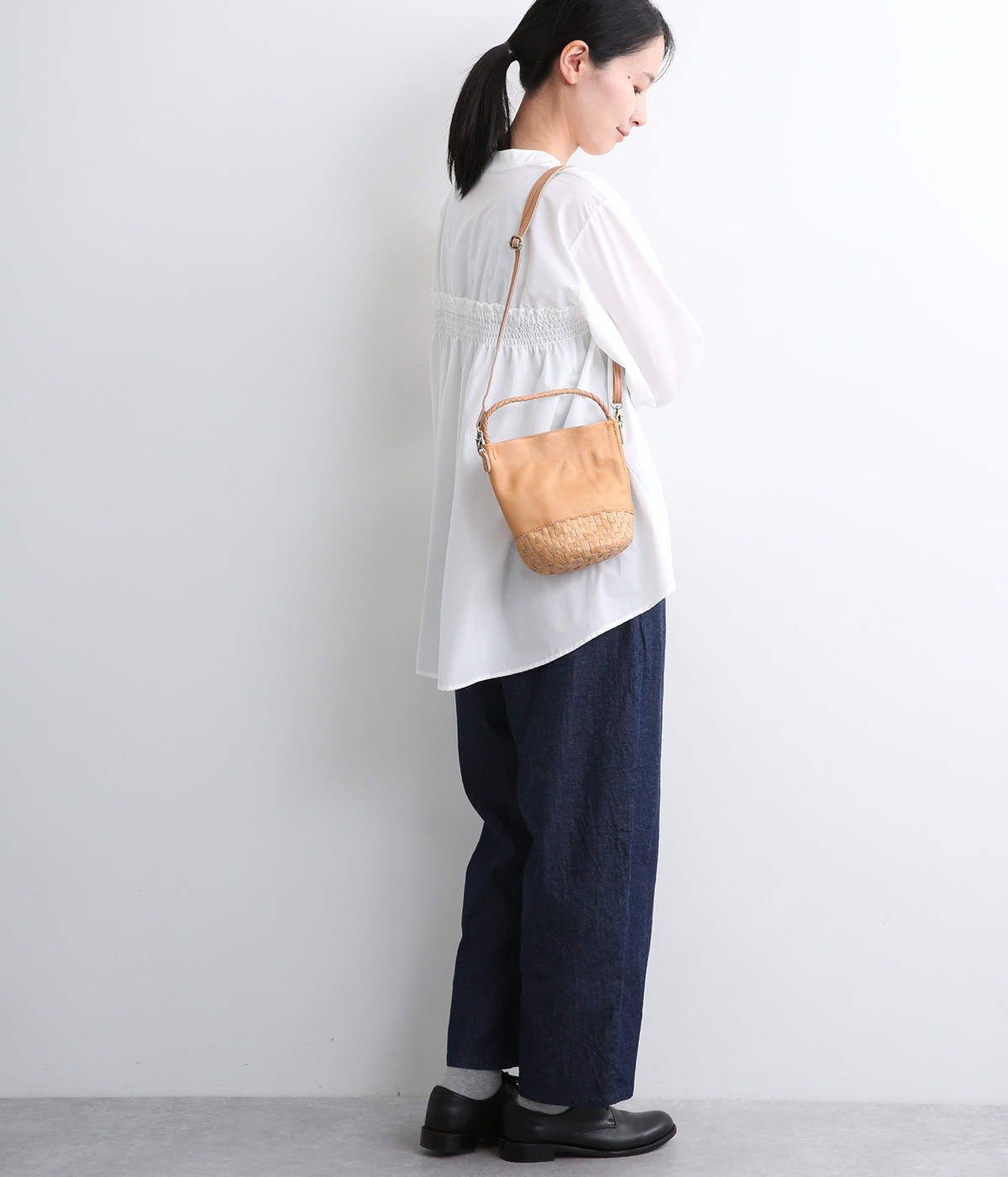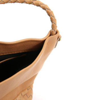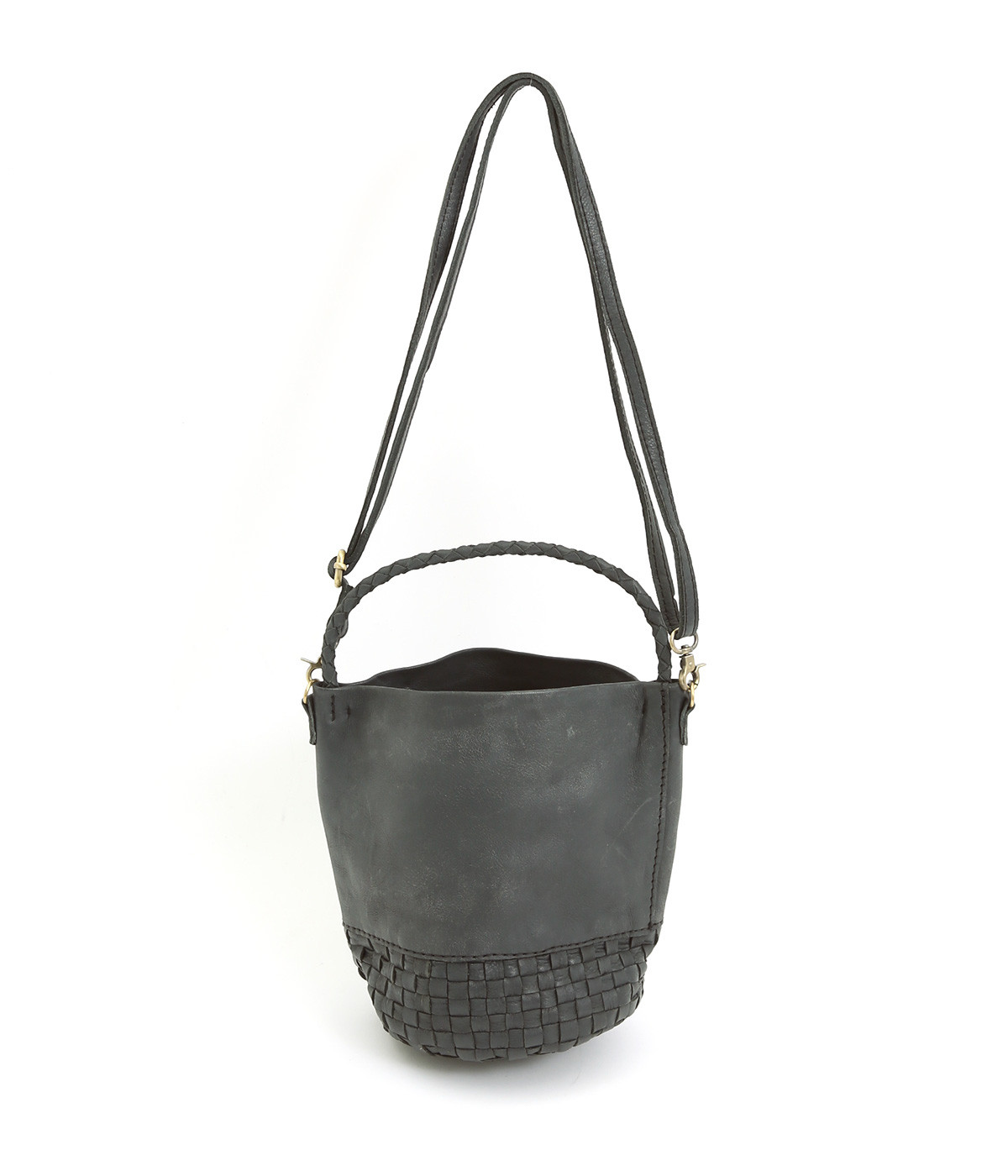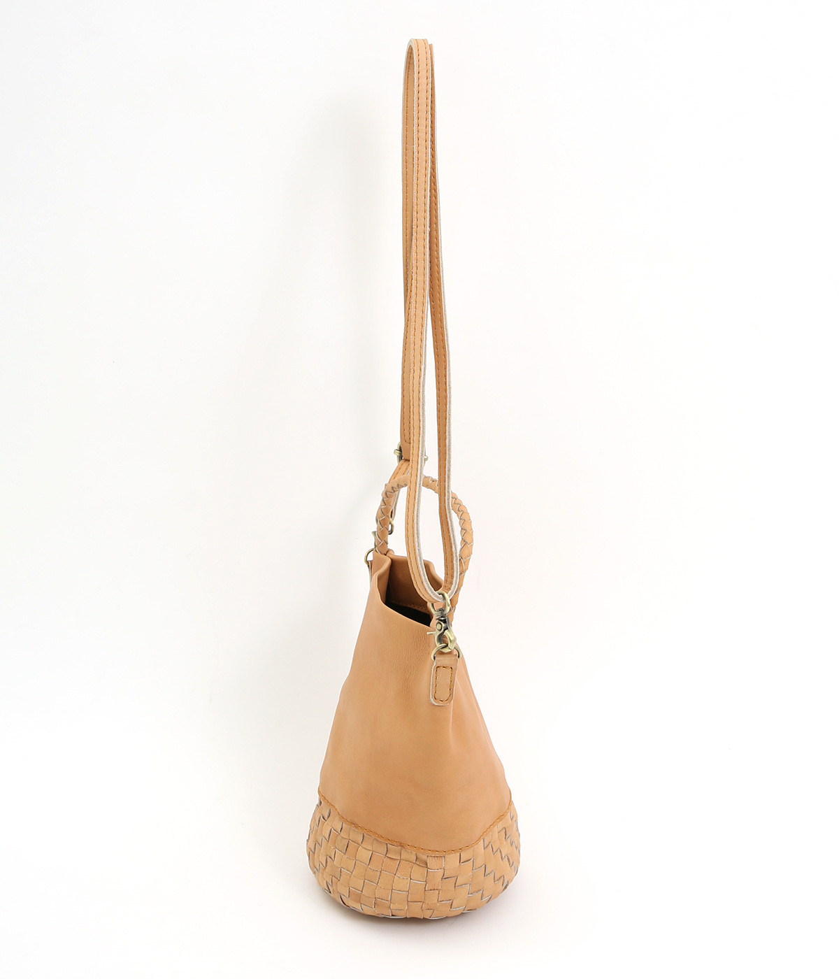 風合いを活かすために自然の染料で仕上げた天然皮革を使用。後染めによる自然な色ムラや豊かな表情が特徴です。手になじむ、やわらかな肌触りも魅力的。ラウンドの底はメッシュ編みで変化をプラスしています。
