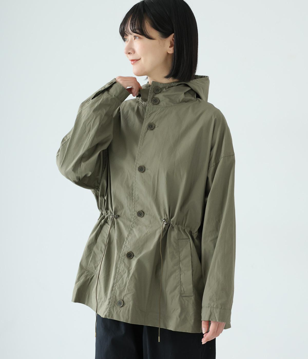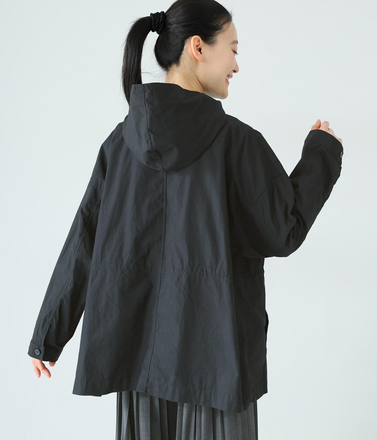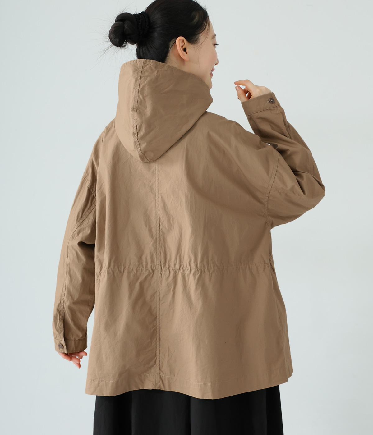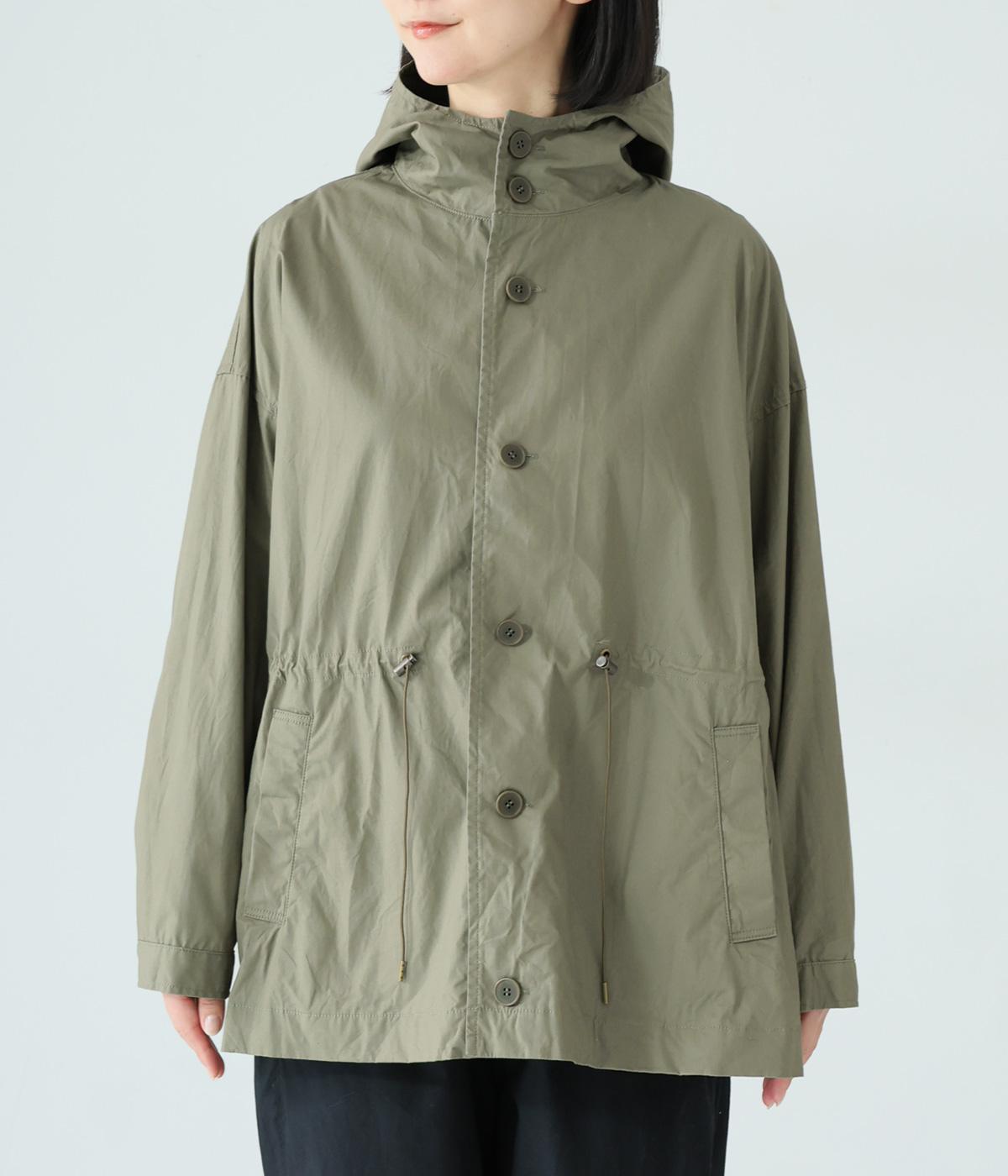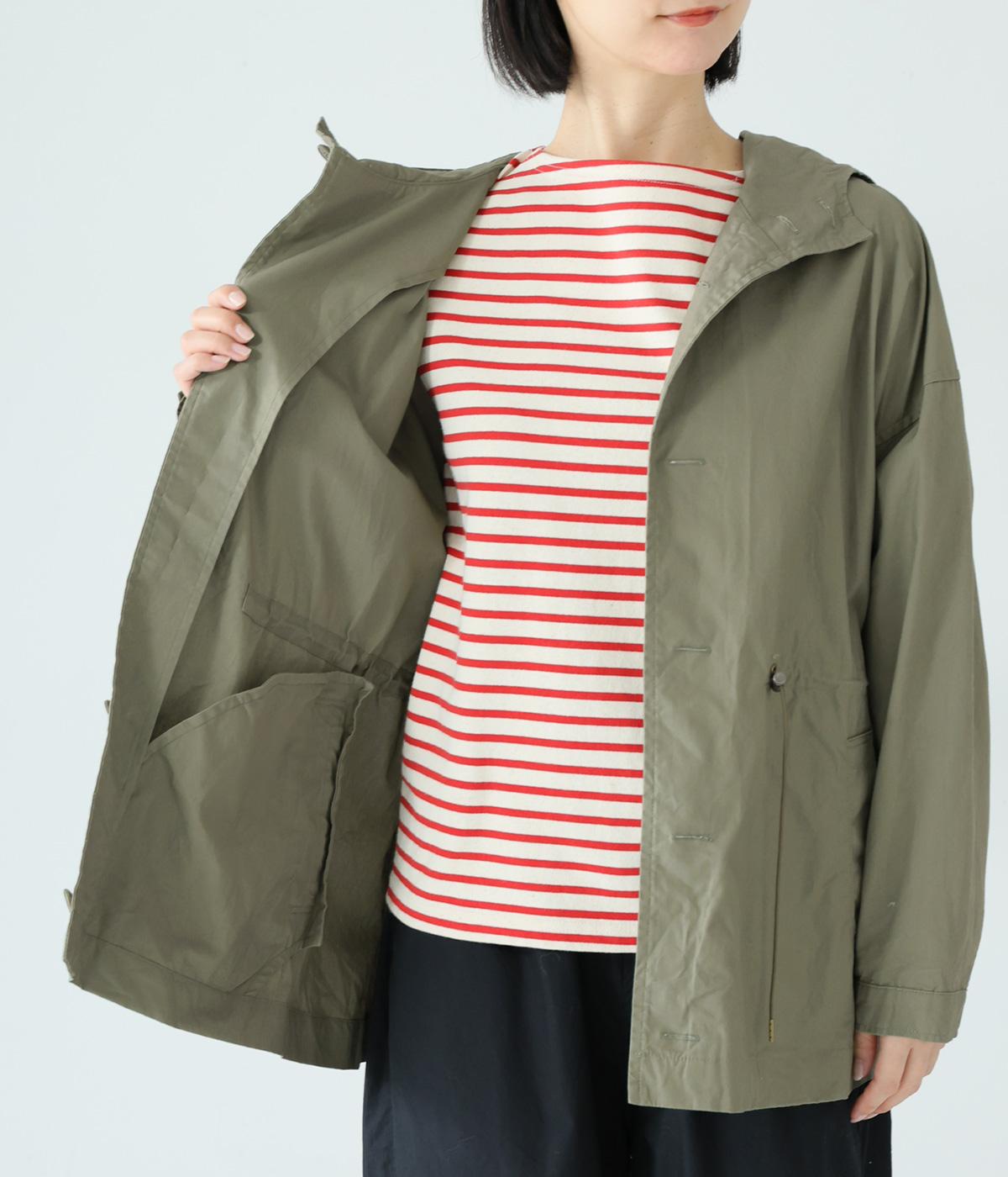日常にラフに羽織れるコットン素材のフードジャケット。高めのウエスト位置に入れたドローコードを絞ってシルエットをすっきりと見せることができます。立体感のあるフードが後ろ姿のポイントに。合わせる装いを選びにくい、ヒップにかかる絶妙な着丈もグッドです。