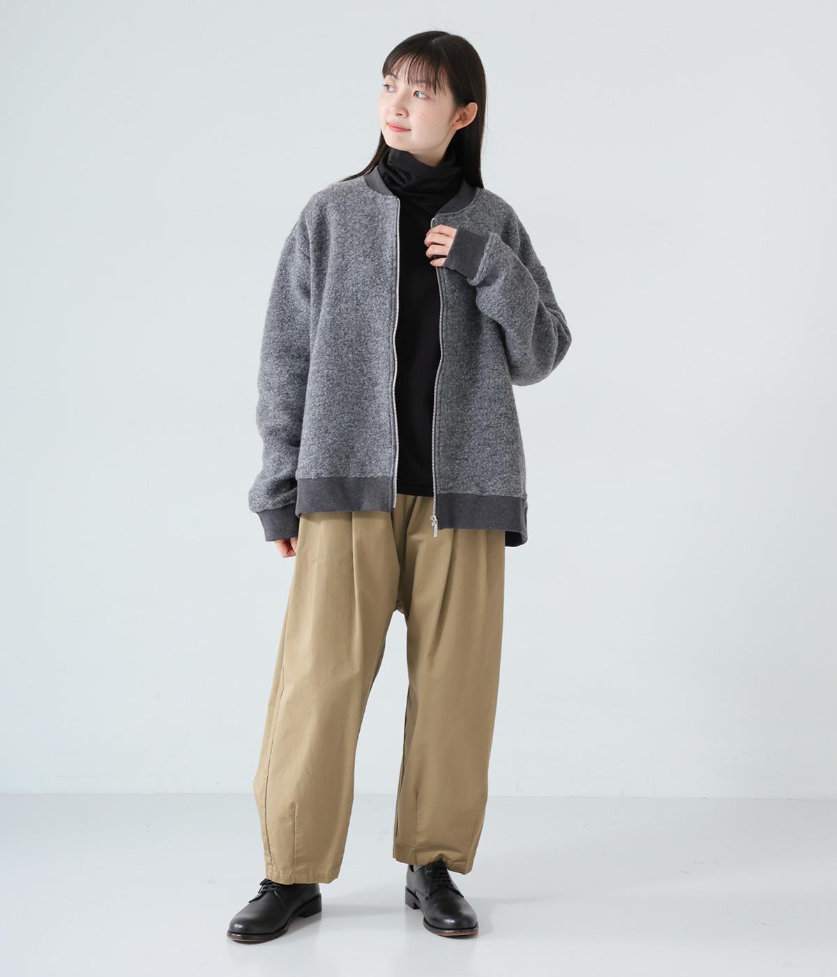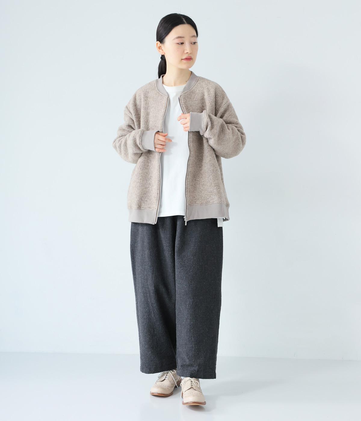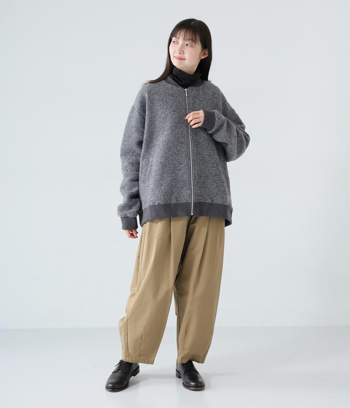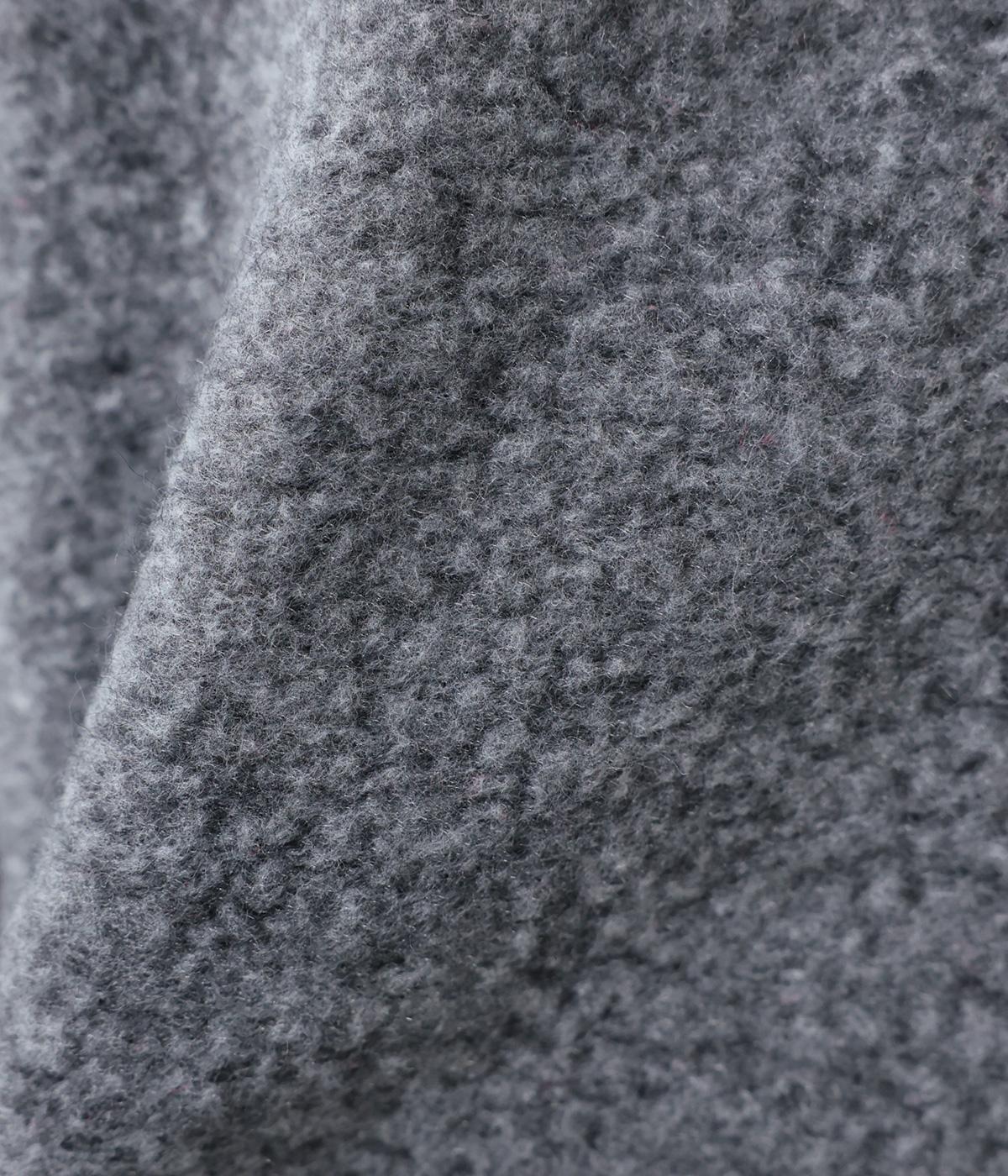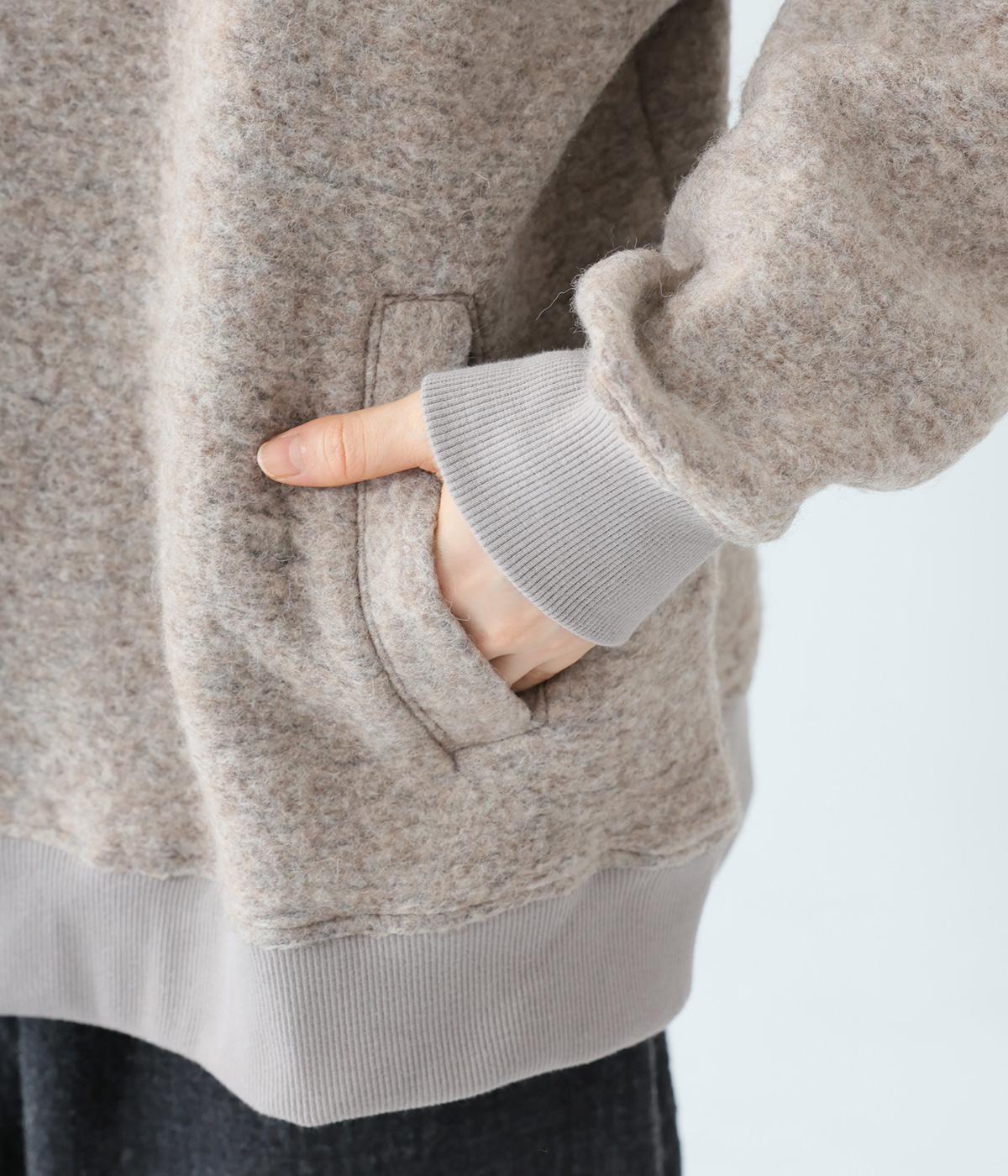 ふっくらとした起毛感が見た目にもあたたかみのあるウール混のプードルニット生地を使用しました。ボリュームは控えめなので、春先までロングシーズン活躍します。