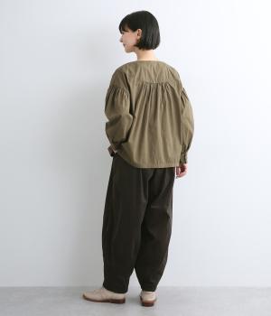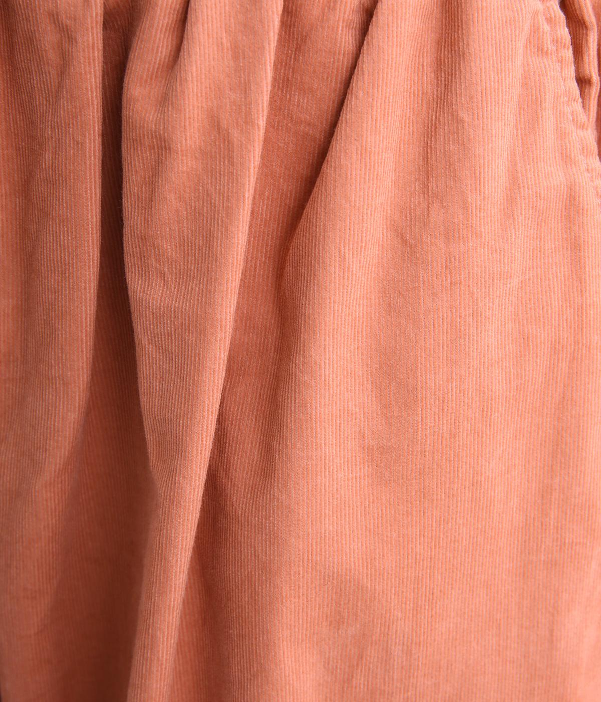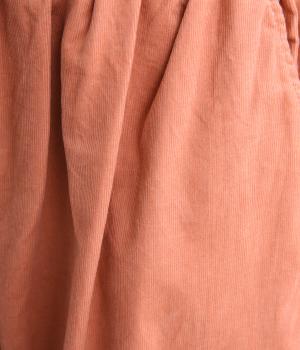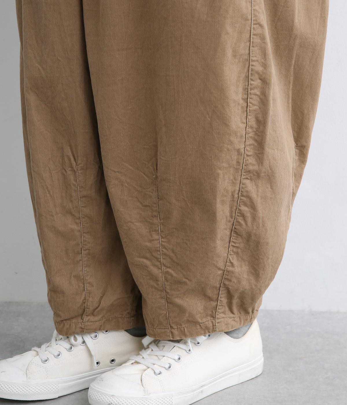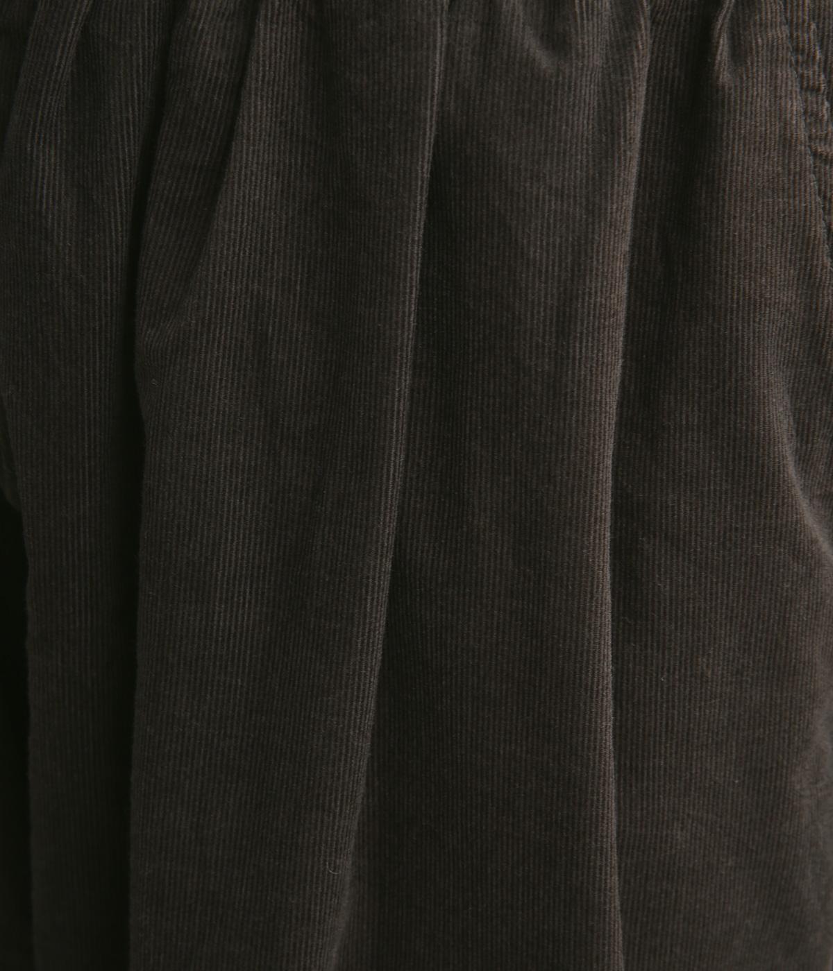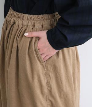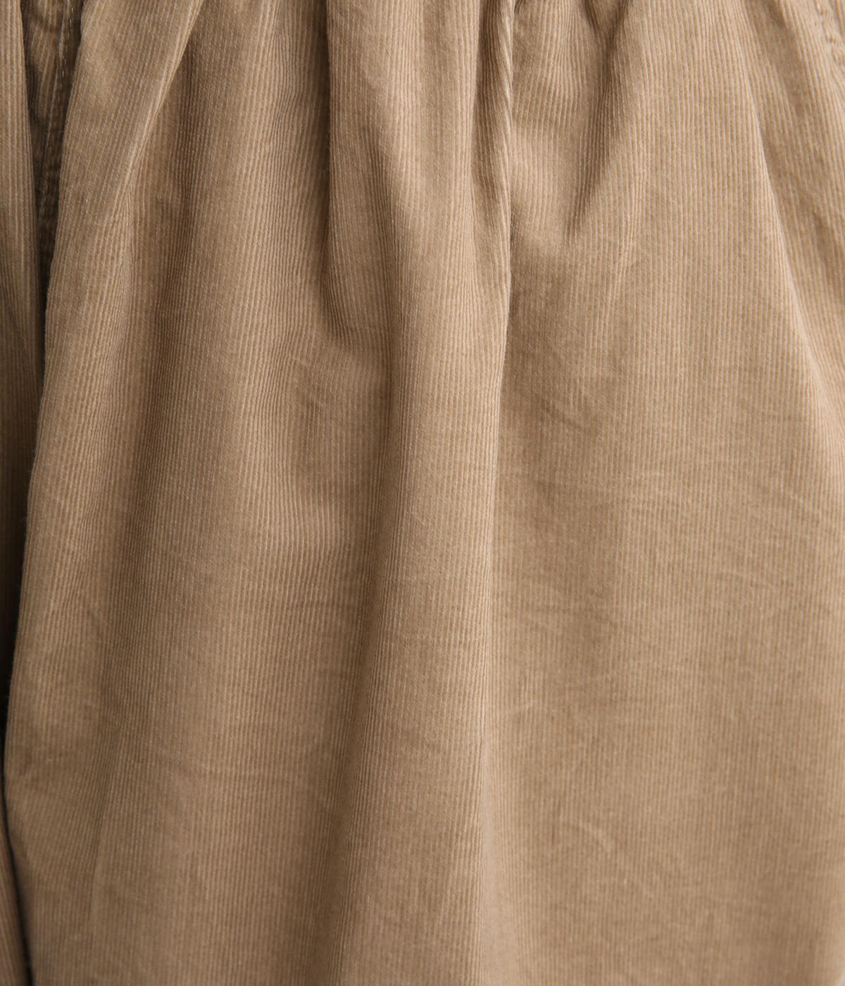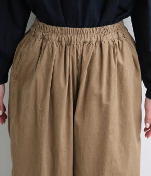 タテ方向に畝のあるコール天生地を使用しています。独特のあたたかみや光沢感のある表情が特徴で存在感があります。生地自体は薄めの中厚手なのでデイリーに穿きやすい生地感です。