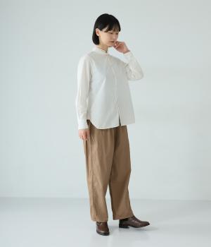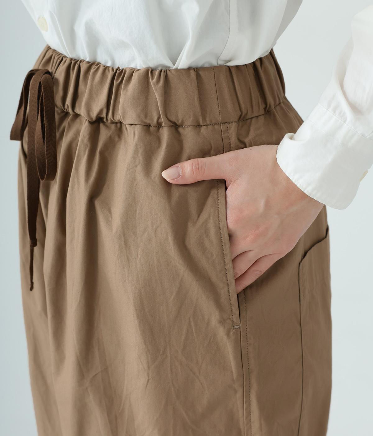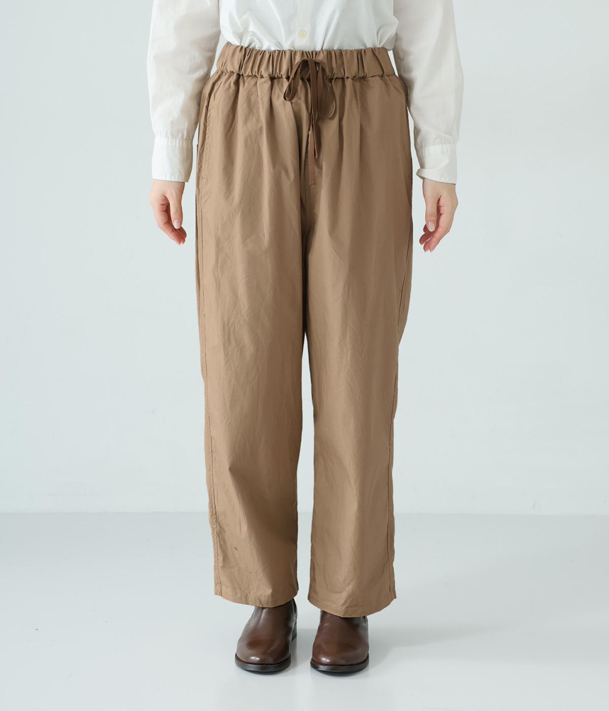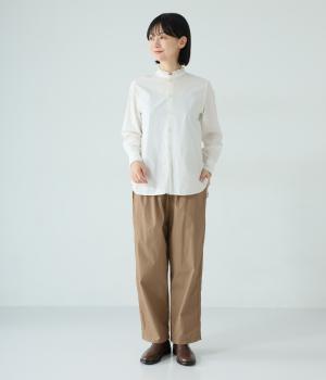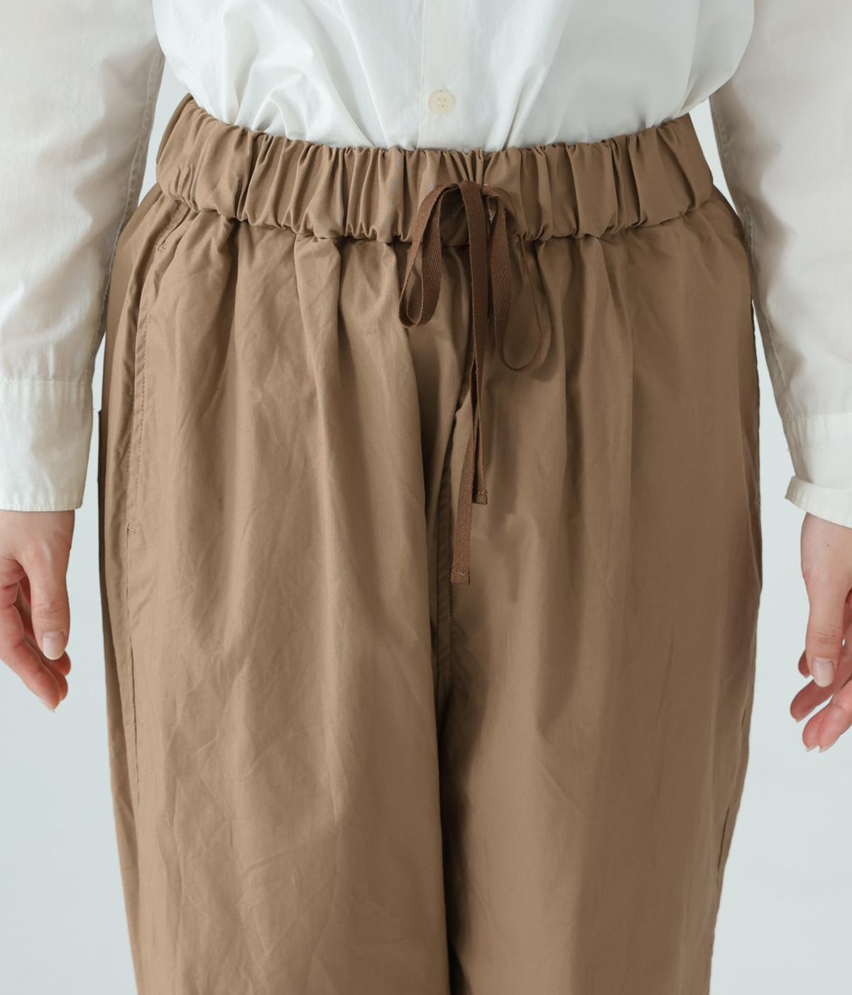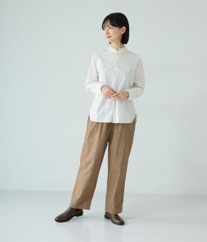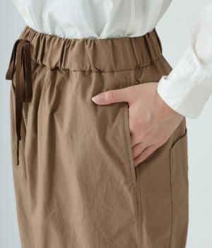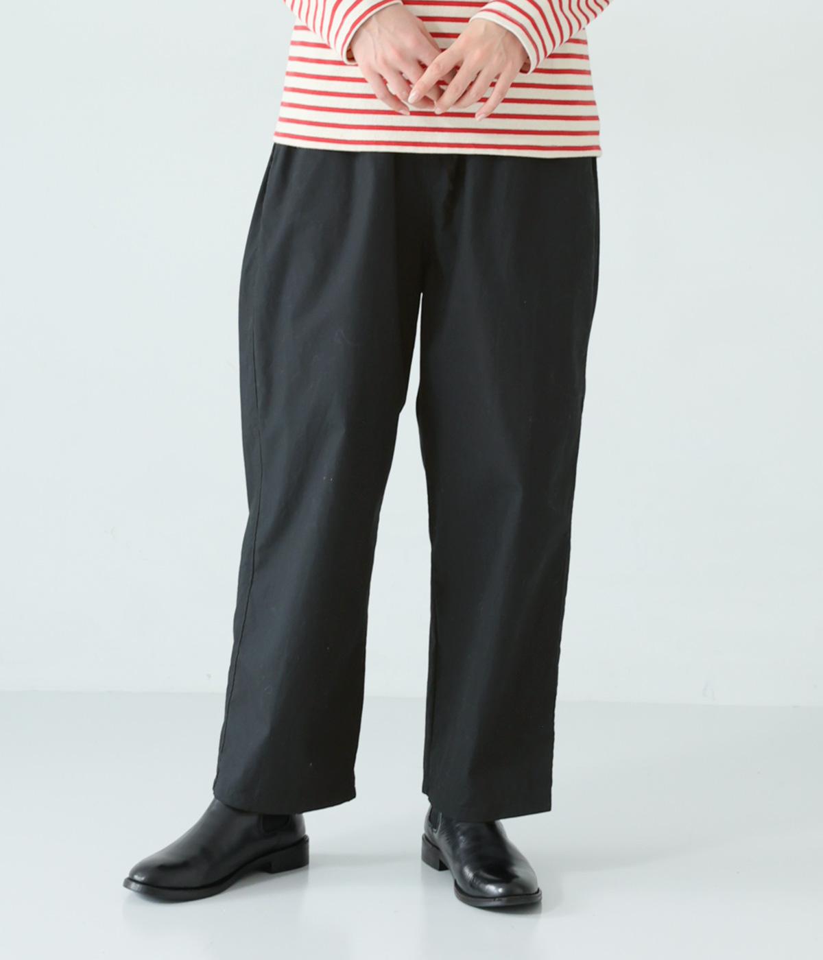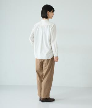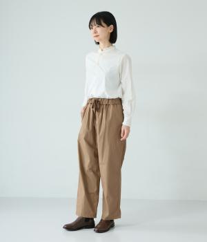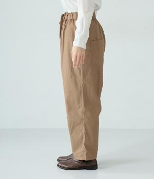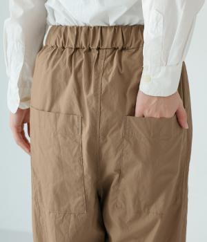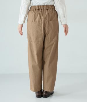 裾に向かって緩やかに細くし、らくなはき心地とすっきり見えを両立したパンツ。大きなヒップポケットをカジュアルなアクセントにしました。ウエストはゴムの外側に紐を通してフィット感をアップ。デイリーに着まわせて、長く愛用できるシンプルな一本です。