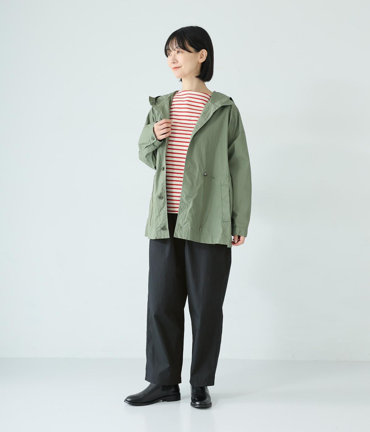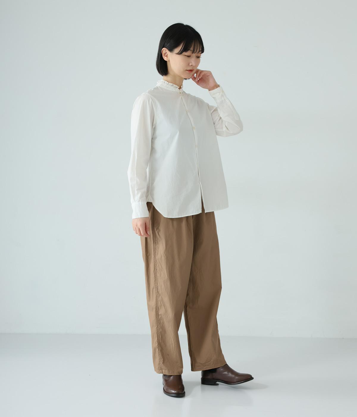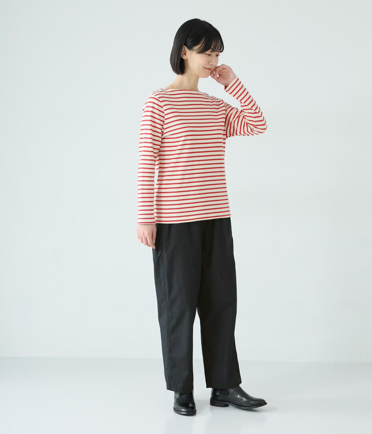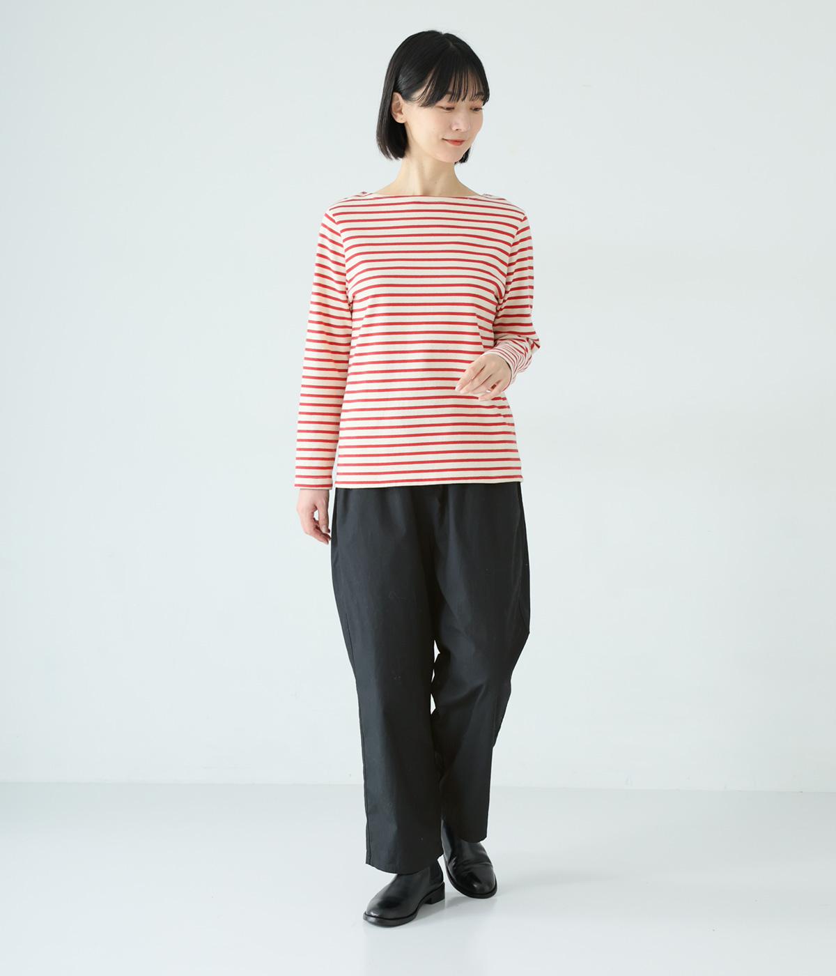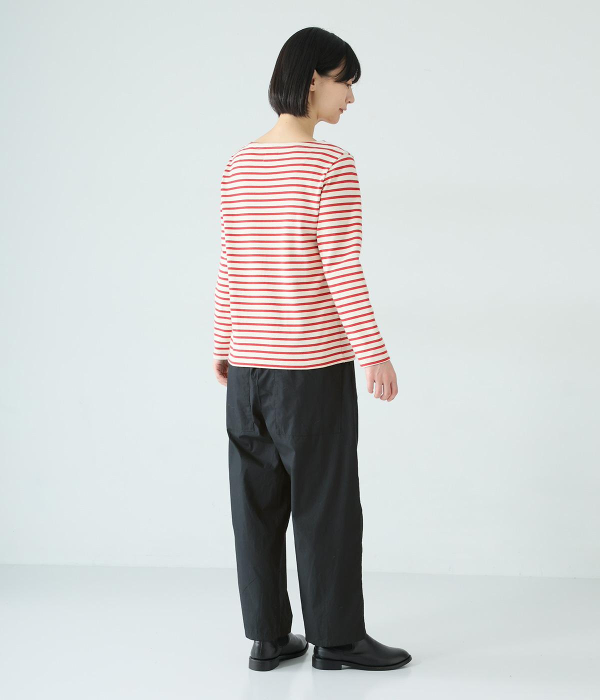 裾に向かって緩やかに細くし、らくなはき心地とすっきり見えを両立したパンツ。大きなヒップポケットをカジュアルなアクセントにしました。ウエストはゴムの外側に紐を通してフィット感をアップ。デイリーに着まわせて、長く愛用できるシンプルな一本です。
