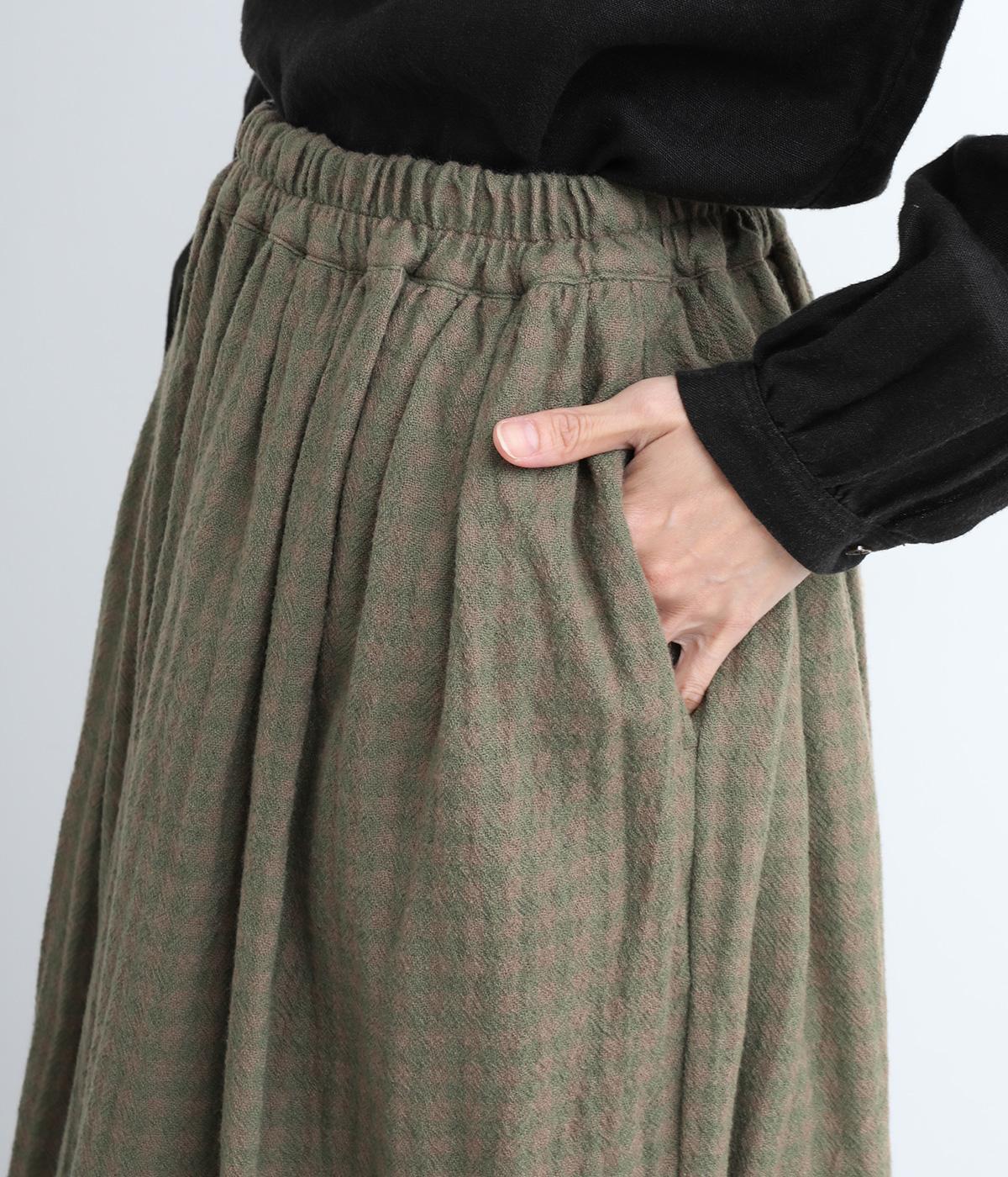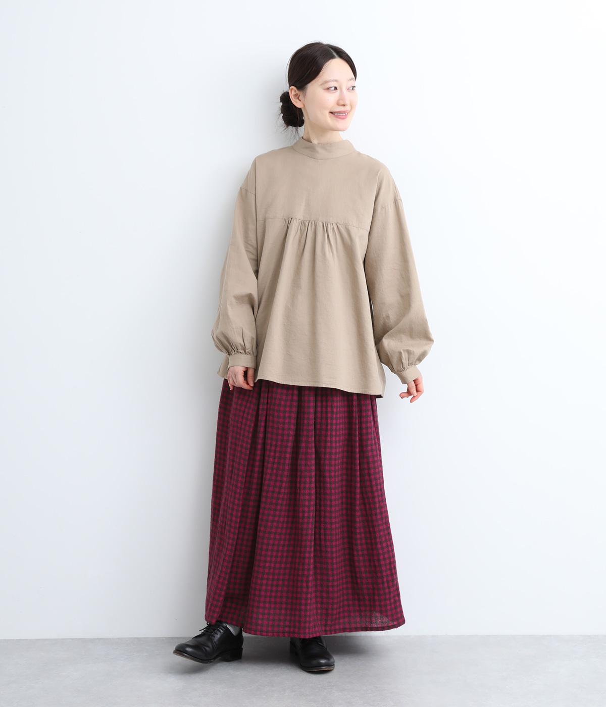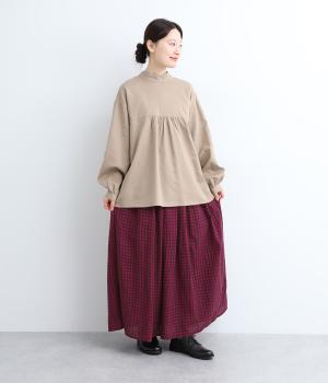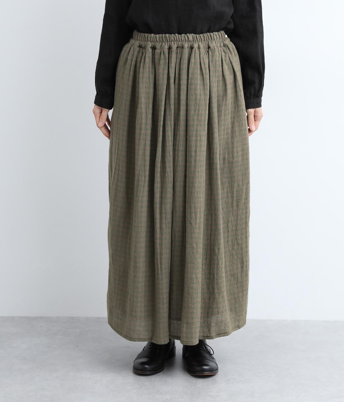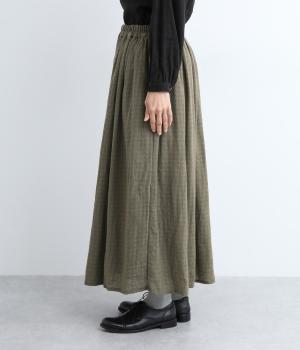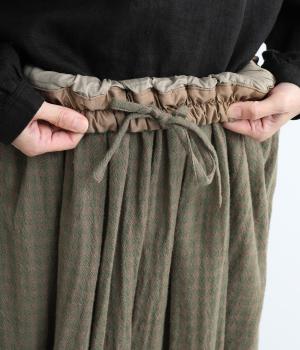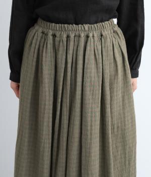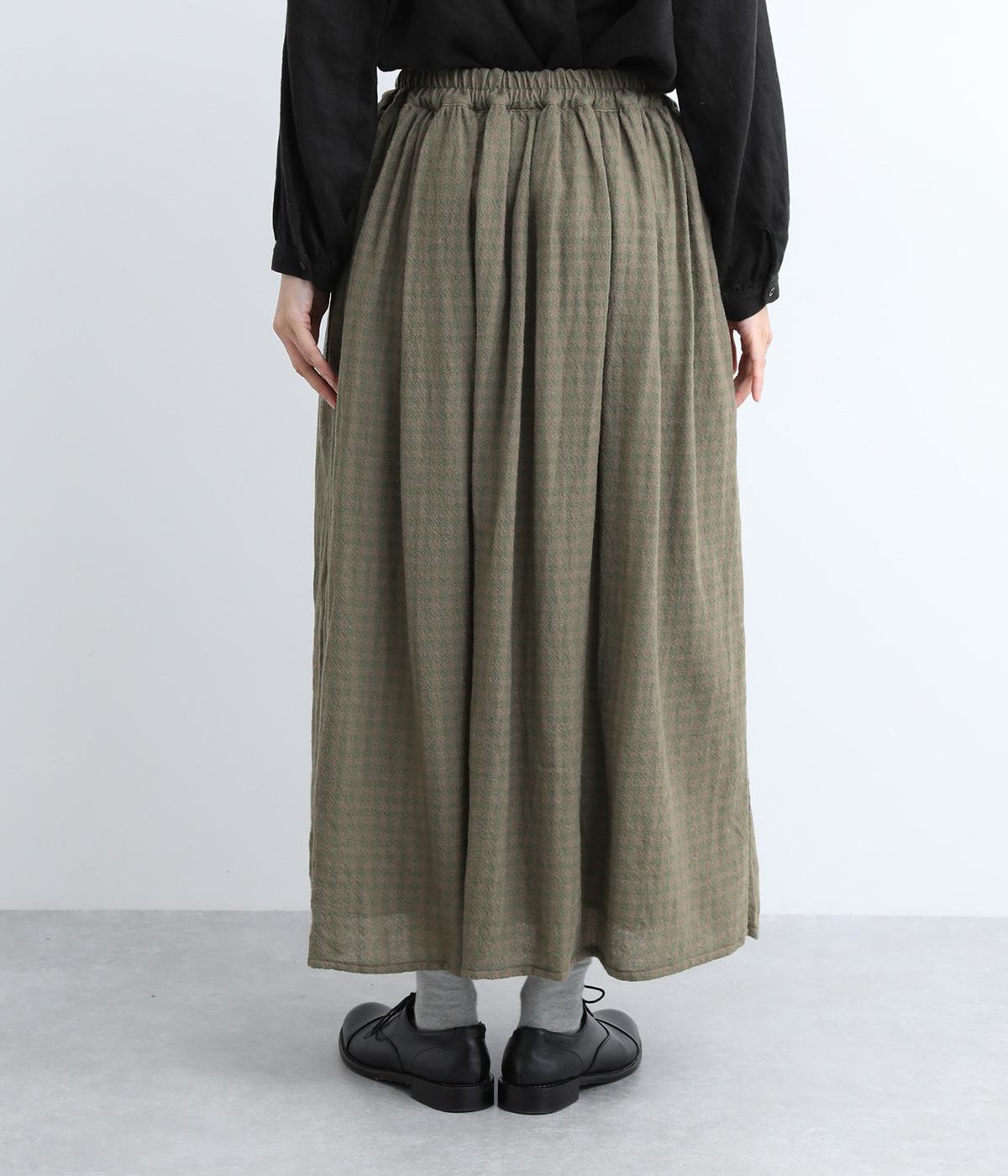 雰囲気のいい起毛生地にチェック柄がアイキャッチになります。シンプルなギャザーデザインでスタイリングしやすく、ロング丈とウール素材で大人顔に。ウエストはぐるりとゴムを入れたリラックスタイプで、微調整できる内紐入りです。