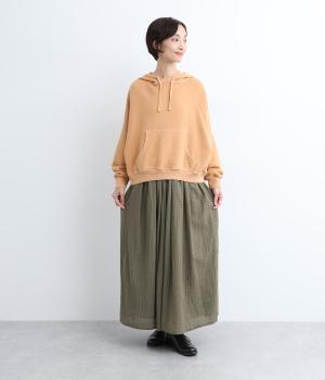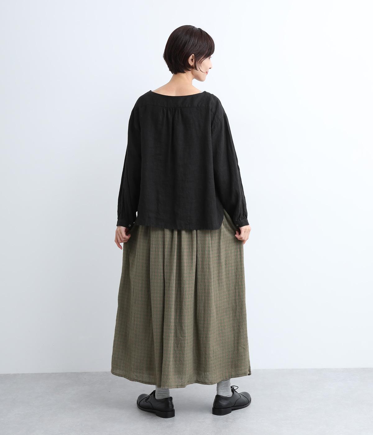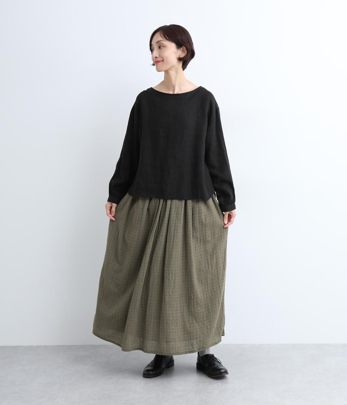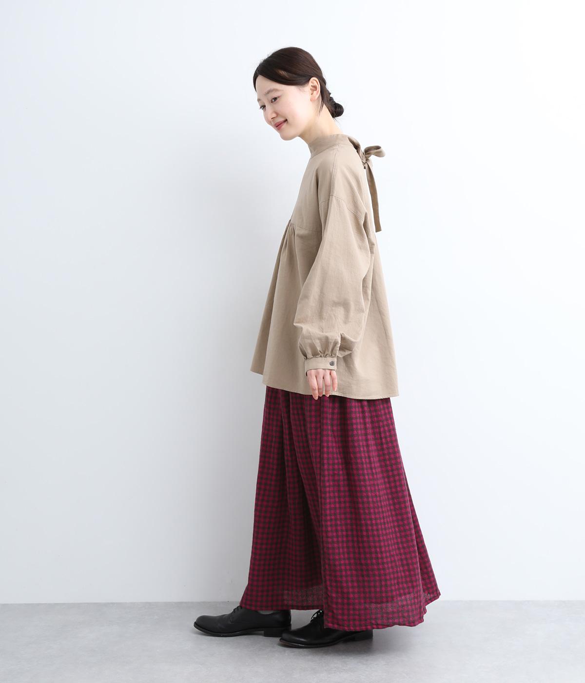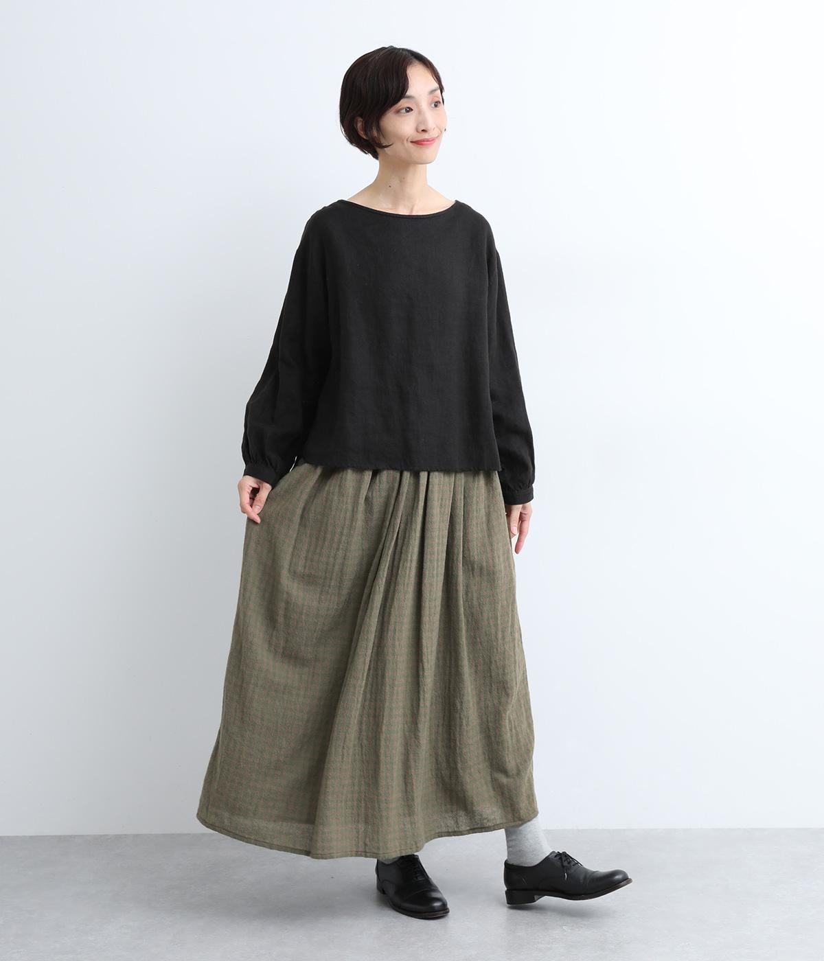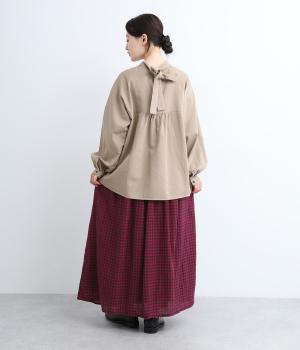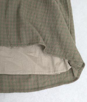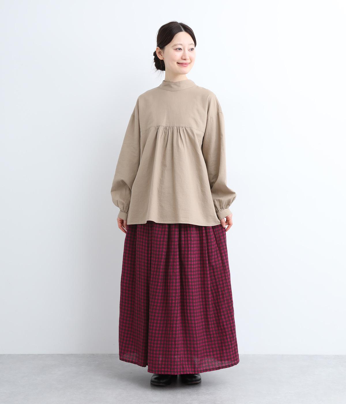 雰囲気のいい起毛生地にチェック柄がアイキャッチになります。シンプルなギャザーデザインでスタイリングしやすく、ロング丈とウール素材で大人顔に。ウエストはぐるりとゴムを入れたリラックスタイプで、微調整できる内紐入りです。