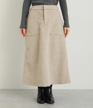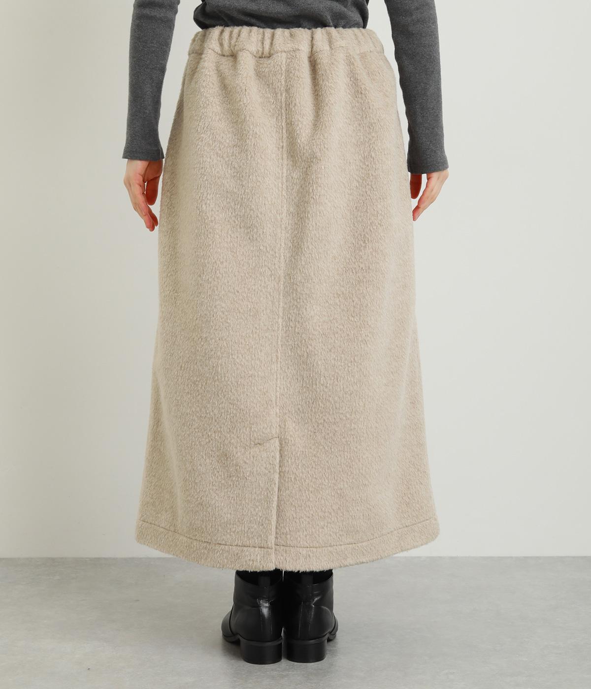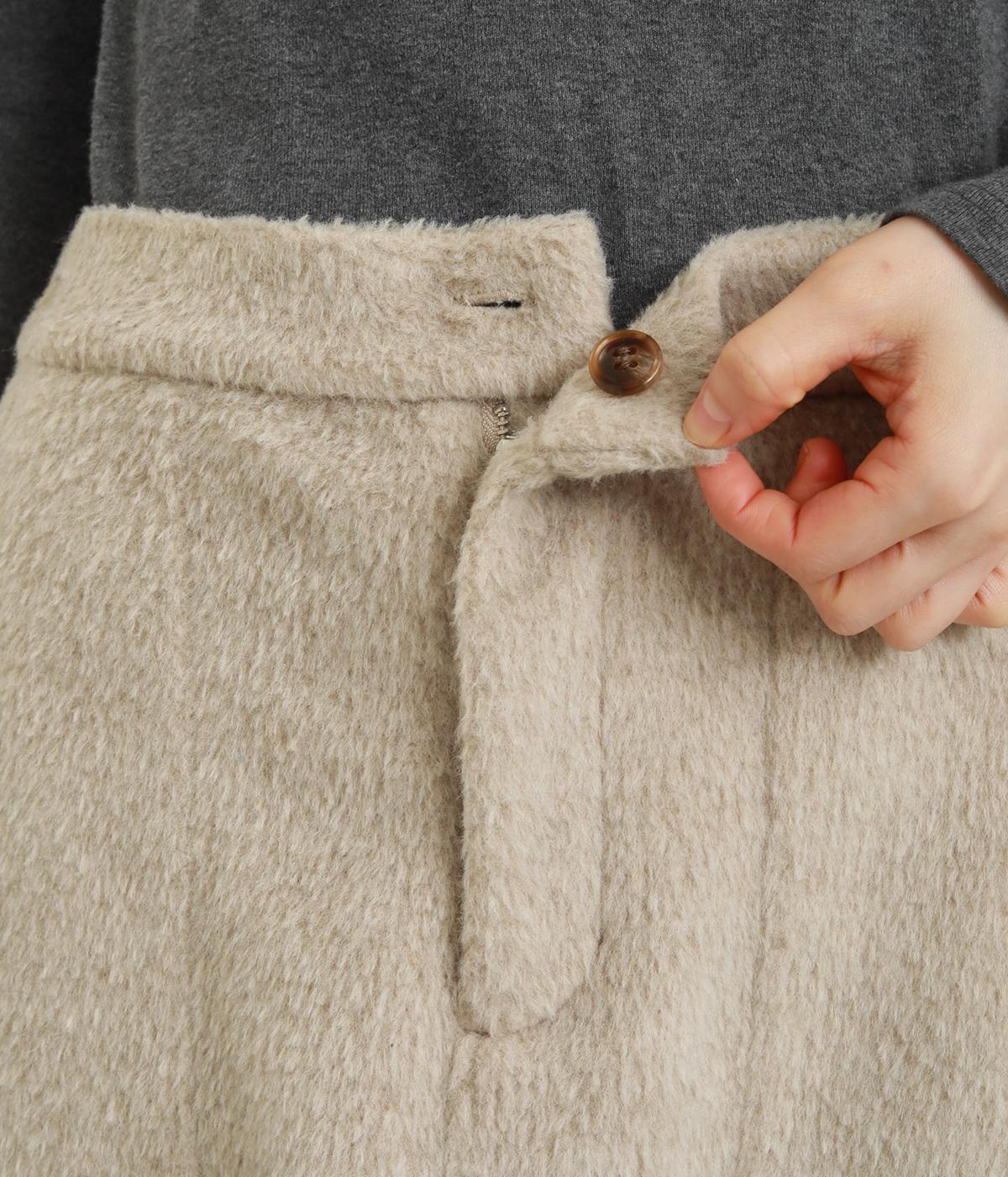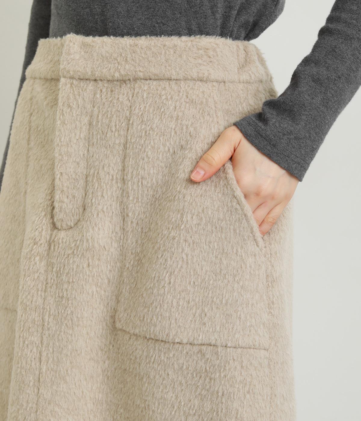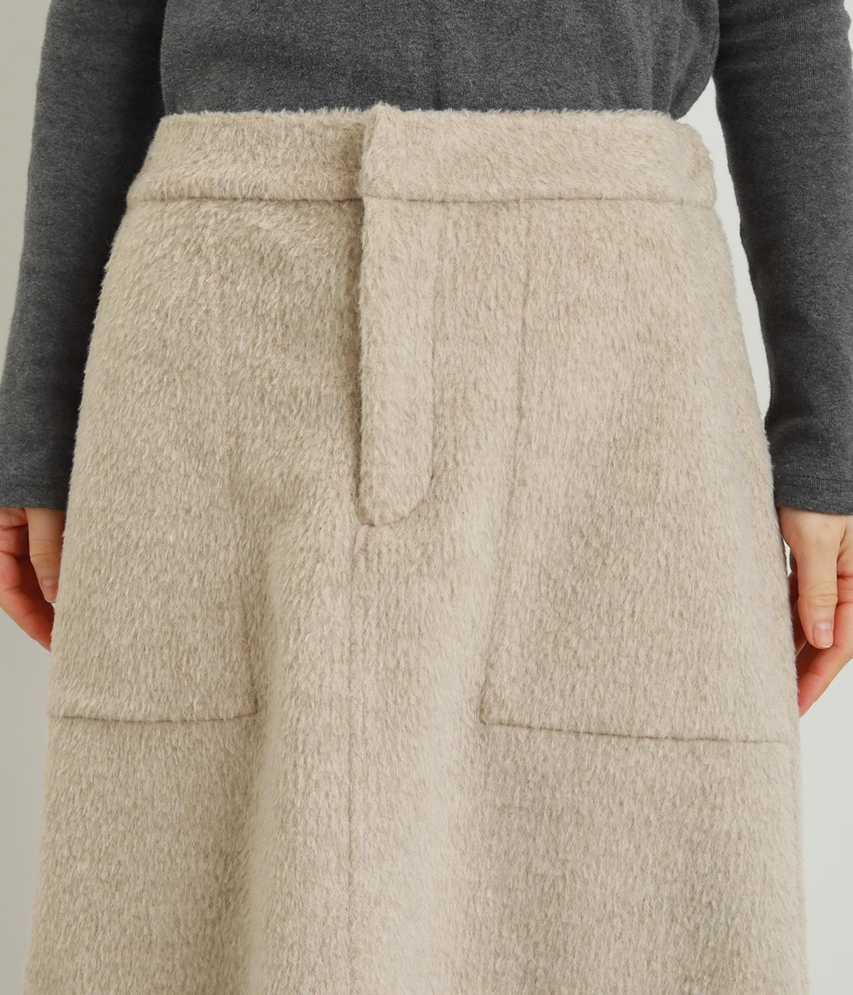 シンプルながら存在感があり、大人の品の良さを感じさせるシャギースカート。台形シルエットに大きめポケットで、デイリー使いしやすいカジュアルテイストにまとめています。前ファスナーに後ろゴムウエスト、ベント入りで着用感も◎。