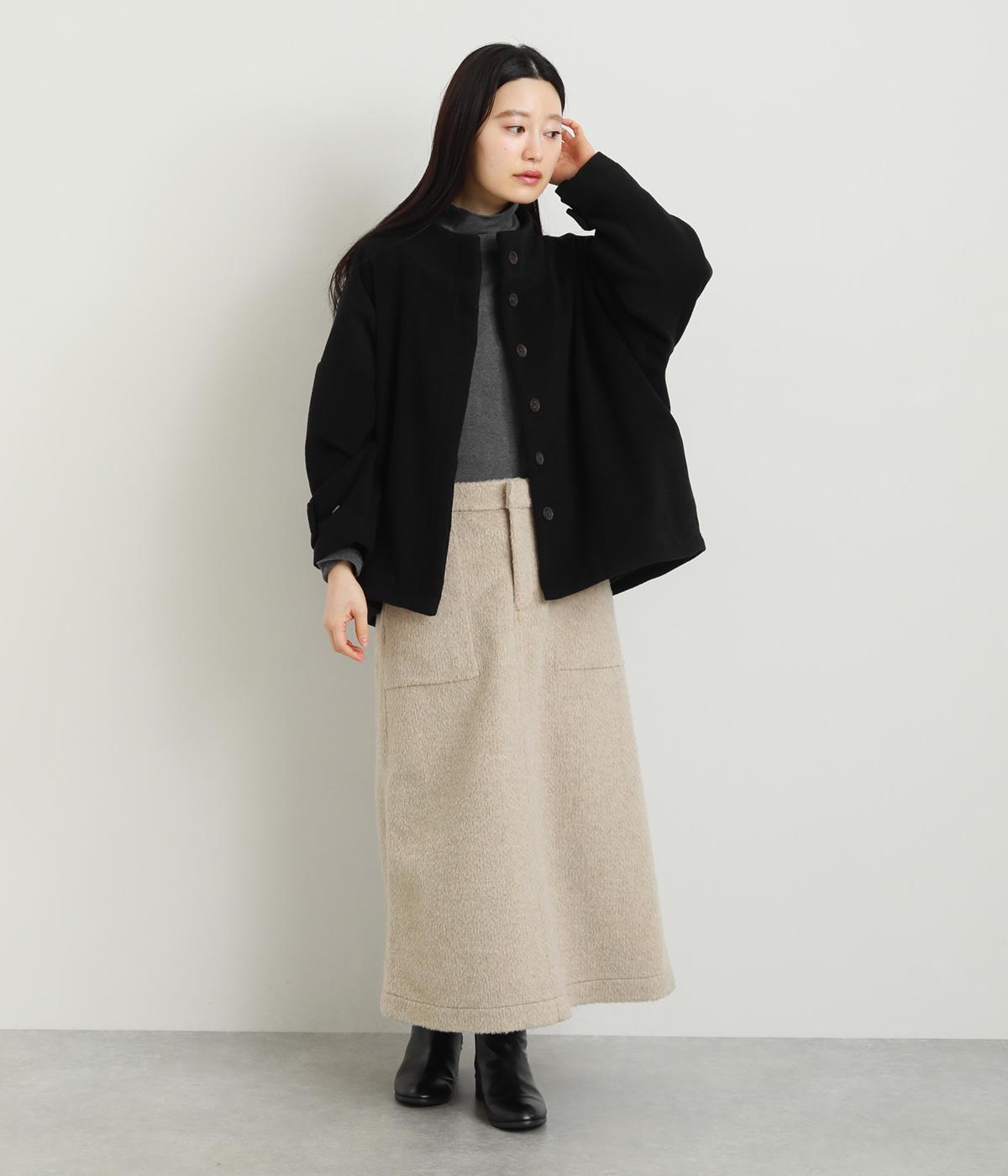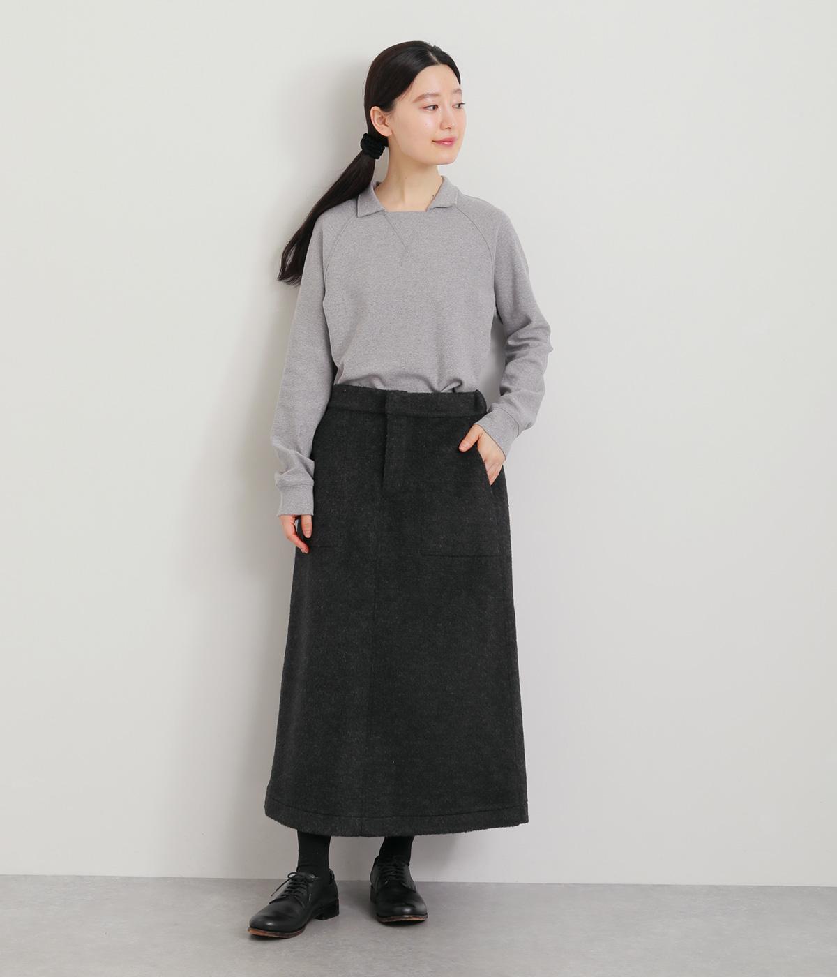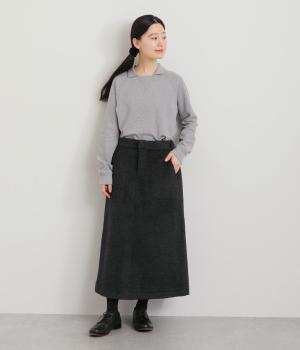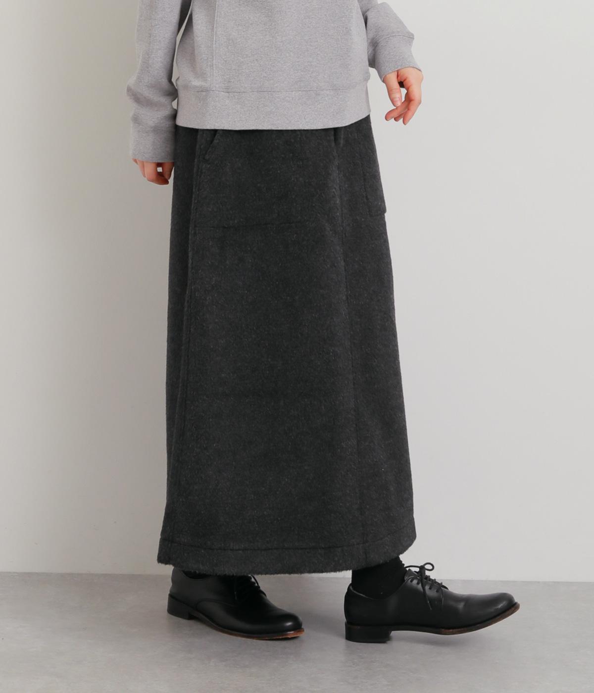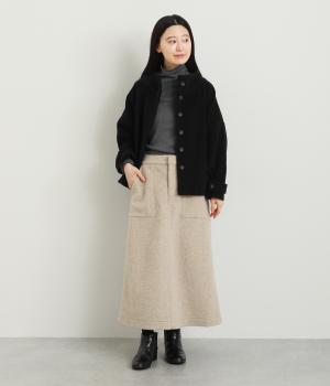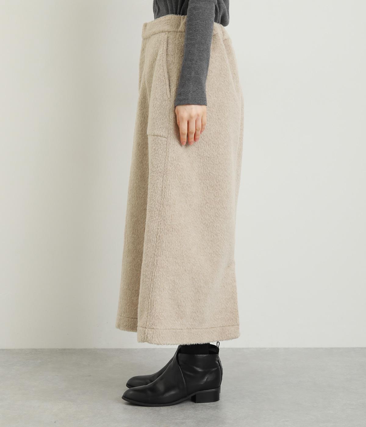シンプルながら存在感があり、大人の品の良さを感じさせるシャギースカート。台形シルエットに大きめポケットで、デイリー使いしやすいカジュアルテイストにまとめています。前ファスナーに後ろゴムウエスト、ベント入りで着用感も◎。