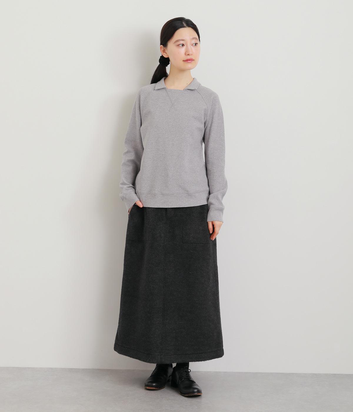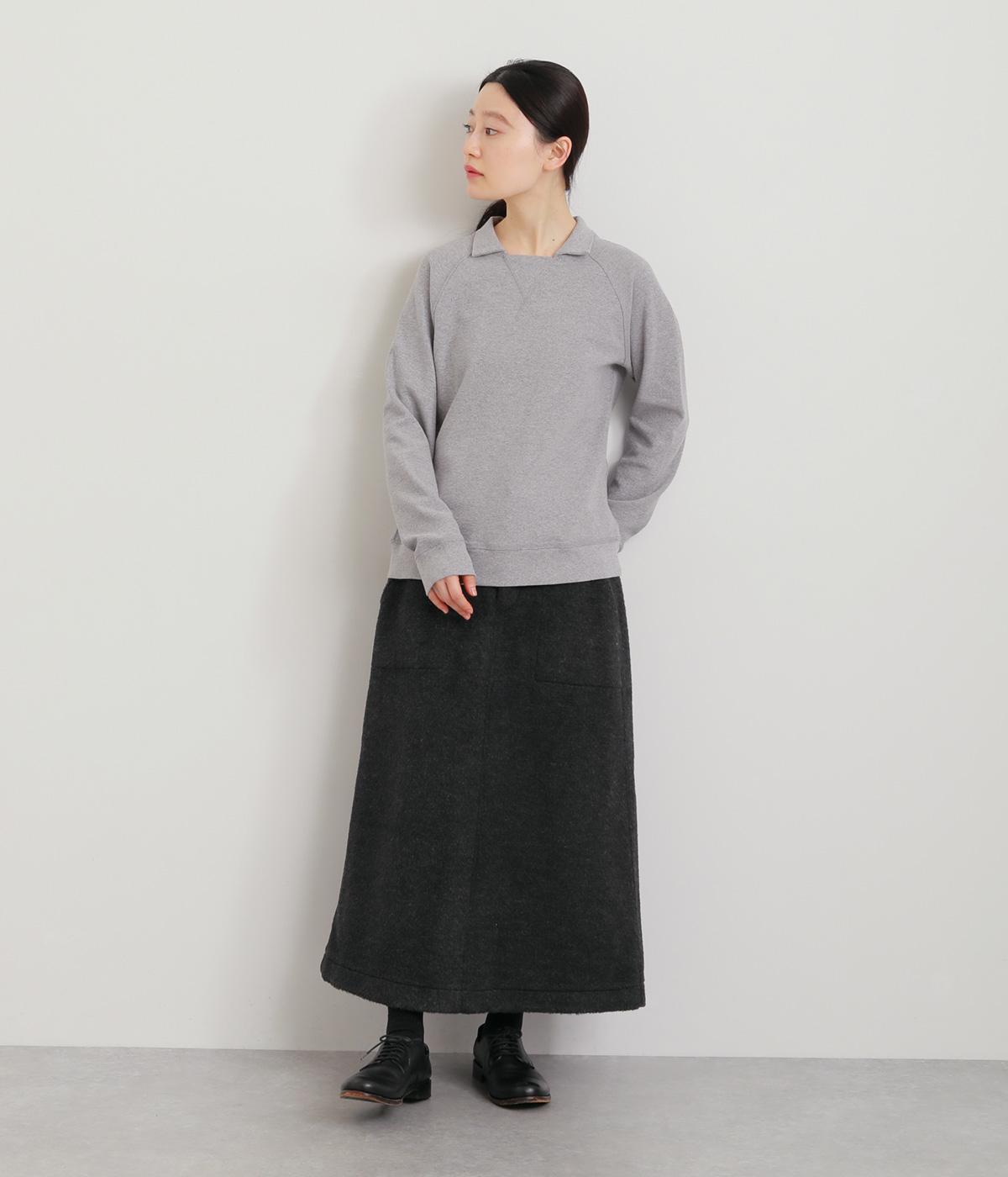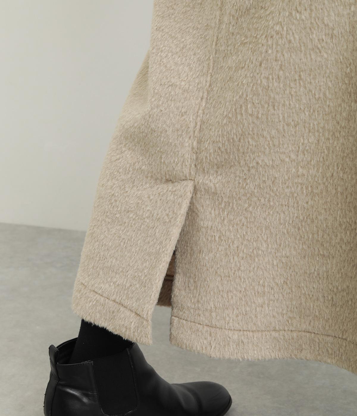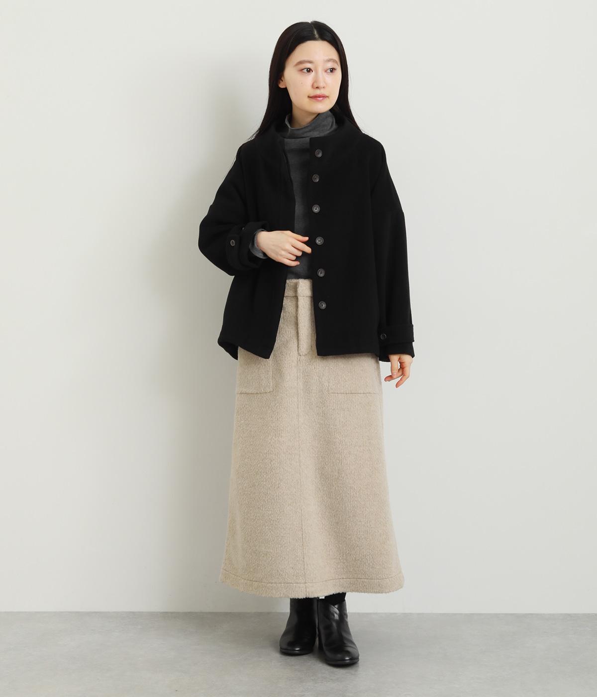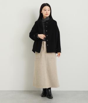 シンプルながら存在感があり、大人の品の良さを感じさせるシャギースカート。台形シルエットに大きめポケットで、デイリー使いしやすいカジュアルテイストにまとめています。前ファスナーに後ろゴムウエスト、ベント入りで着用感も◎。