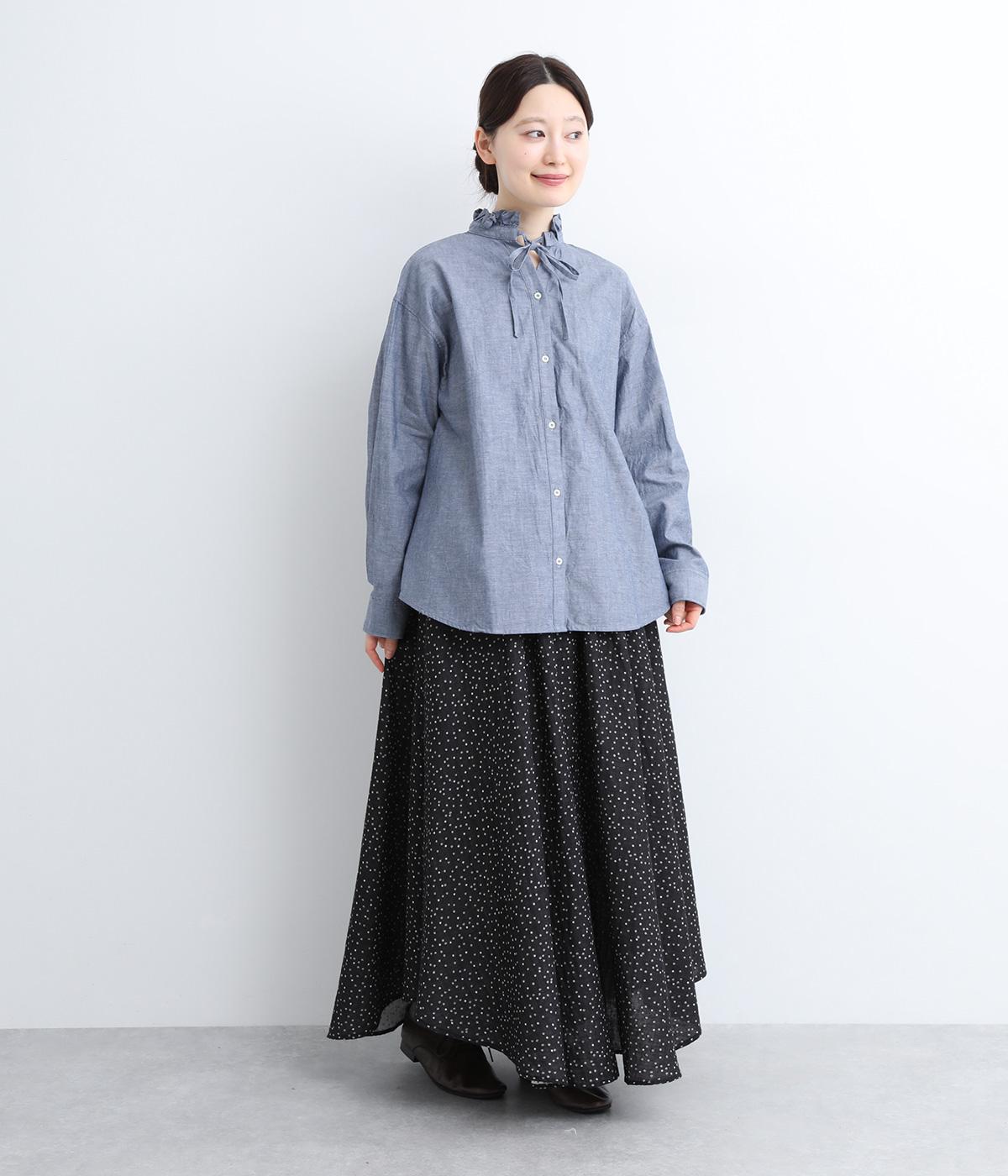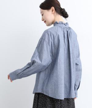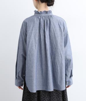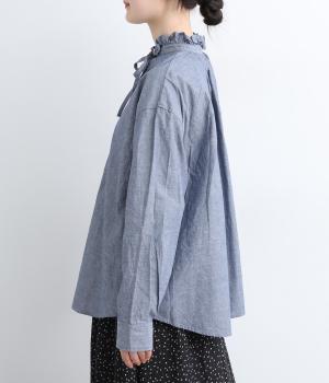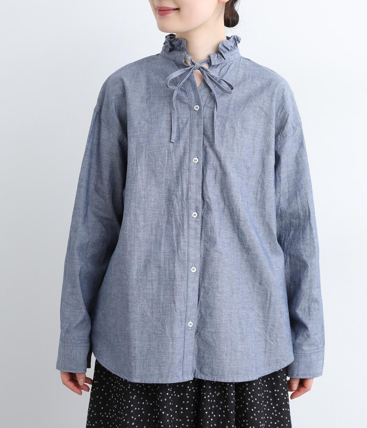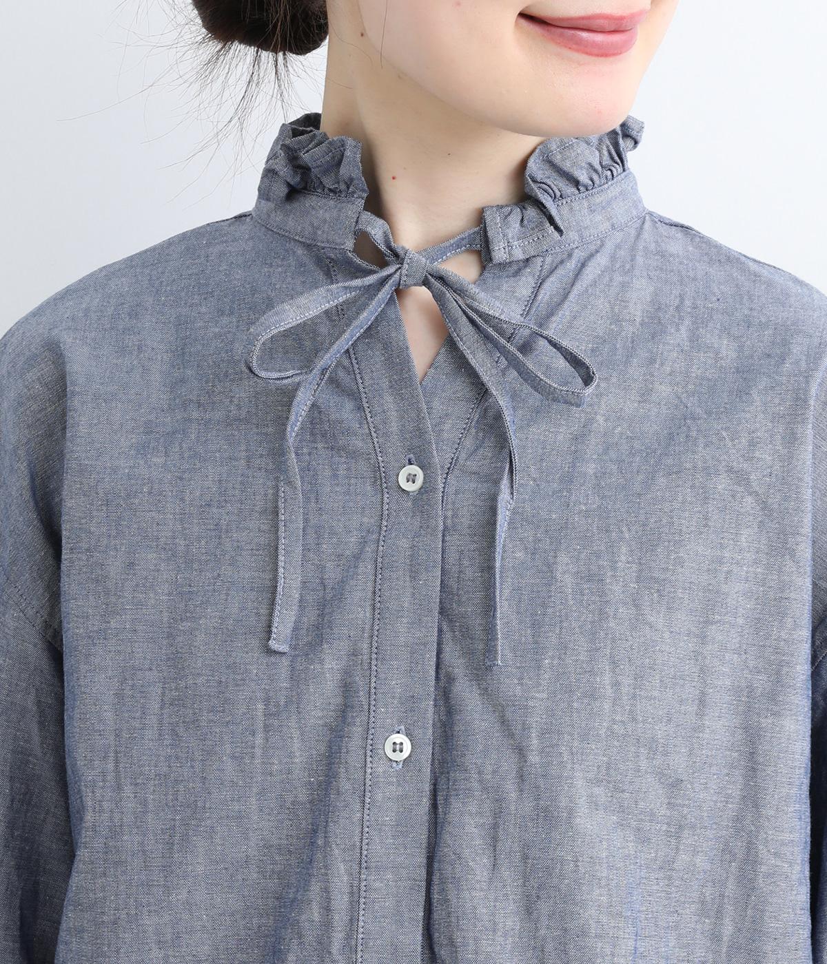 カジュアルな印象のデニムシャツに身にフリルのスタンドカラーをつけてちょうどいいガーリーアイテムに。襟ぐりの紐は結んでも自然に垂らしてもさまになり、ラフなトップスアウトもお洒落にきまるシルエット。前あきの羽織りスタイルもおすすめです。