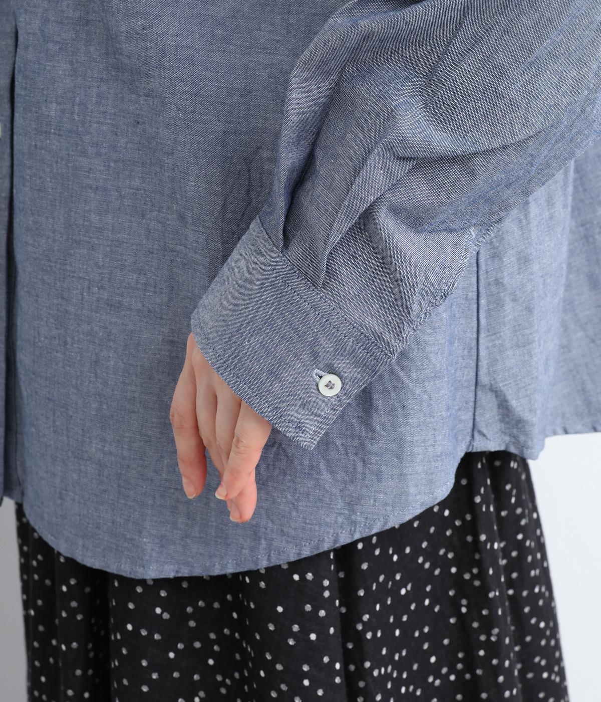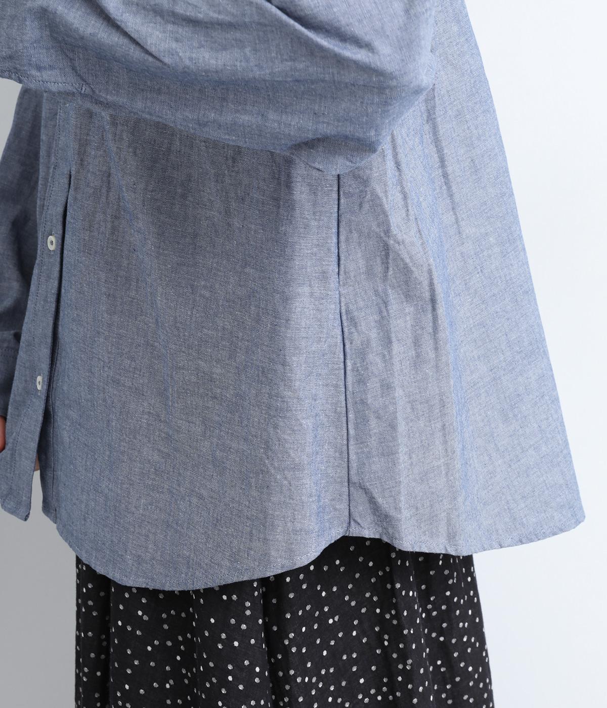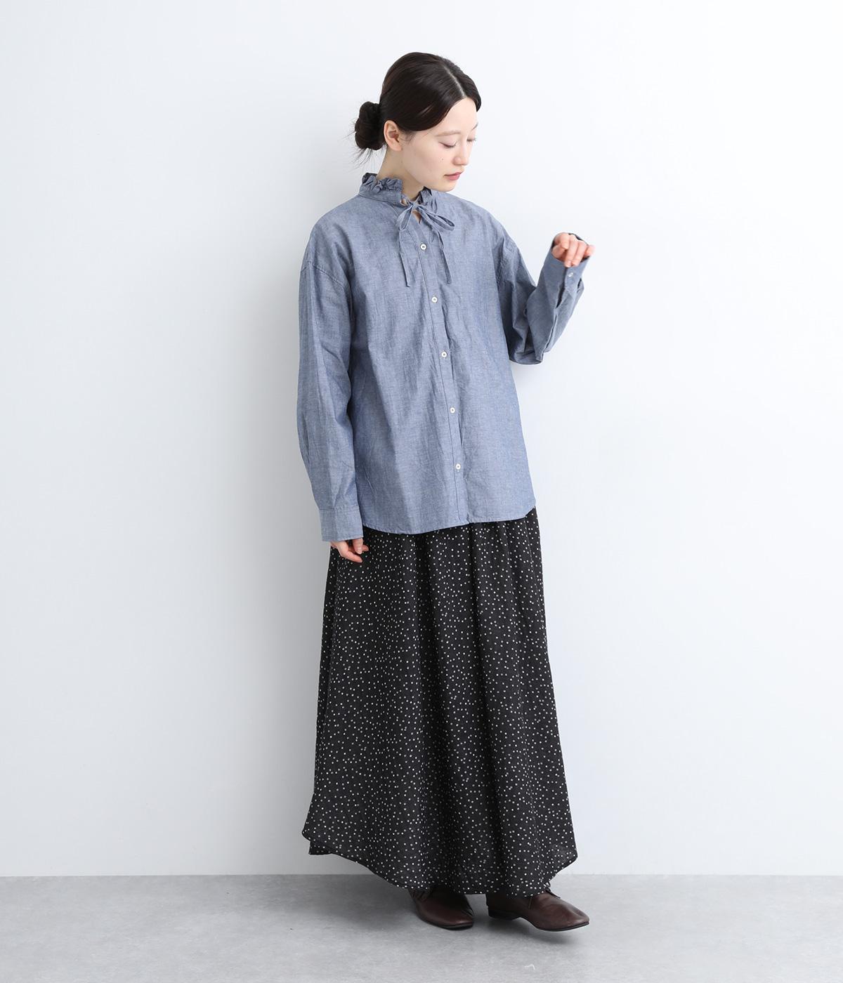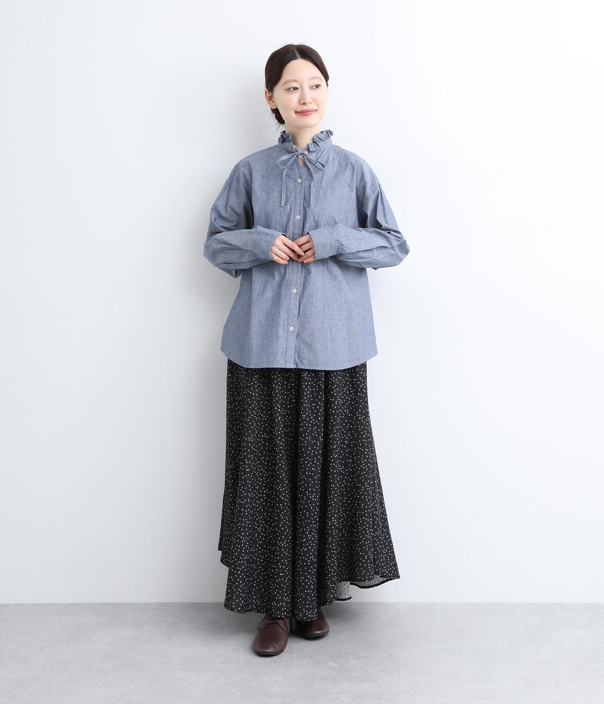 カジュアルな印象のデニムシャツに身にフリルのスタンドカラーをつけてちょうどいいガーリーアイテムに。襟ぐりの紐は結んでも自然に垂らしてもさまになり、ラフなトップスアウトもお洒落にきまるシルエット。前あきの羽織りスタイルもおすすめです。