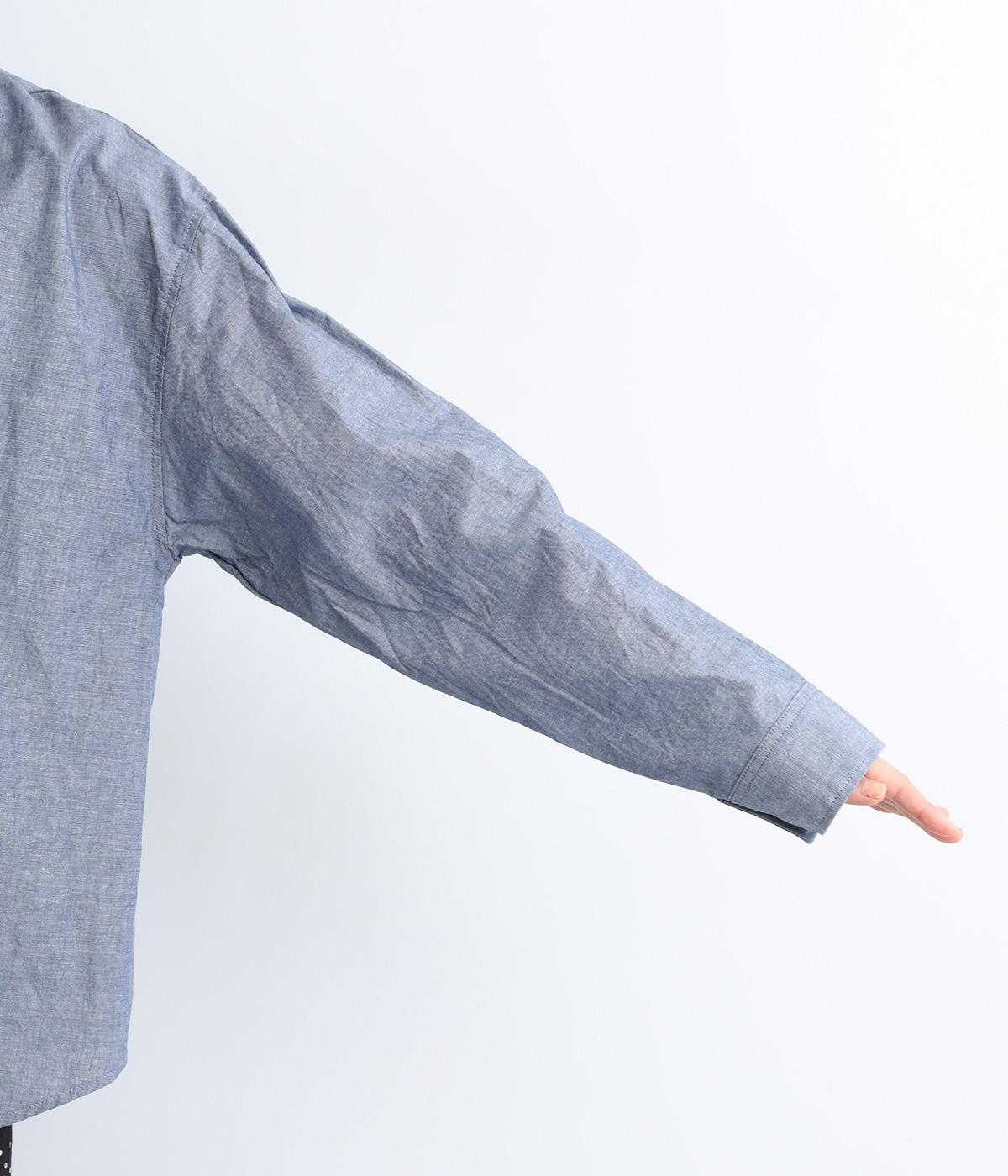 肌触りのよさが魅力で、独特の色ムラが風合い豊かに魅せてくれるダンガリーを使用。薄手ながら丈夫で耐久性があり、洗濯を重ねることでやわらかになり色落ち変化もたのしめます。