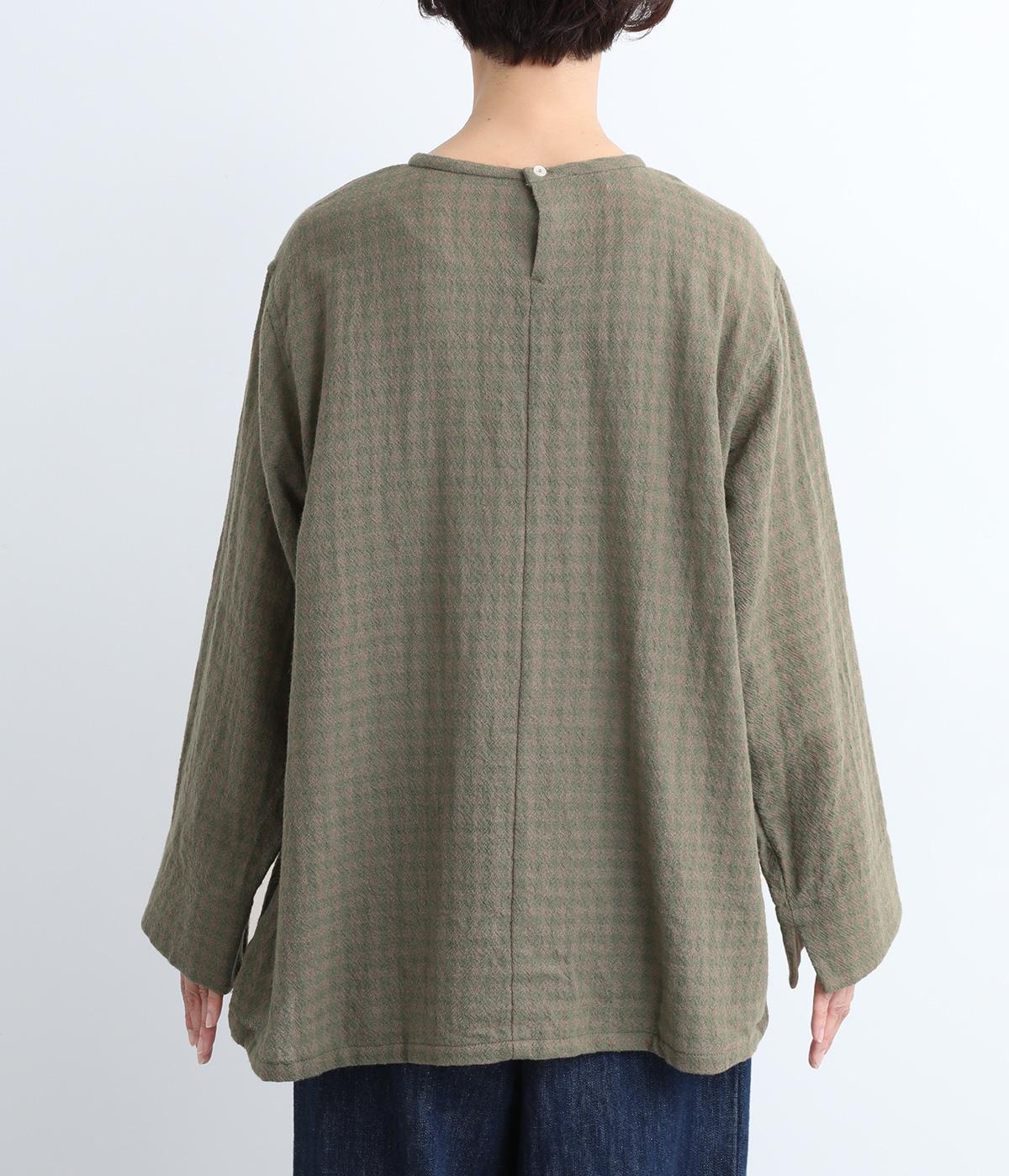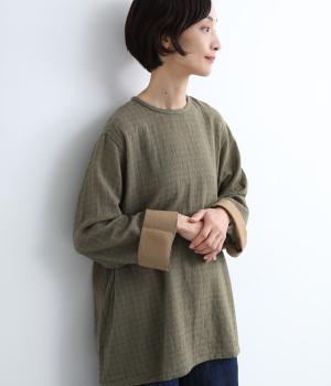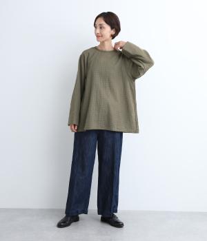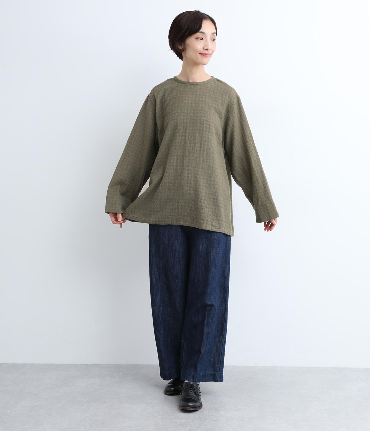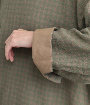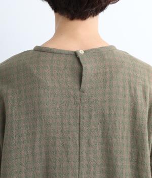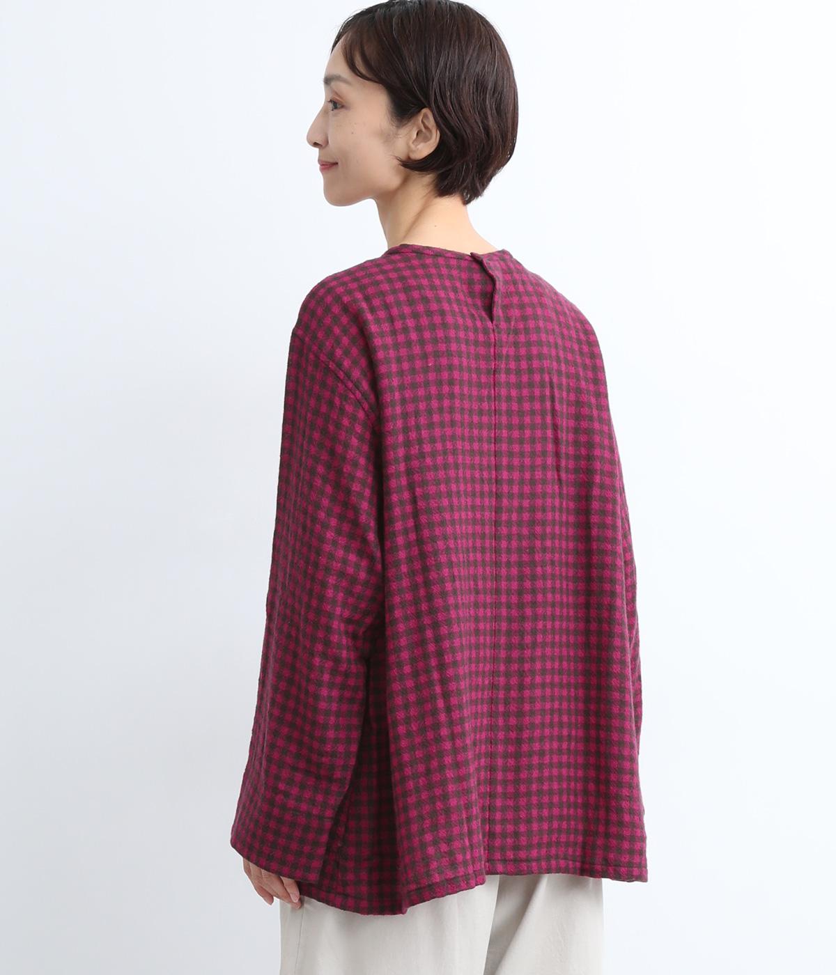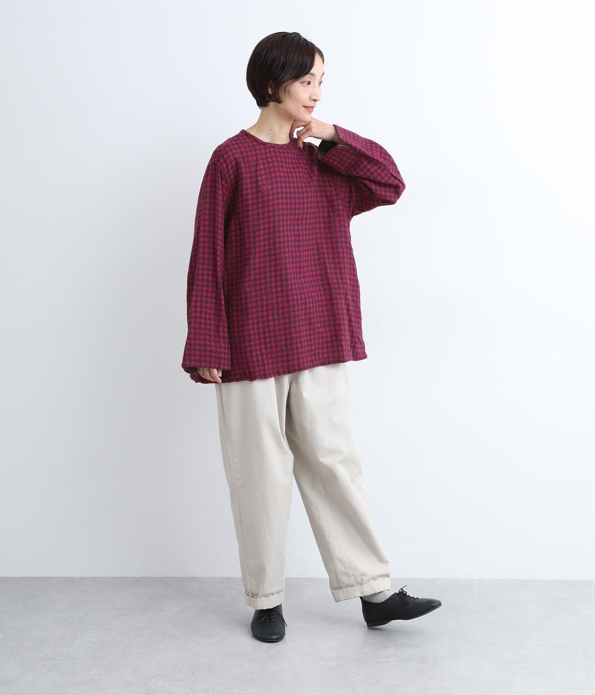 スタイリングの主役にもなるギンガムチェック柄のプルオーバーはゆとりのあるシルエットでリラックスムードにまとめました。袖口は裏に無地の配色生地をあて、折り返した時のデザインポイントに。後ろボタンあきで脱ぎ着もイージーです。
