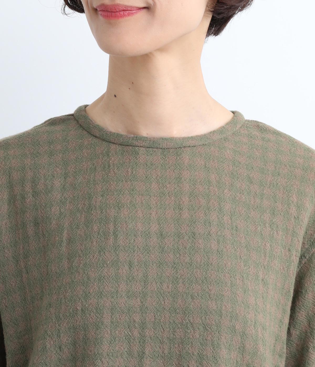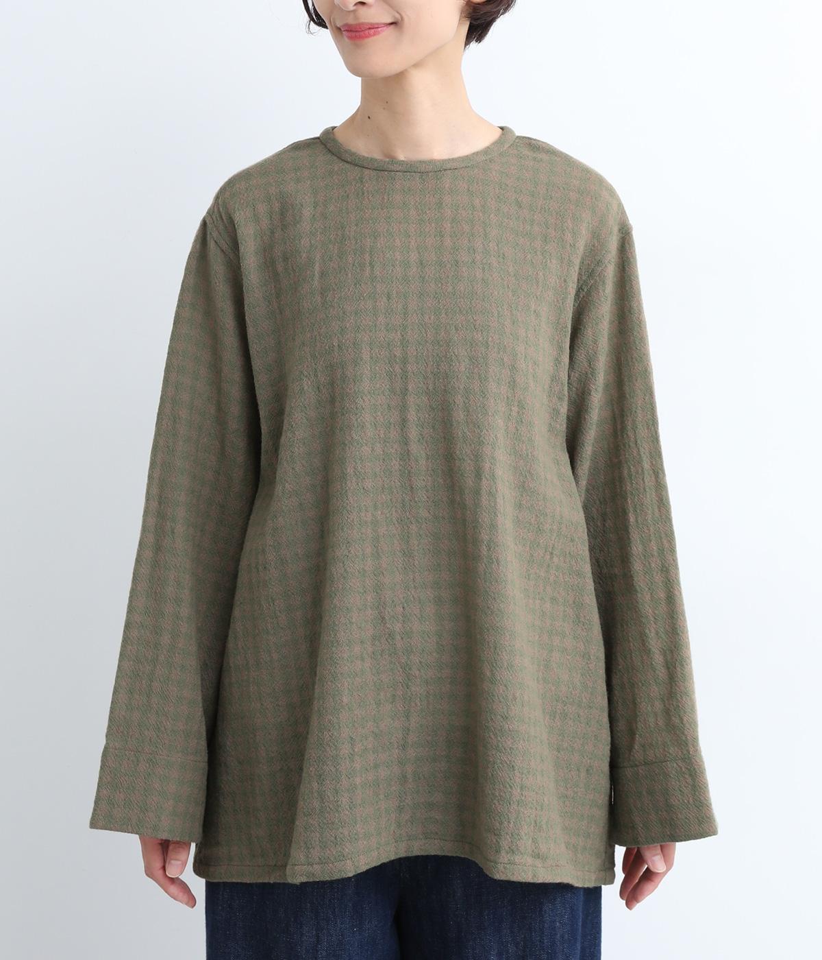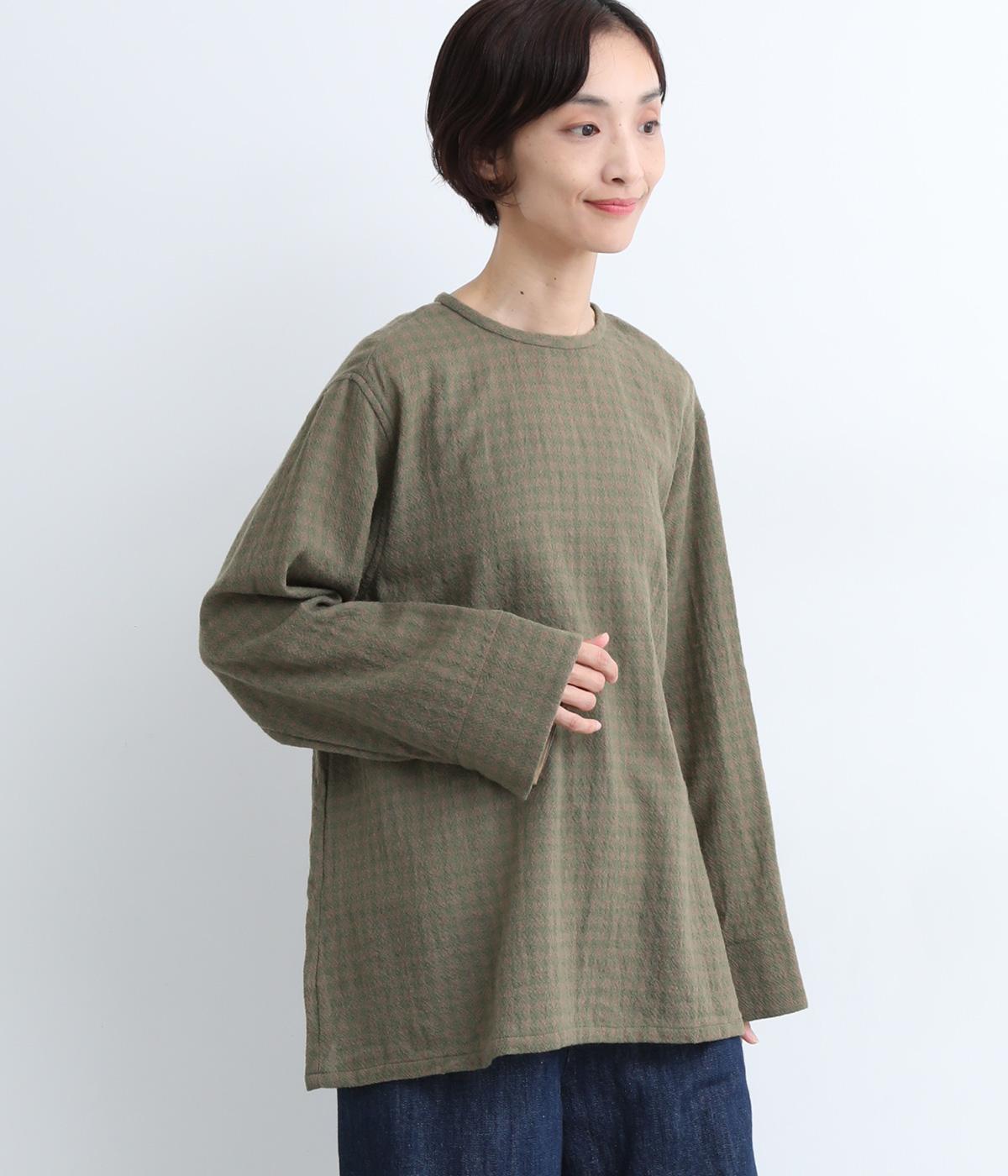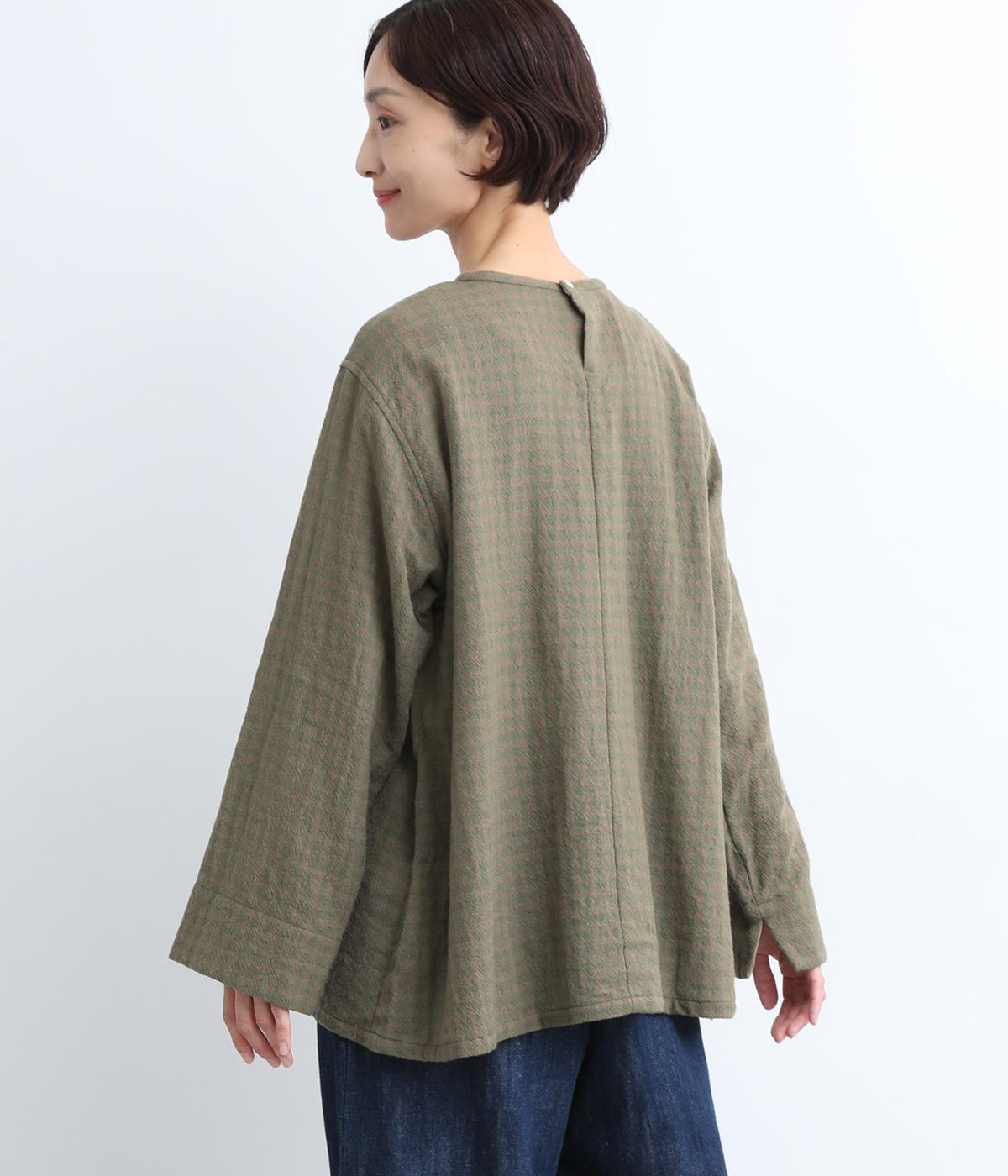 スタイリングの主役にもなるギンガムチェック柄のプルオーバーはゆとりのあるシルエットでリラックスムードにまとめました。袖口は裏に無地の配色生地をあて、折り返した時のデザインポイントに。後ろボタンあきで脱ぎ着もイージーです。