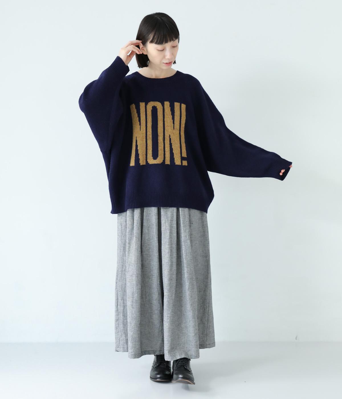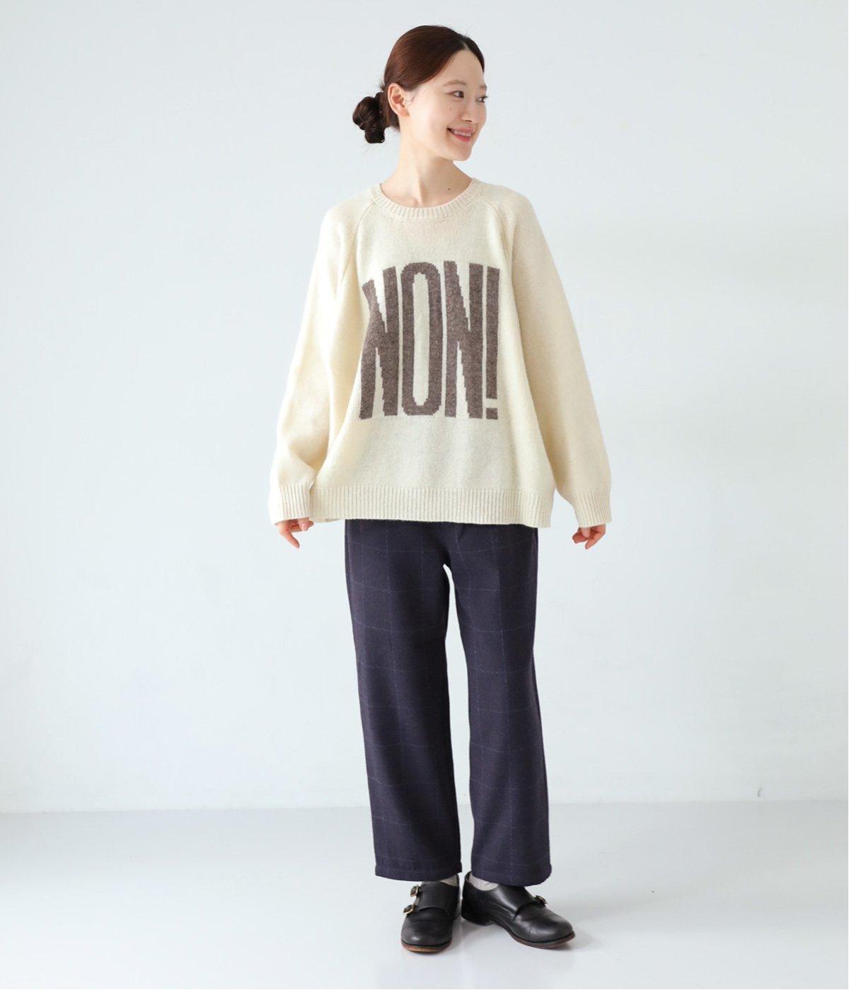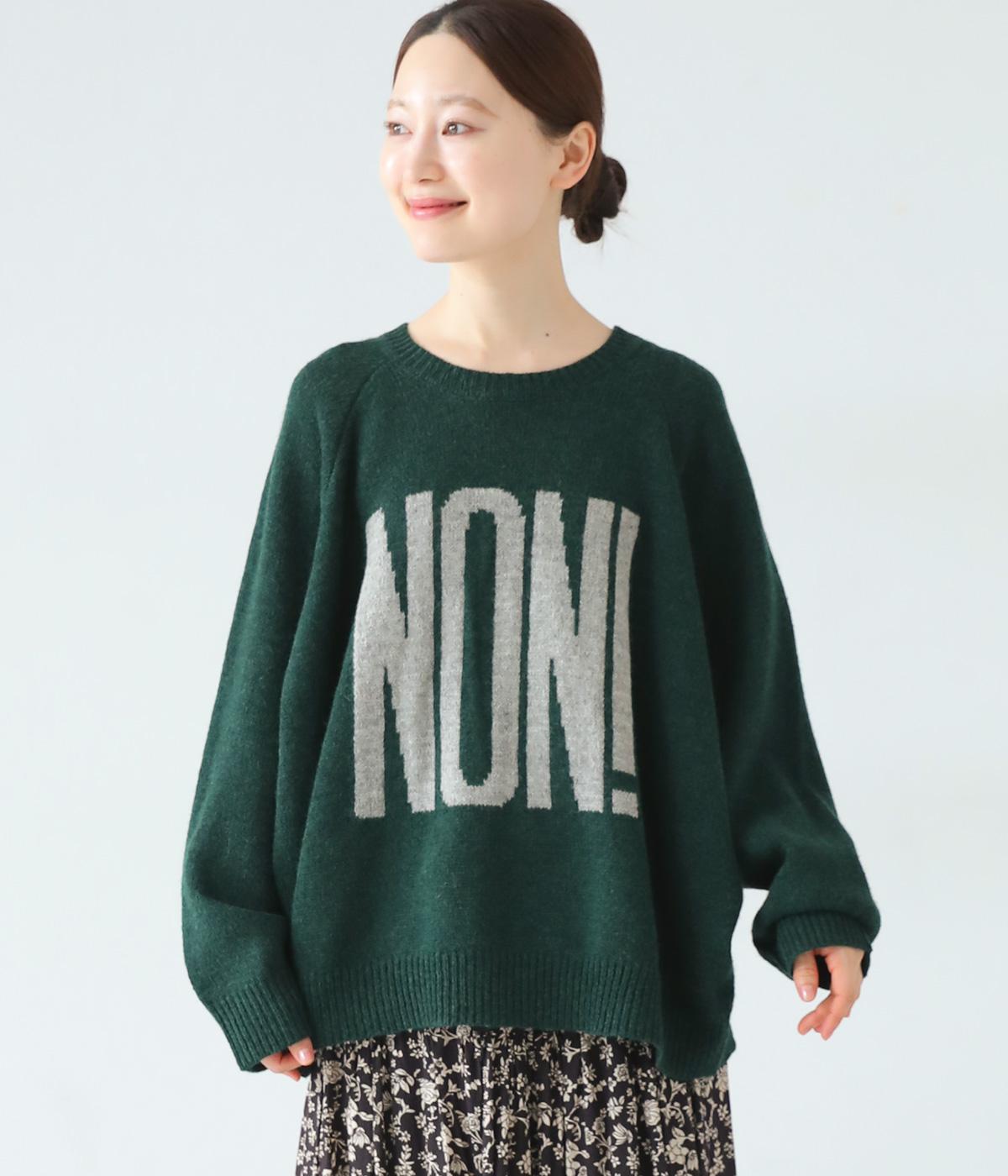 フランス語でNOを意味するロゴとおしゃれな配色がポイントのニットプルオーバー。ゆとりのあるシルエットでこなれ感たっぷりな着こなしが叶います。肩幅を強調しないラグランスリーブもポイント。ほどよく開いたネックラインが顔まわりをすっきりと見せてくれます。