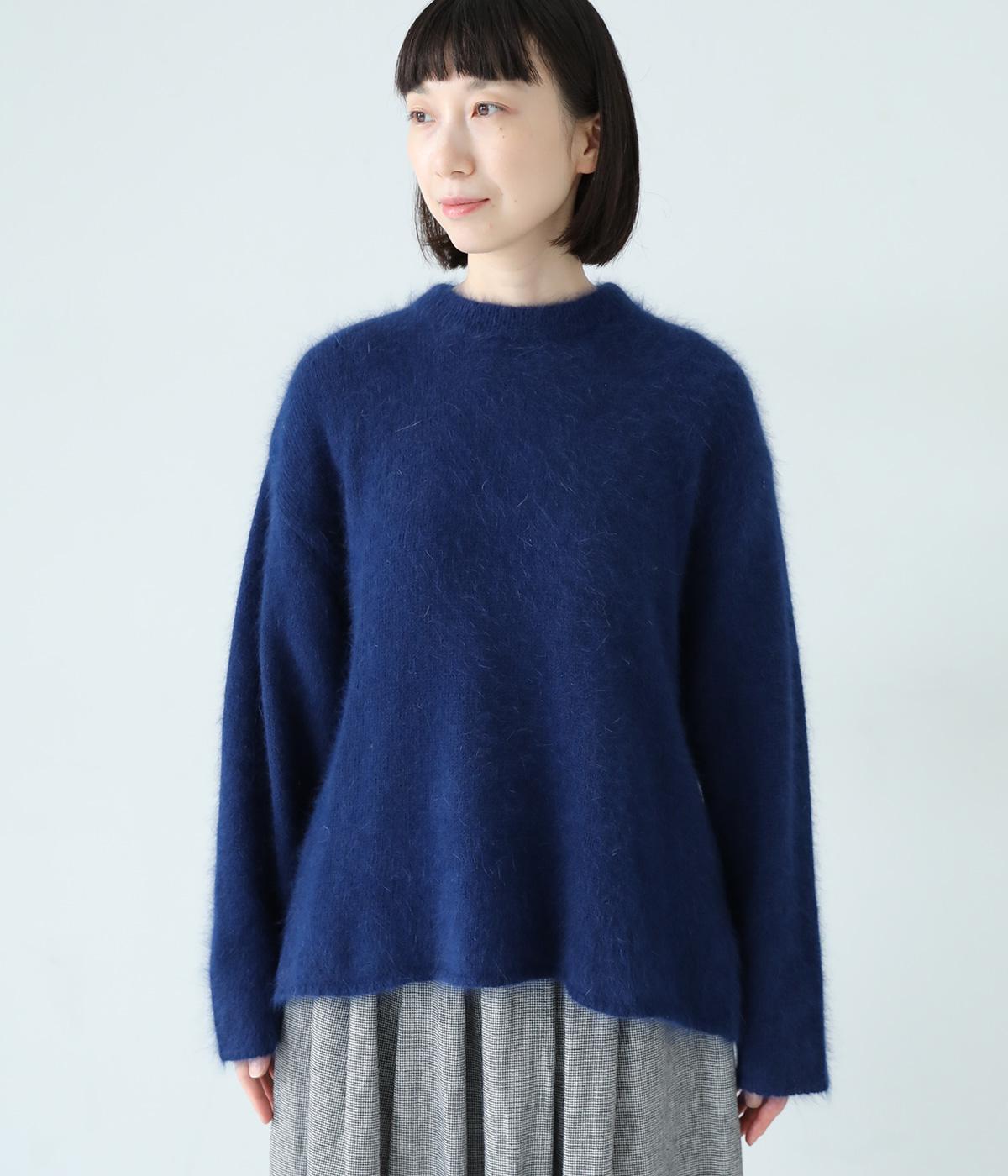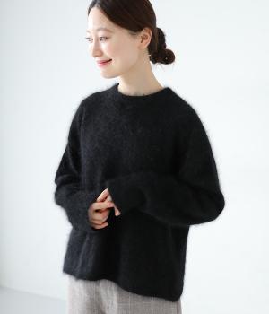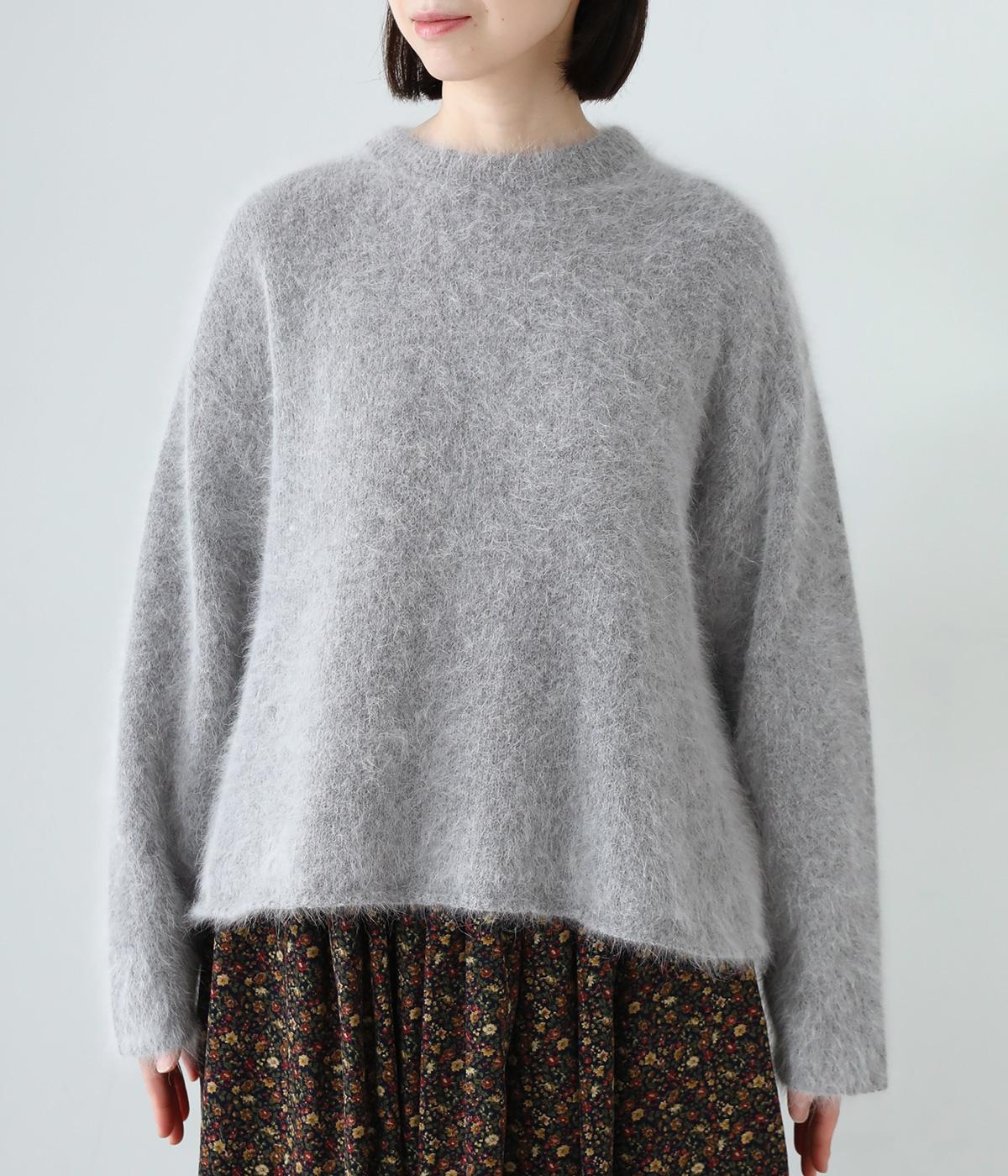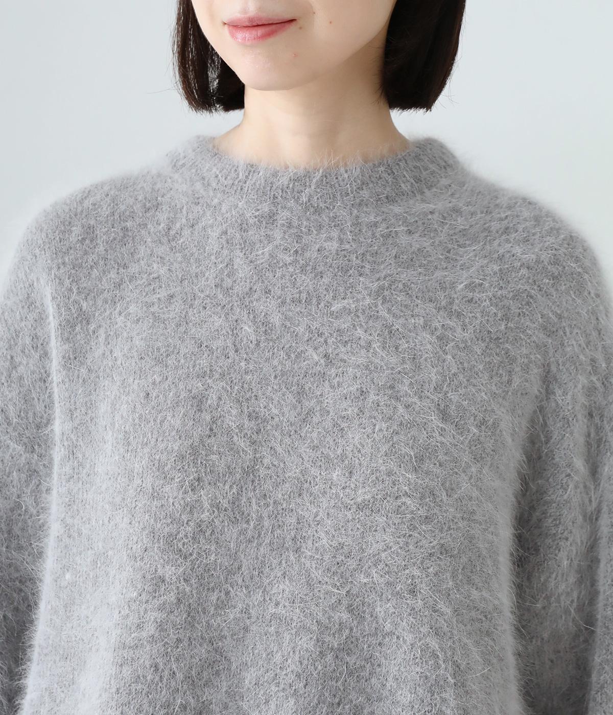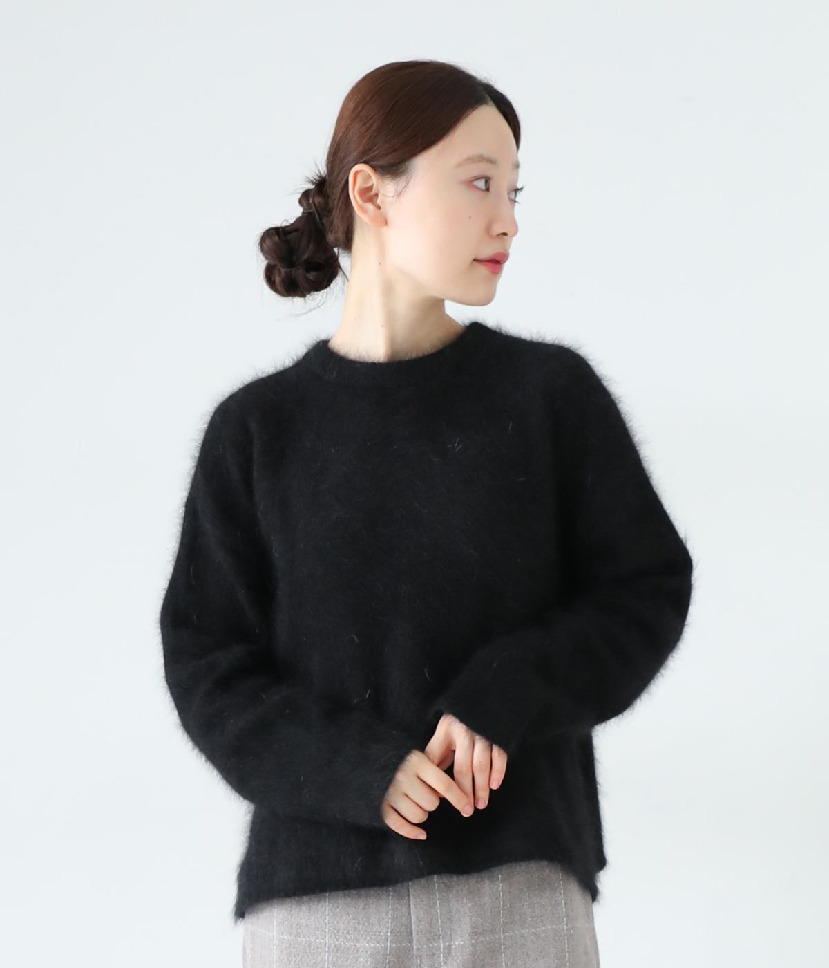 毛足の長いふわふわとしたルックスと、チクチク感の少ない心地よい肌触りをたのしめるアンゴラ混ニット。厚手すぎないほどよい肉感で、真冬はアウターのインにも着やすいのがうれしいポイントです。