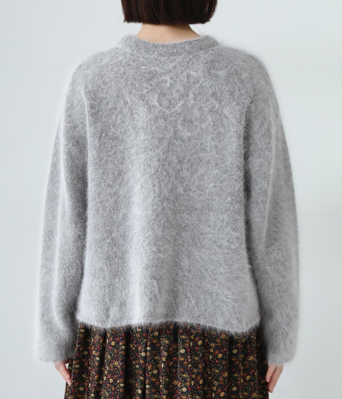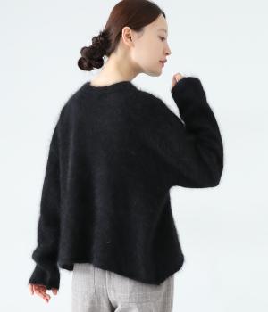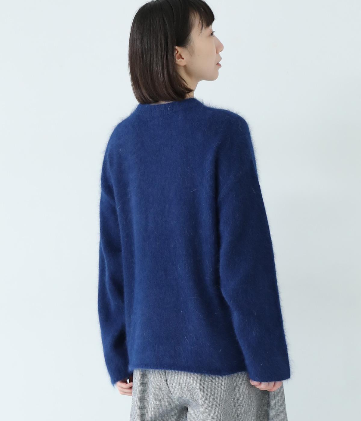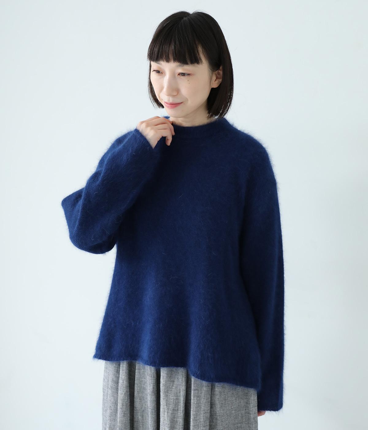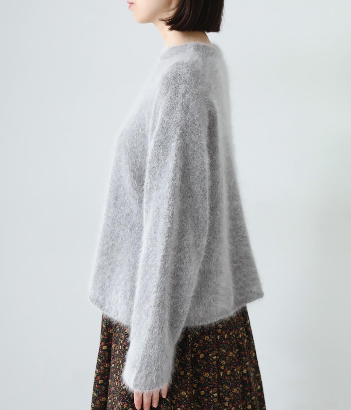 毛足の長いふわふわとしたルックスと、チクチク感の少ない心地よい肌触りをたのしめるアンゴラ混ニット。厚手すぎないほどよい肉感で、真冬はアウターのインにも着やすいのがうれしいポイントです。