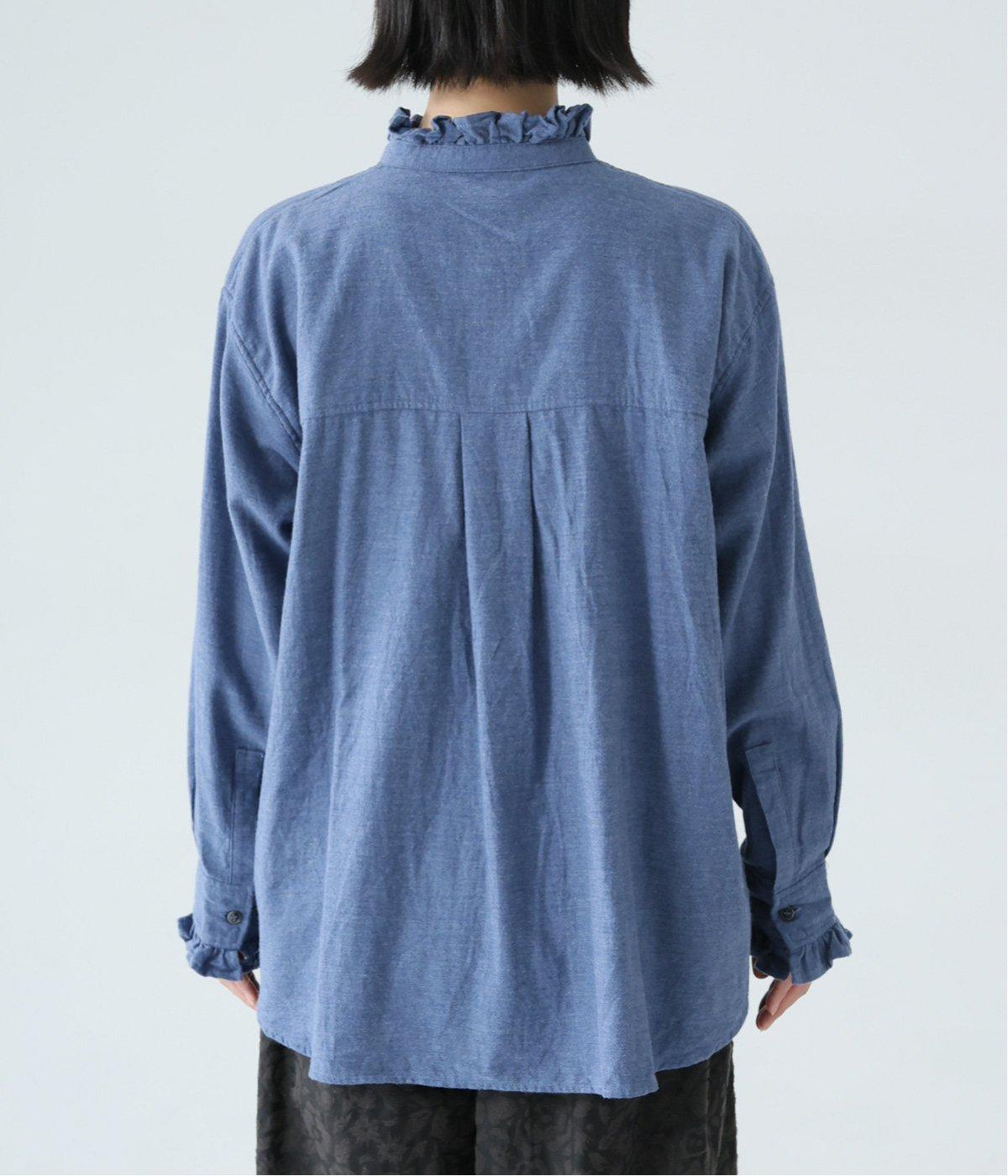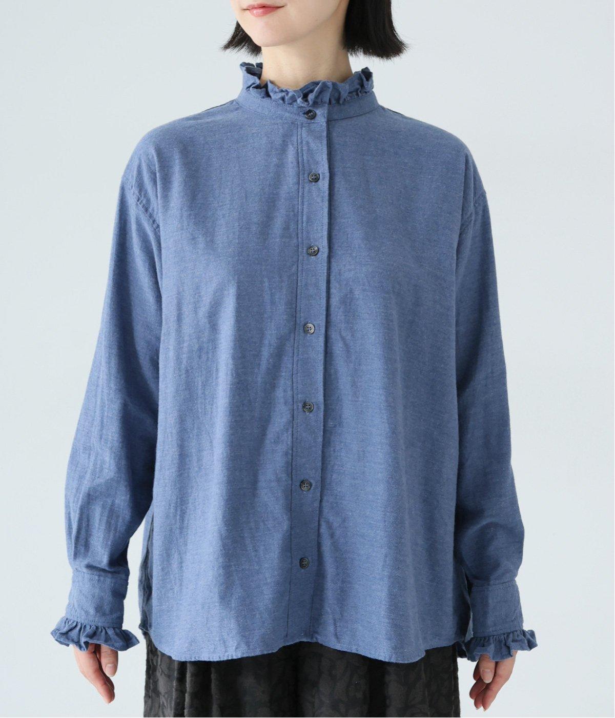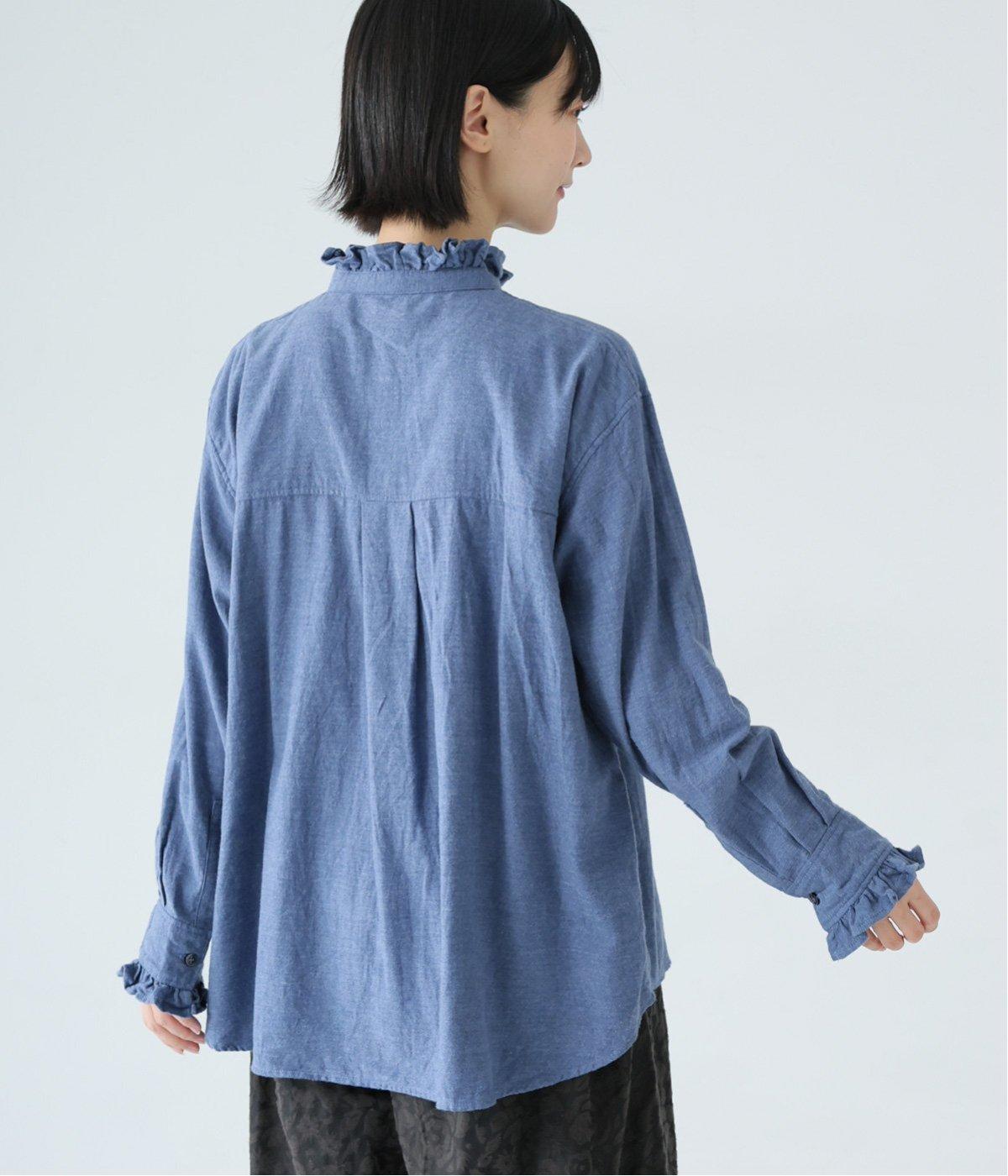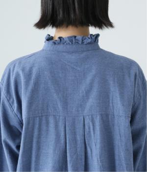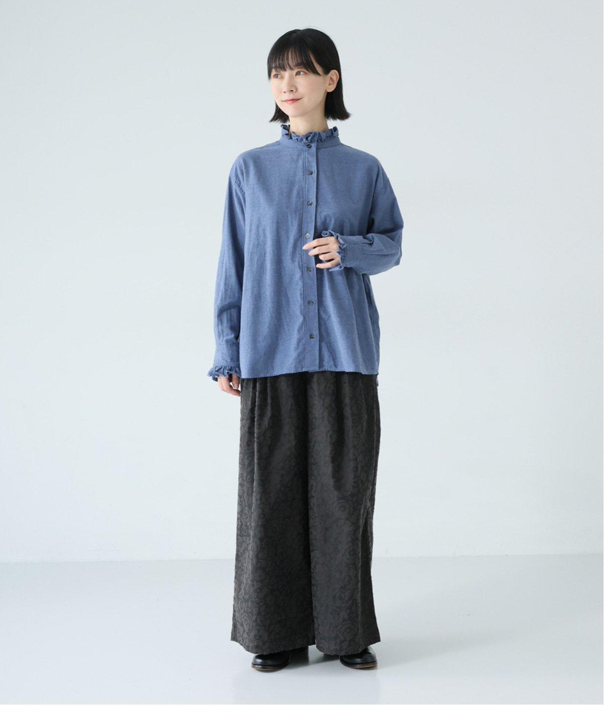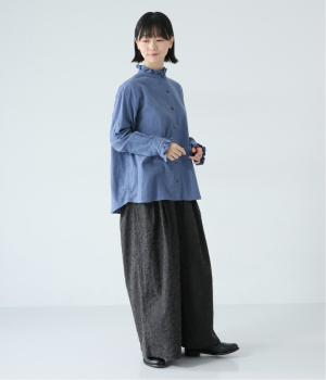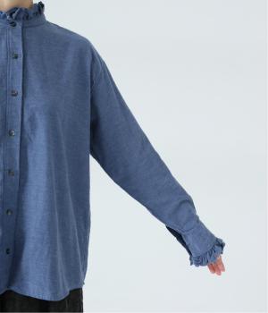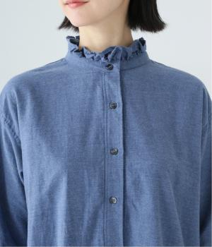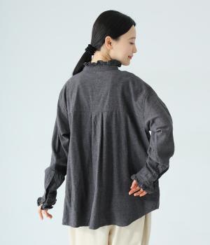 きちんと感ただようバンドカラーシャツの襟と袖口に、愛らしいフリルをあしらいました。背中にセンタープリーツを入れてゆったりと広がるシルエットに。腰をおおう絶妙な着丈で、さまざまなボトムスとバランスよく合わせられます。
