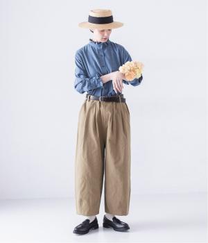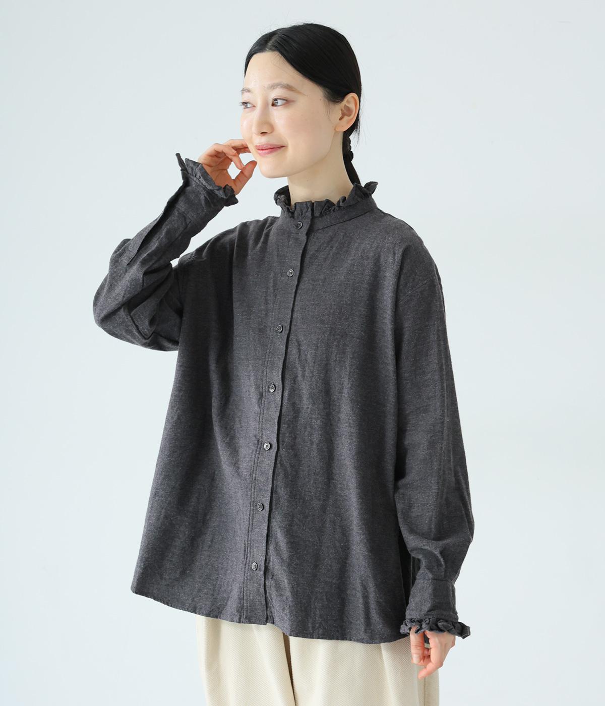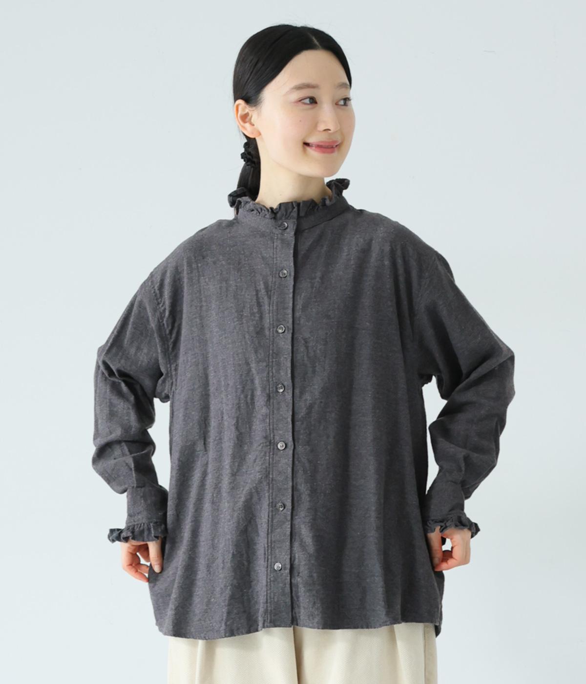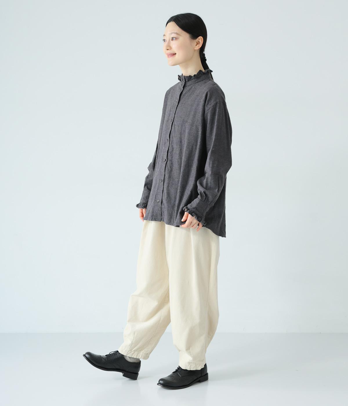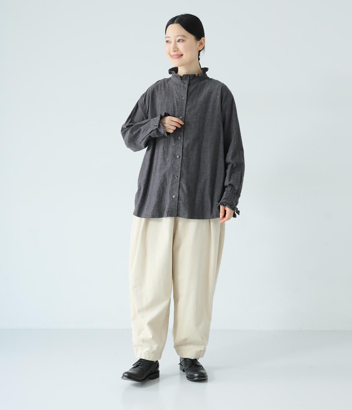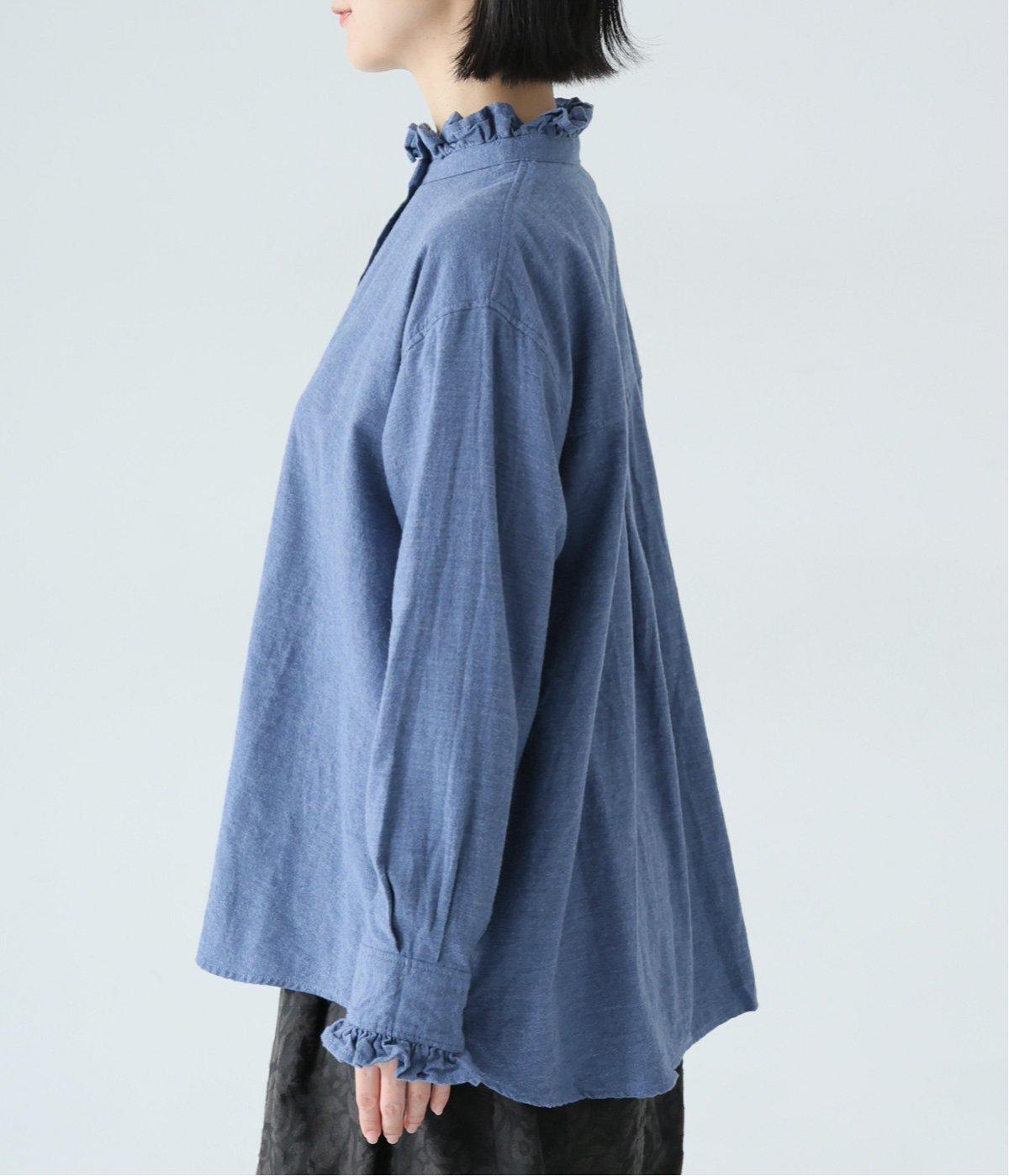 きちんと感ただようバンドカラーシャツの襟と袖口に、愛らしいフリルをあしらいました。背中にセンタープリーツを入れてゆったりと広がるシルエットに。腰をおおう絶妙な着丈で、さまざまなボトムスとバランスよく合わせられます。