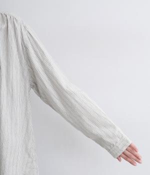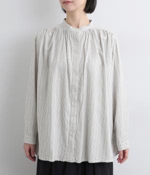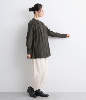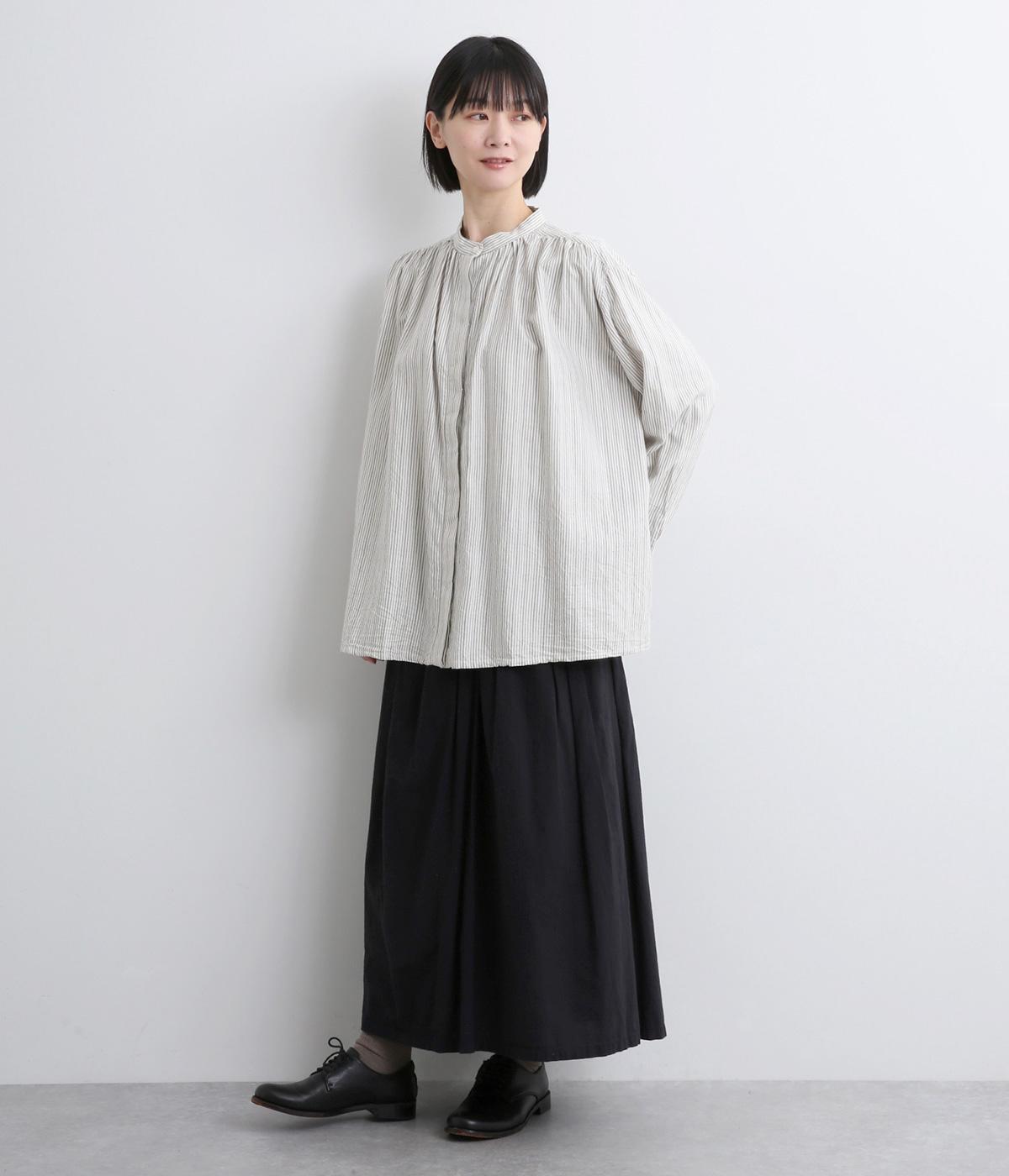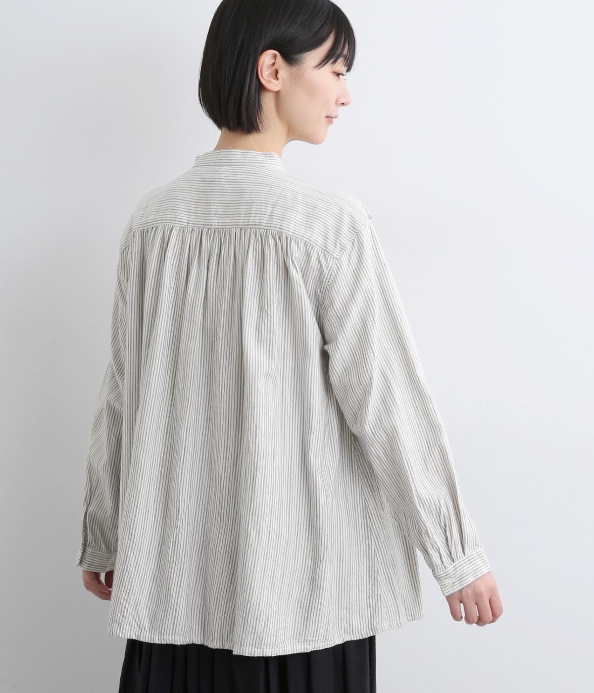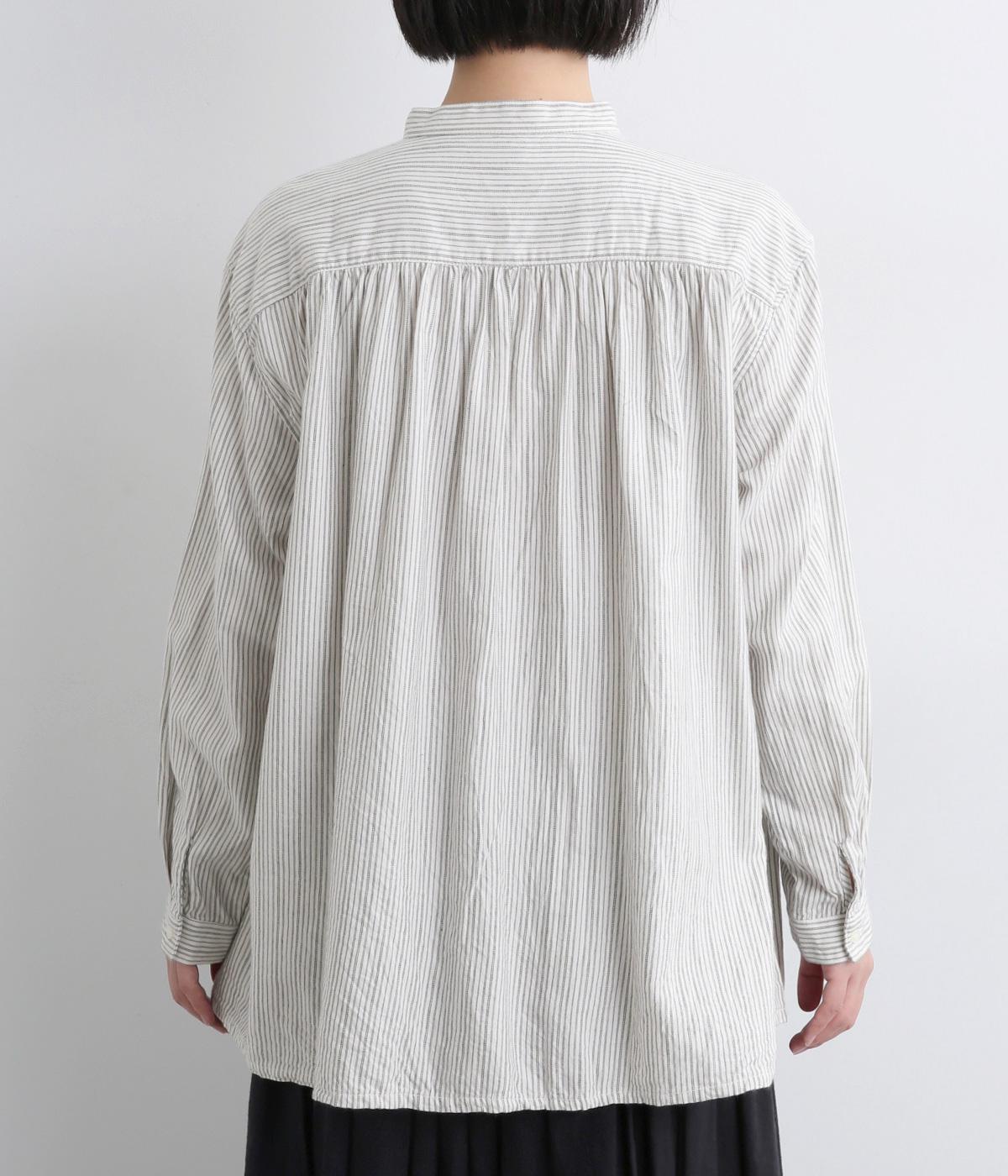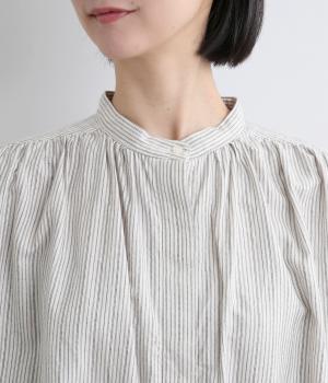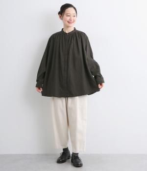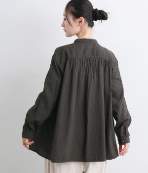 前後にたっぷりほどこしたギャザーが女性らしいシルエットをつくるシャツです。ゆったりした身幅でリラックス感のある着心地ながら、バンドカラーや比翼仕立ての前立てですっきりとバランスよく仕上げました。