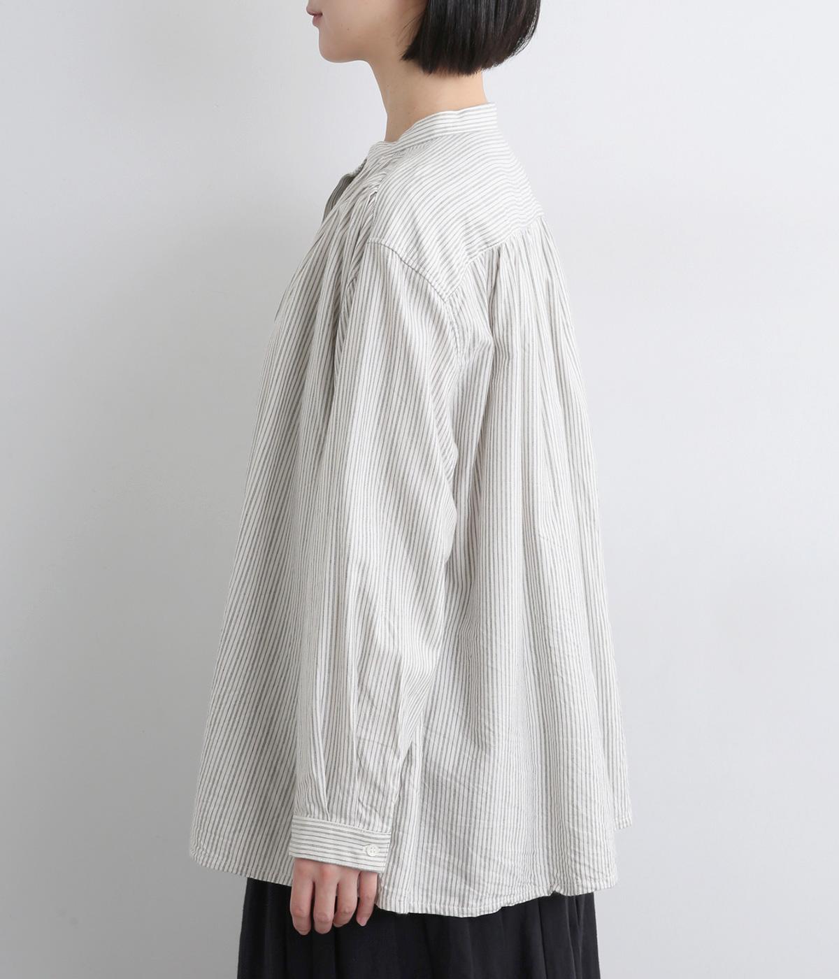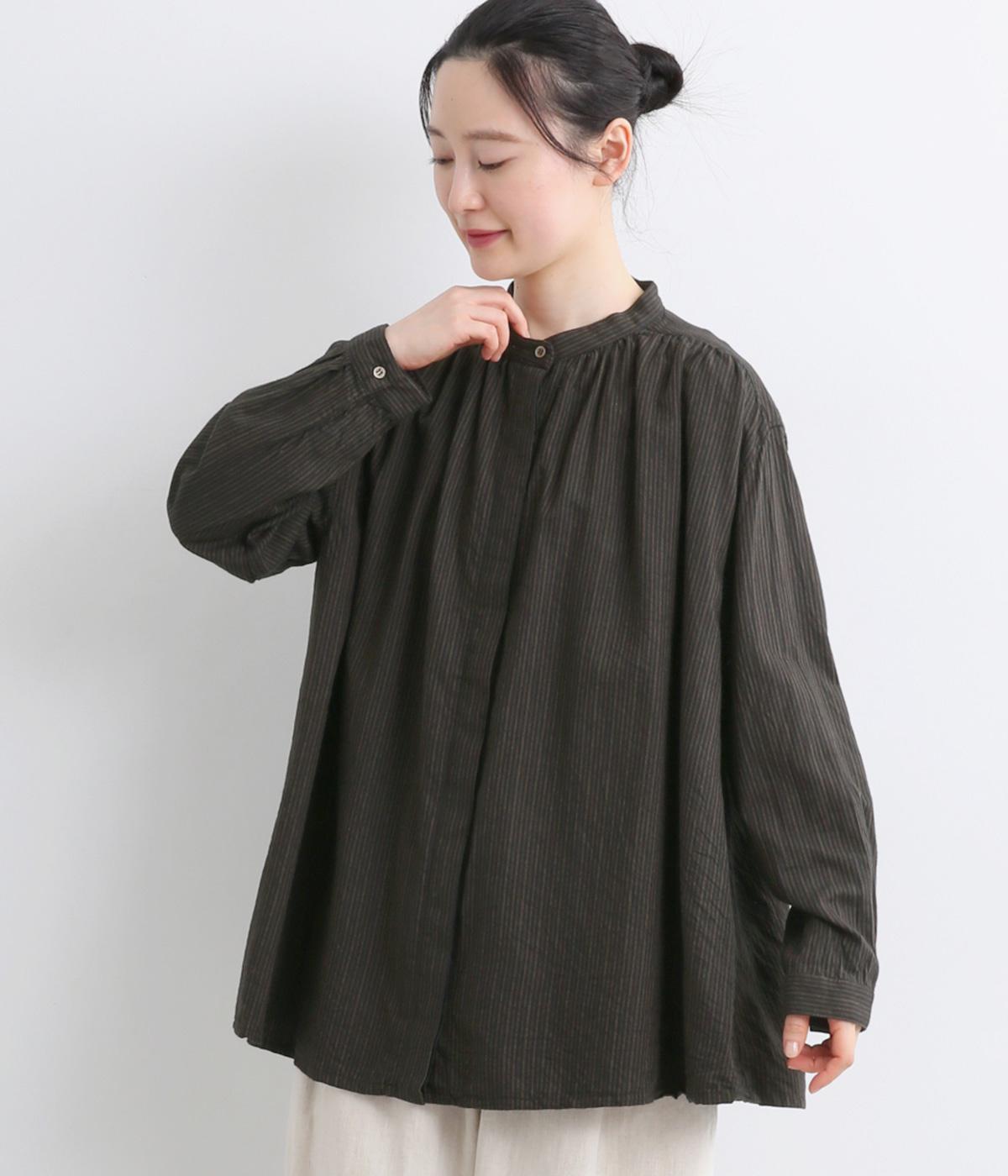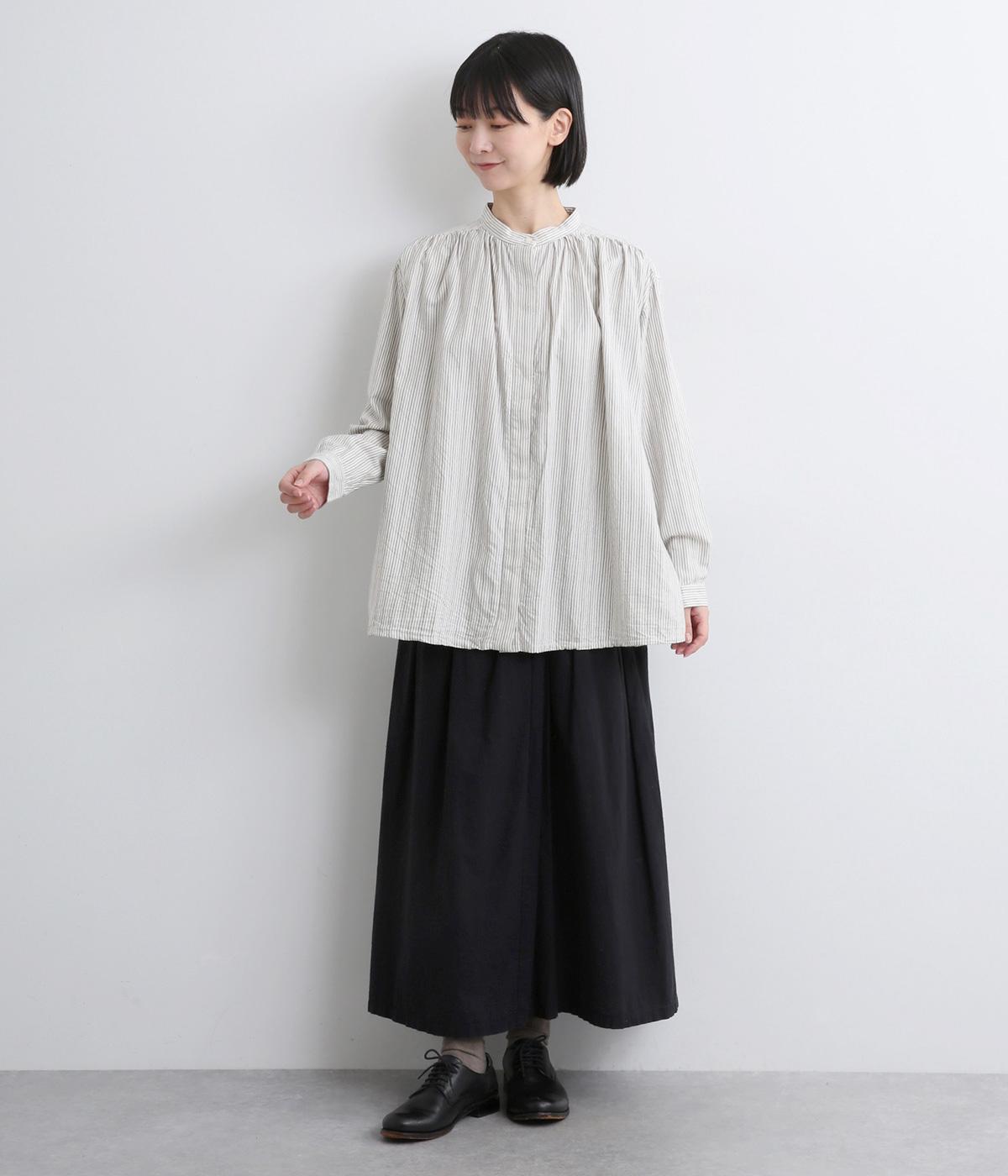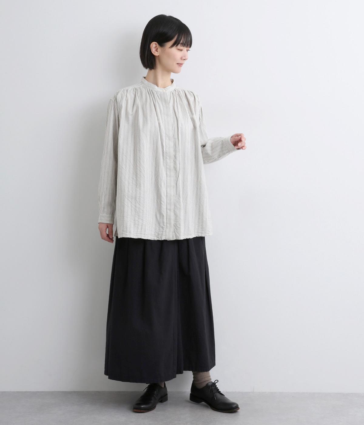 前後にたっぷりほどこしたギャザーが女性らしいシルエットをつくるシャツです。ゆったりした身幅でリラックス感のある着心地ながら、バンドカラーや比翼仕立ての前立てですっきりとバランスよく仕上げました。