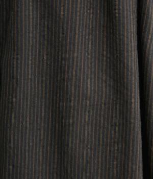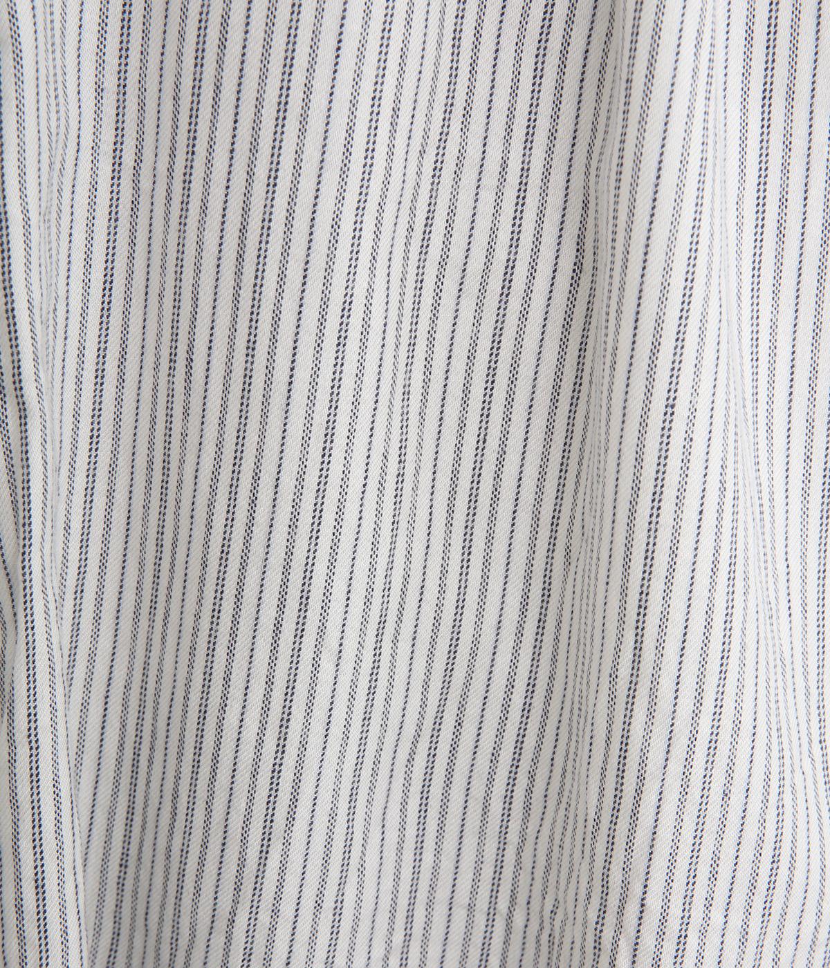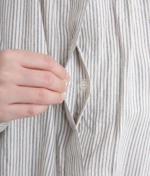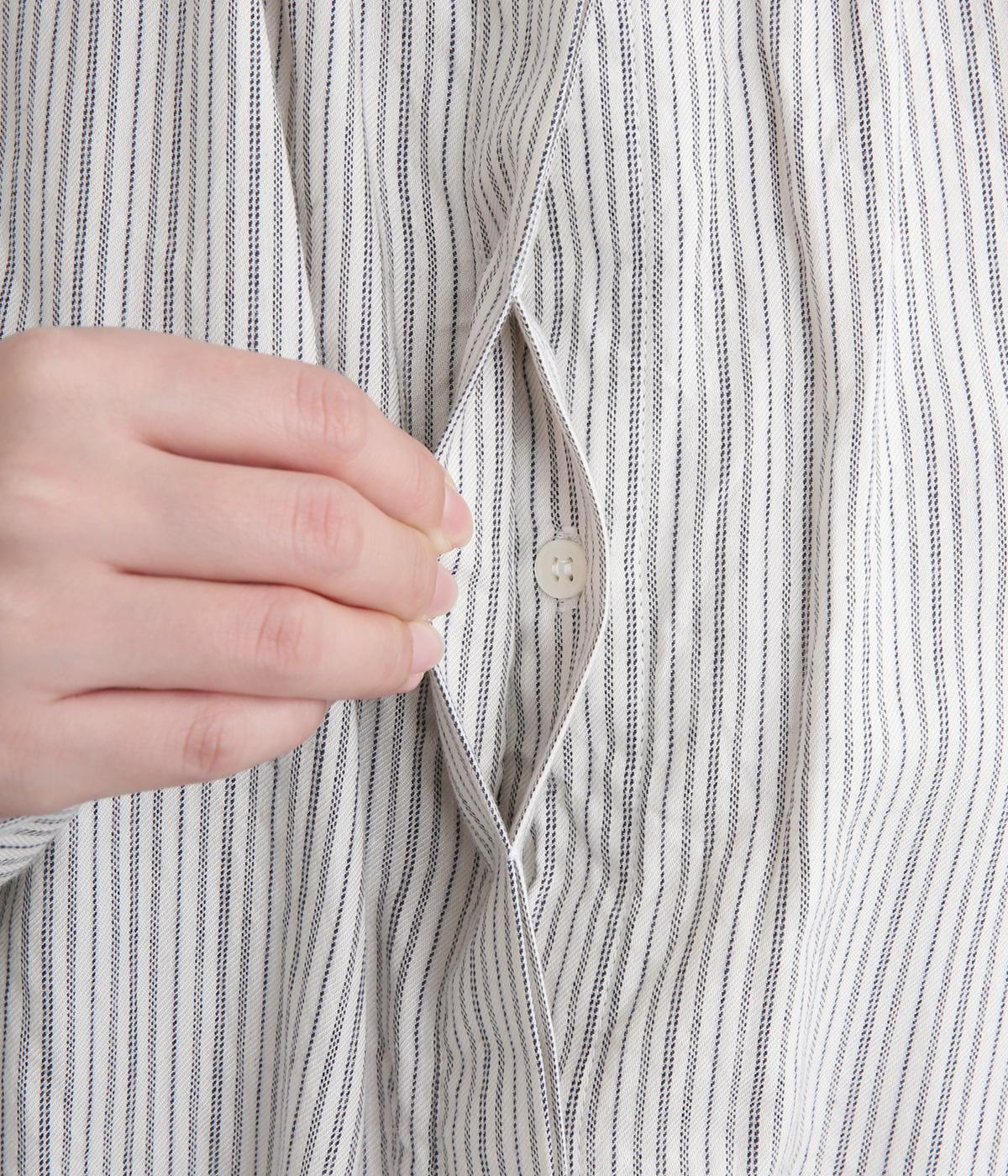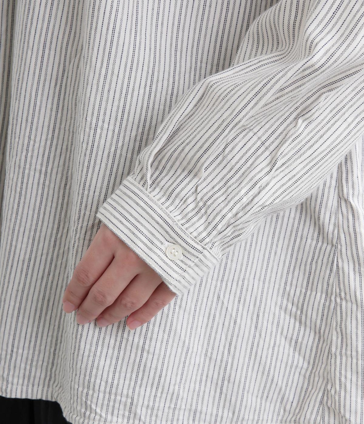 前後にたっぷりほどこしたギャザーが女性らしいシルエットをつくるシャツです。ゆったりした身幅でリラックス感のある着心地ながら、バンドカラーや比翼仕立ての前立てですっきりとバランスよく仕上げました。