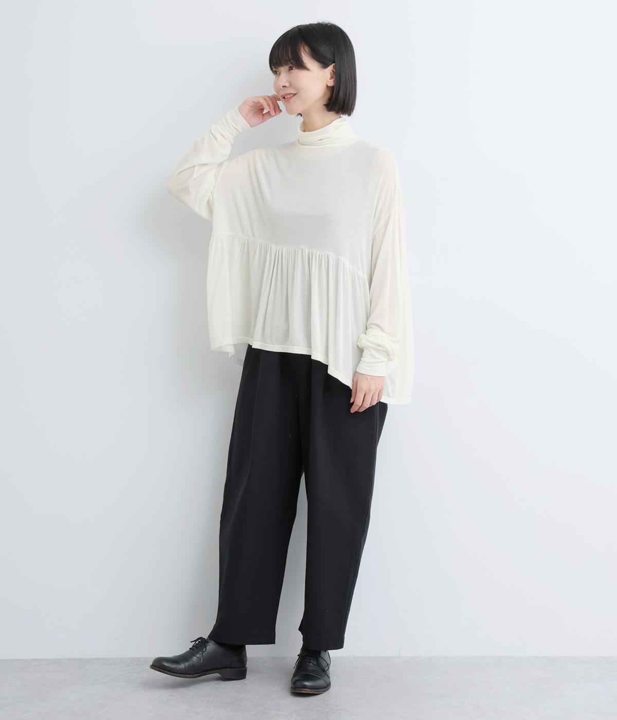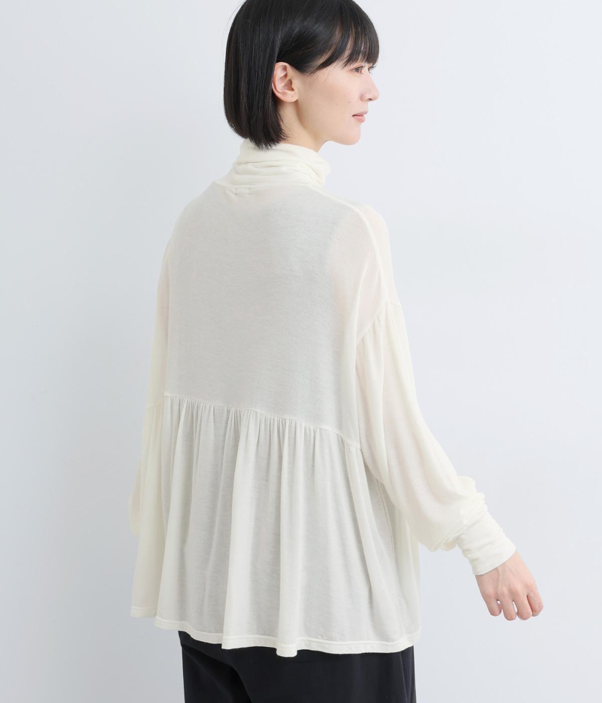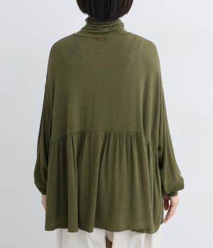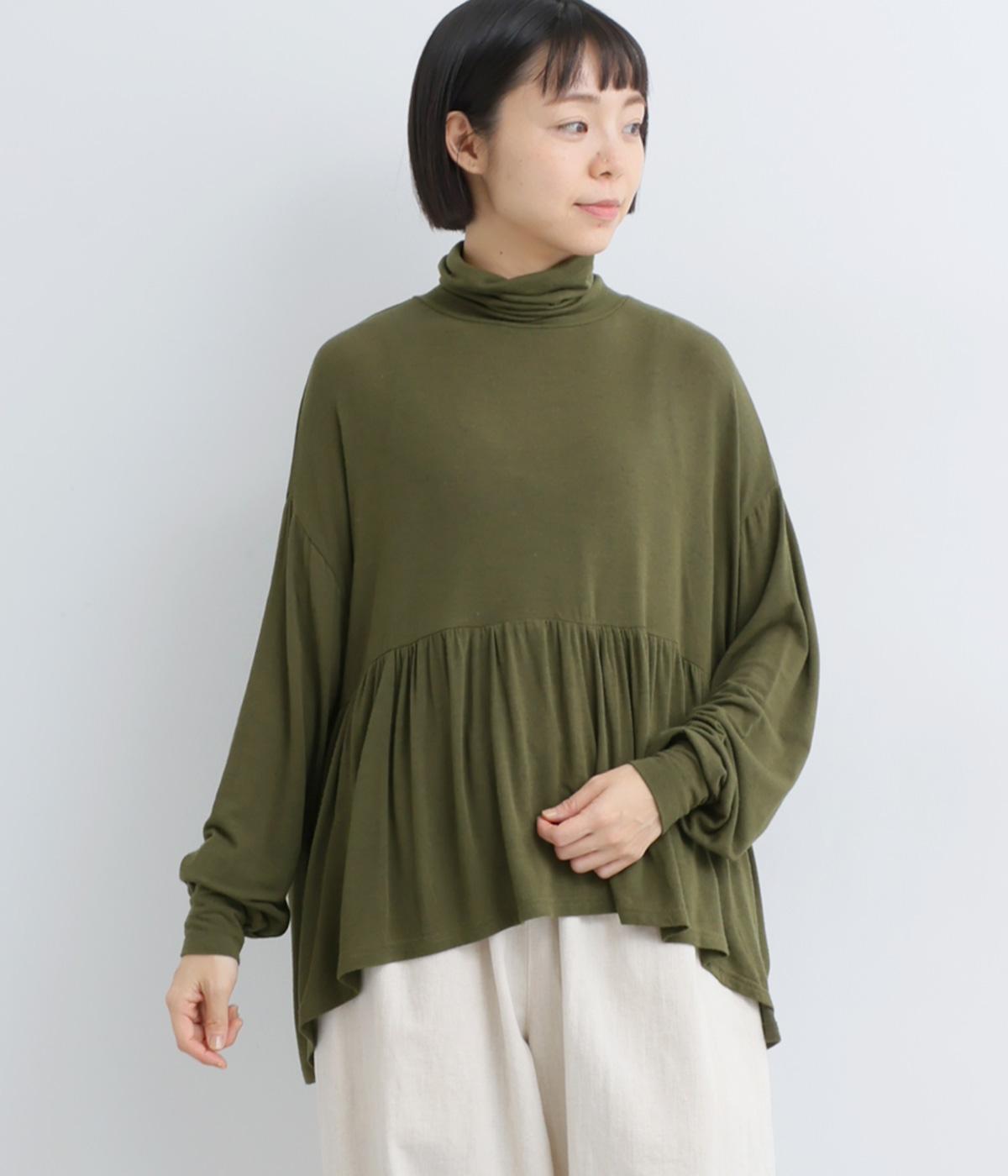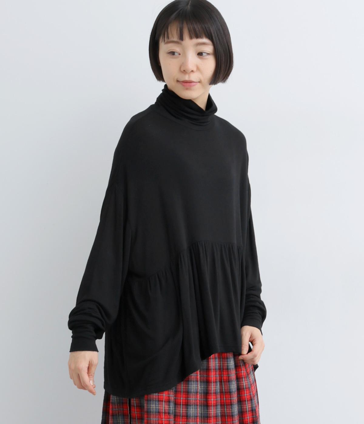 たっぷりとギャザーを入れたフェミニンなタートルネックトップス。ゆったりとした身幅と肌触りのよい生地で快適に着用できます。高めの位置で切り替えを入れることでスタイルアップの効果も。前後差をつけた着丈がお尻をカバーし、着こなしをバランスよく整えてくれます。