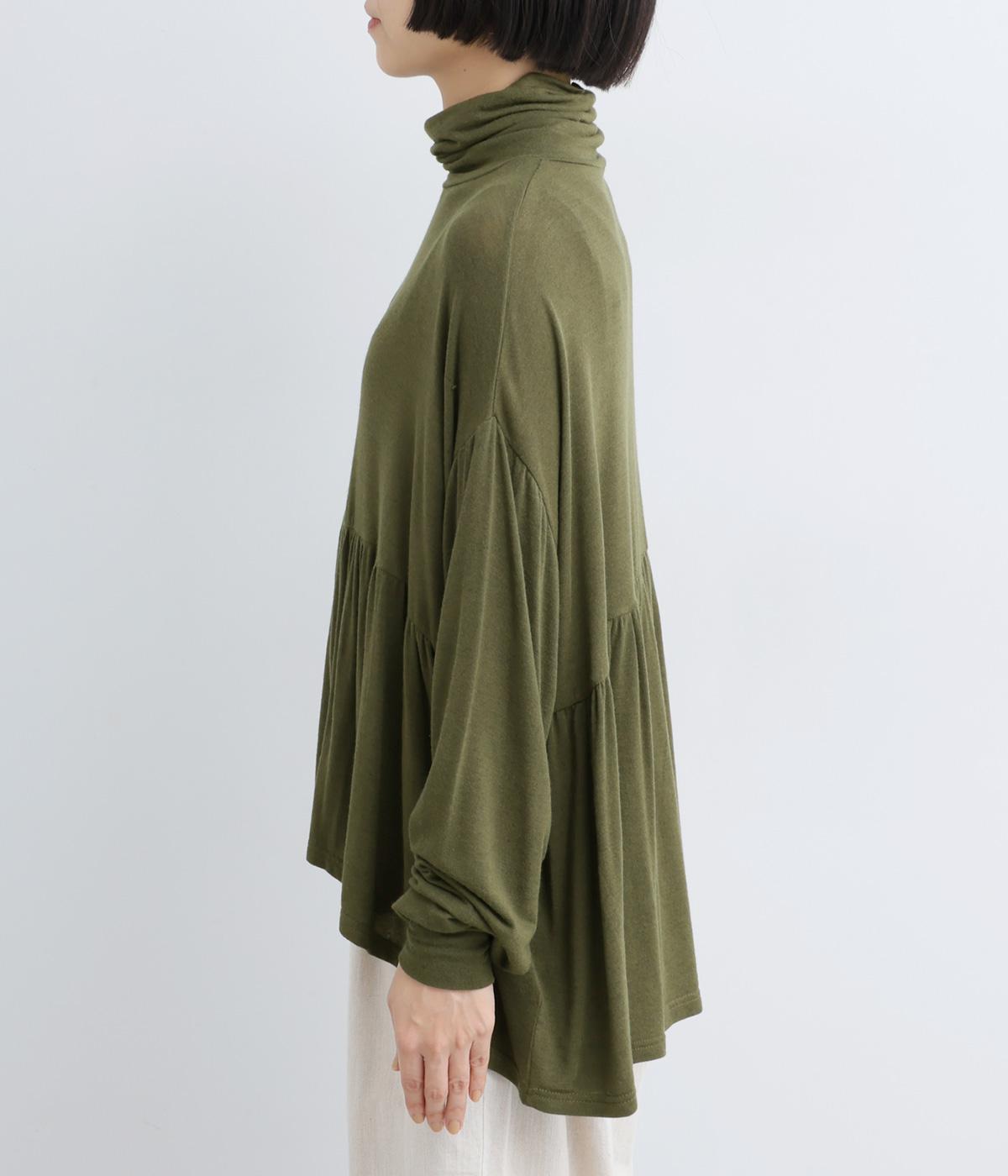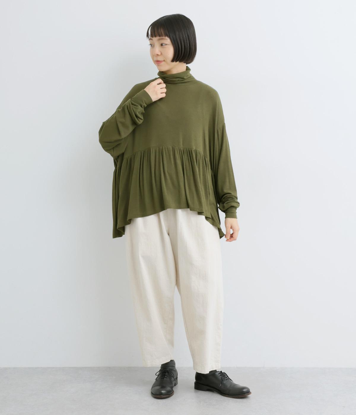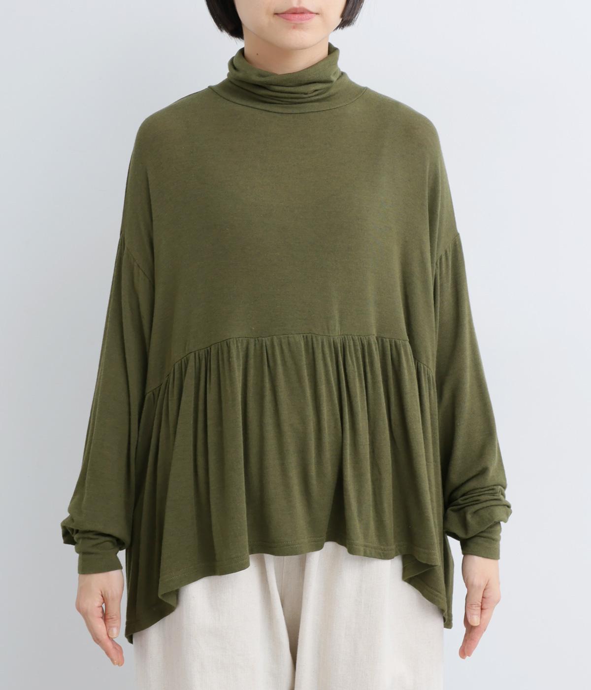 たっぷりとギャザーを入れたフェミニンなタートルネックトップス。ゆったりとした身幅と肌触りのよい生地で快適に着用できます。高めの位置で切り替えを入れることでスタイルアップの効果も。前後差をつけた着丈がお尻をカバーし、着こなしをバランスよく整えてくれます。