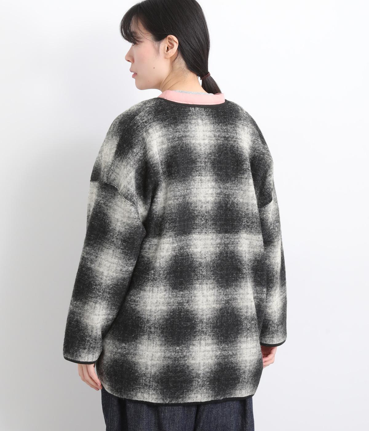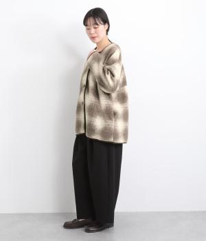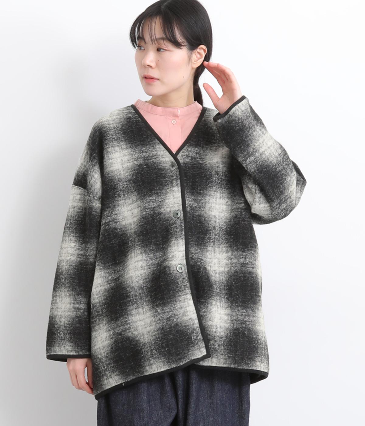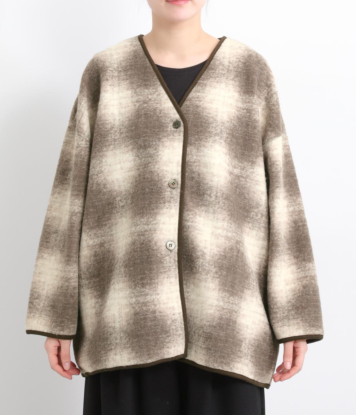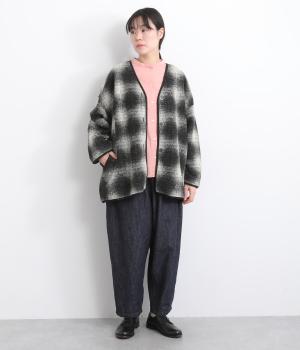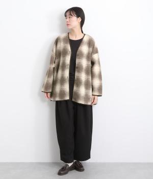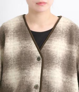 あたたかみのあるチェックの総柄をノーカラーとパイピングですっきりとまとめたカーディガン。個性を放ちつつスタイリングにすっとなじみ幅広いコーディネートを楽しめます。ゆったりシルエットでインナーを選ばないのも◎。