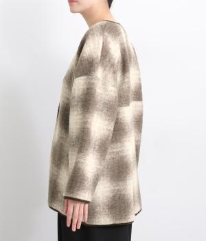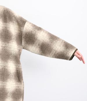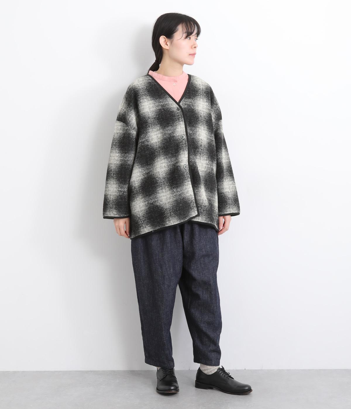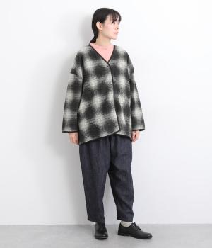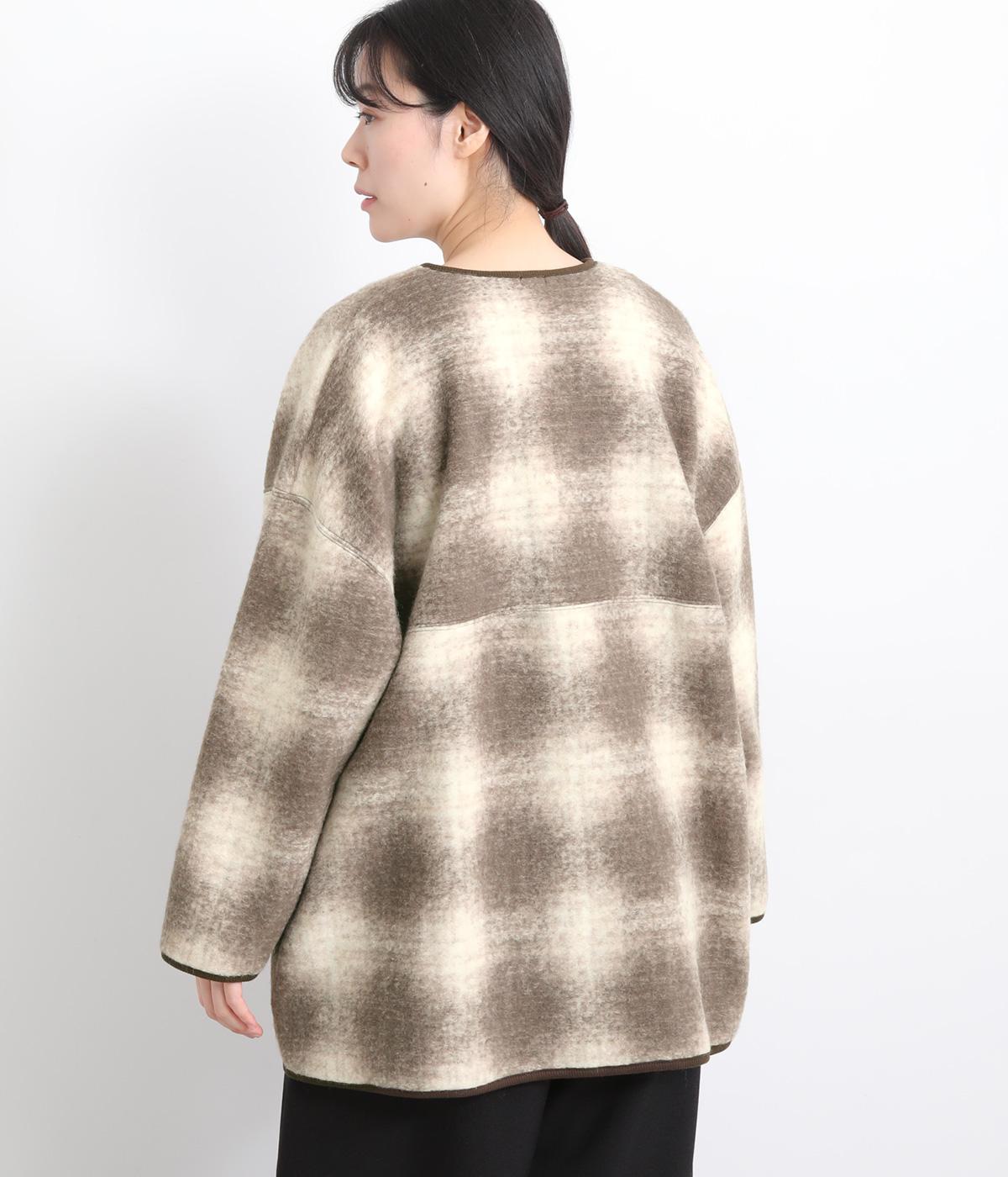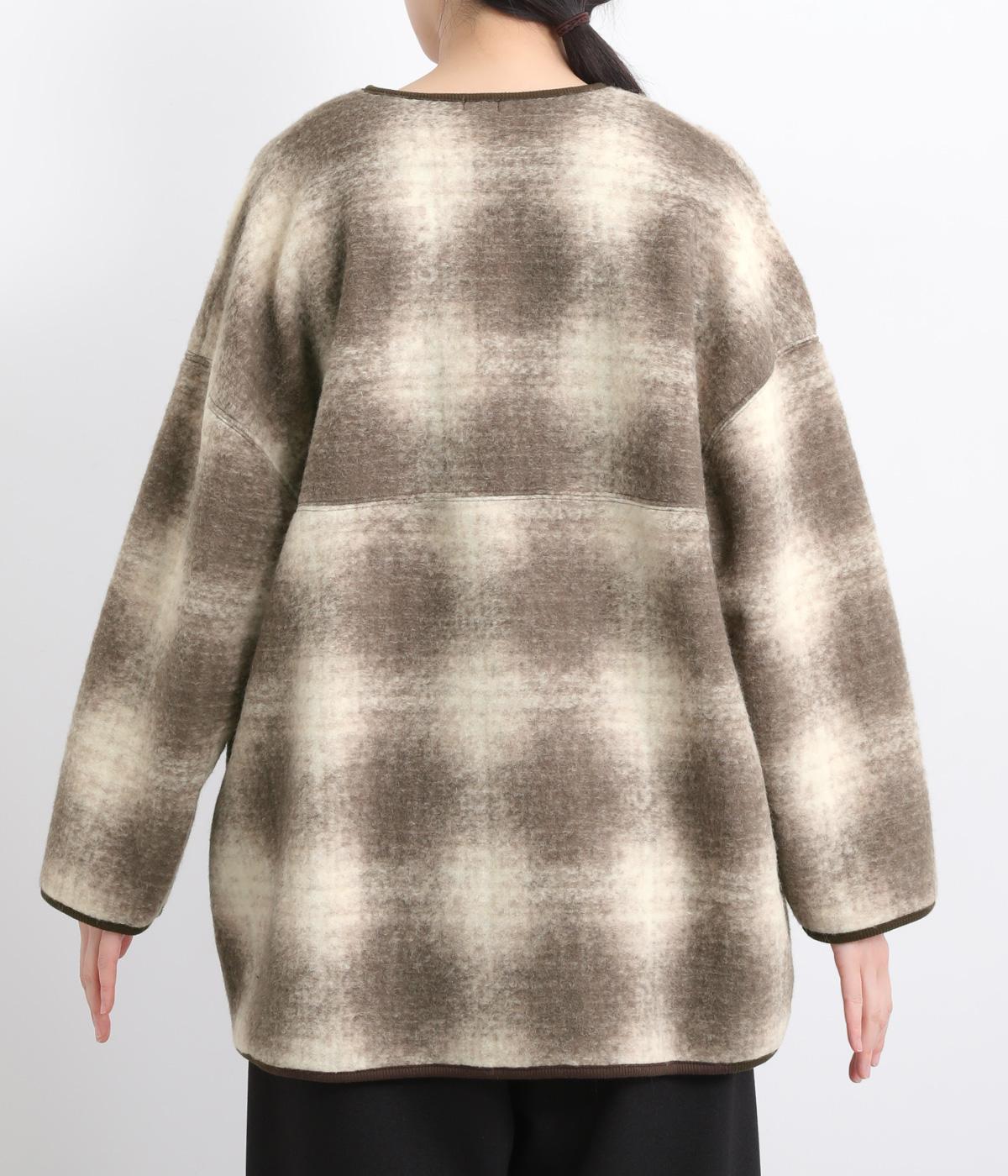 あたたかみのあるチェックの総柄をノーカラーとパイピングですっきりとまとめたカーディガン。個性を放ちつつスタイリングにすっとなじみ幅広いコーディネートを楽しめます。ゆったりシルエットでインナーを選ばないのも◎。