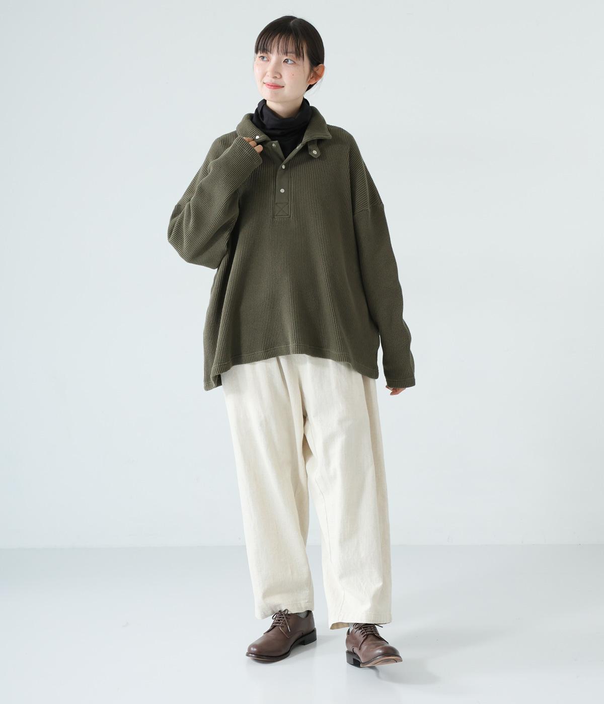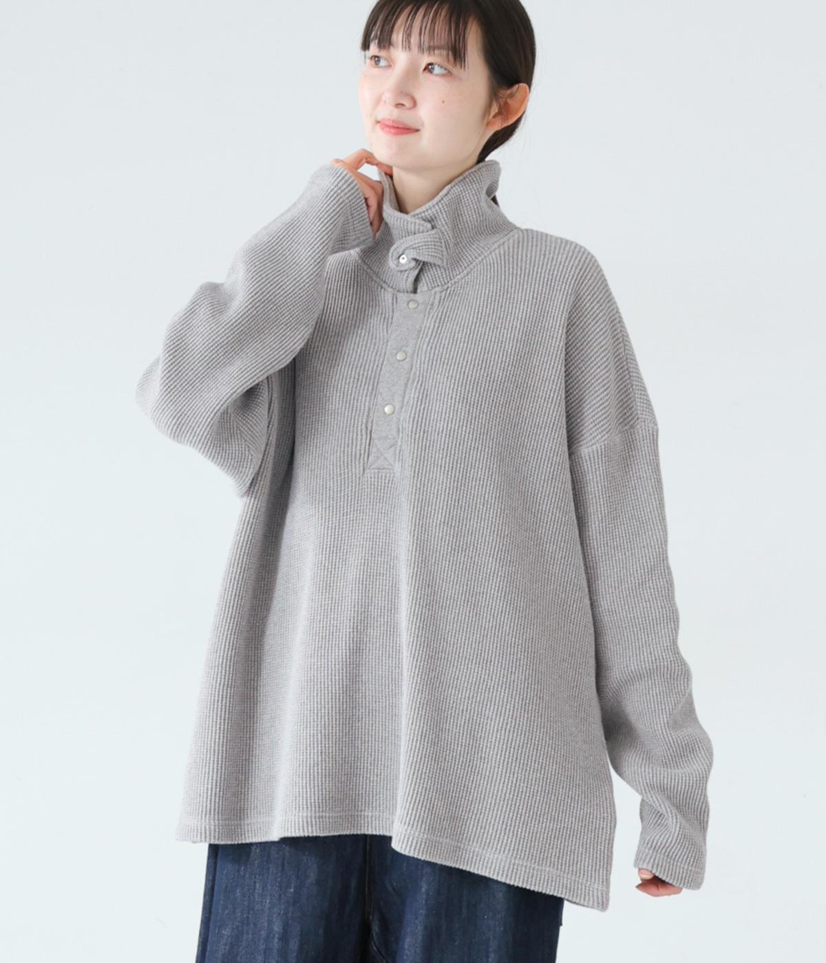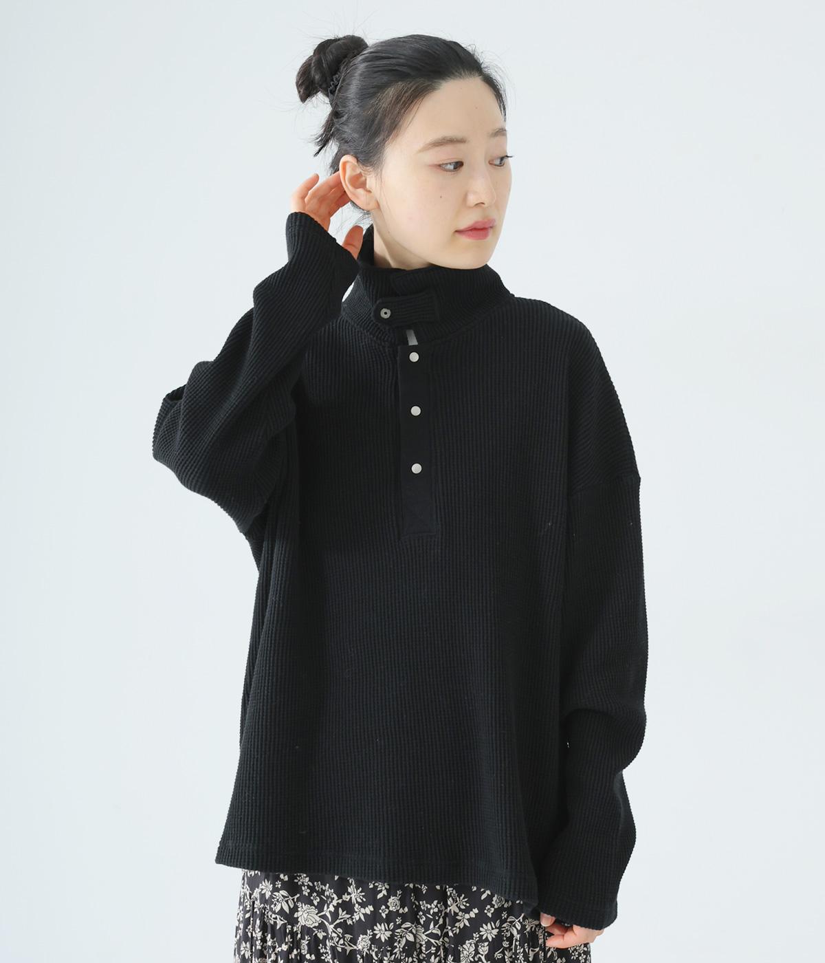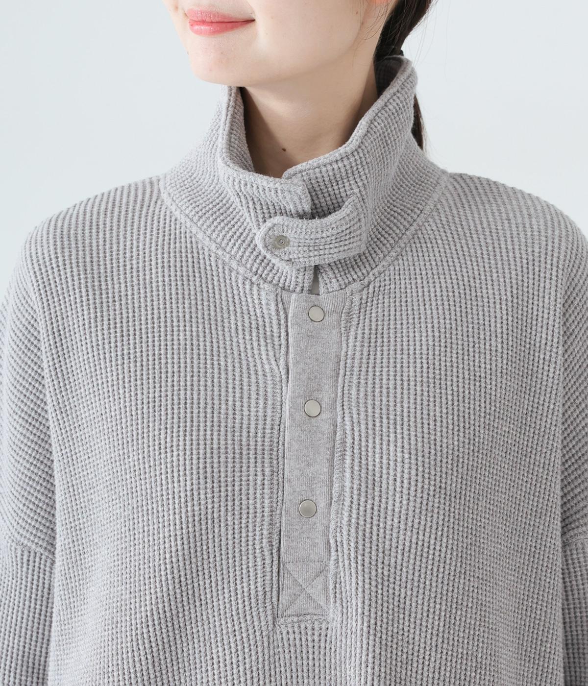 ドロップショルダーとゆとりのある身幅でこなれ感たっぷりに仕上げたプルオーバー。襟元はスナップボタン仕様になっており、留め具合で表情の変化をたのしめます。タブを留めれば、ハイネックにもアレンジ可能。シンプルながらも着こなしの幅が広がります。