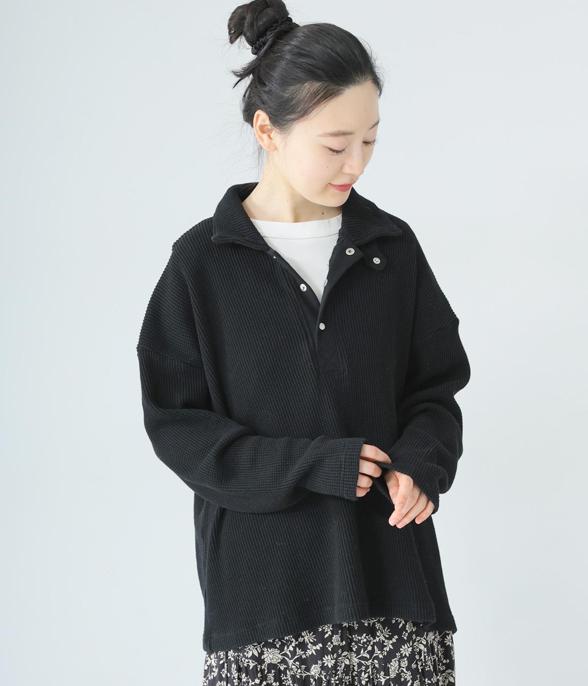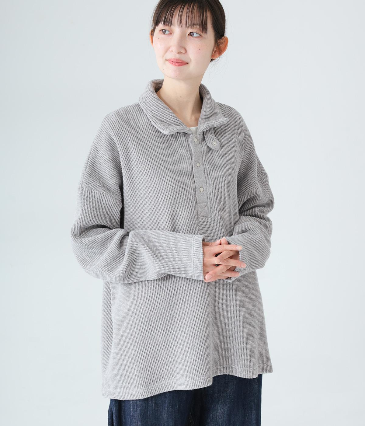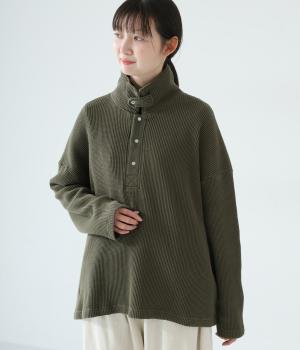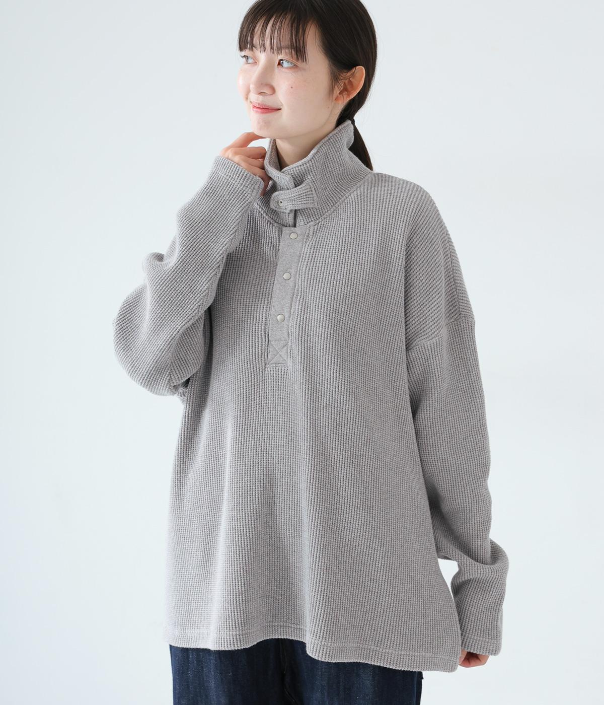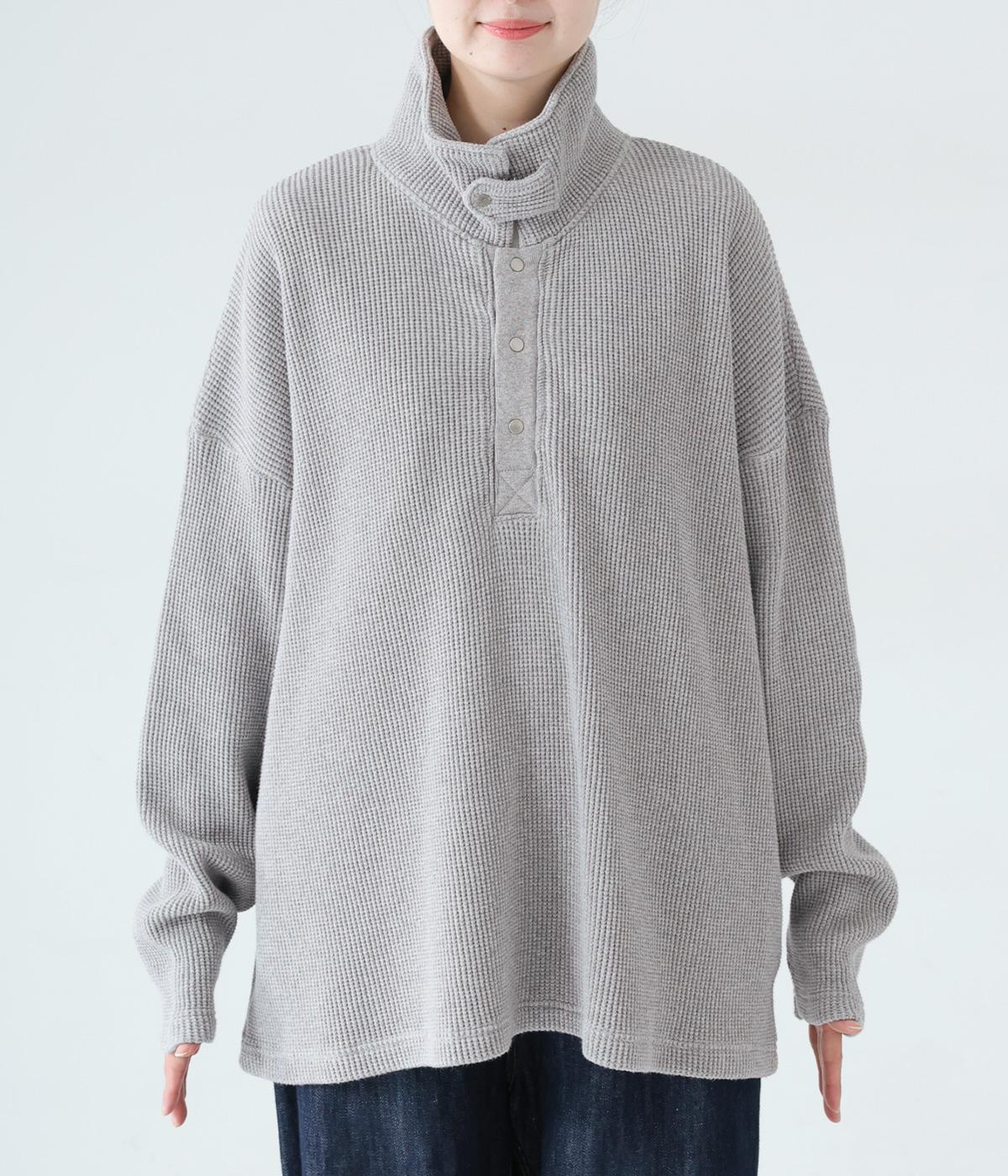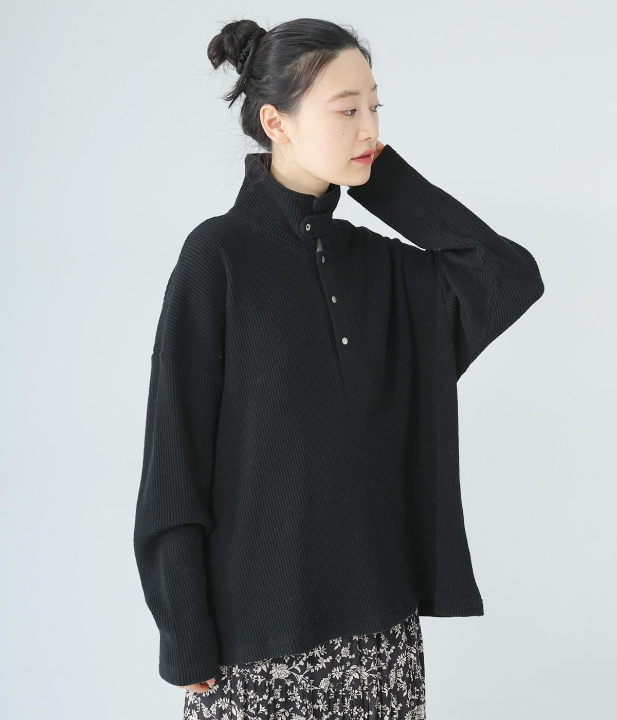 ドロップショルダーとゆとりのある身幅でこなれ感たっぷりに仕上げたプルオーバー。襟元はスナップボタン仕様になっており、留め具合で表情の変化をたのしめます。タブを留めれば、ハイネックにもアレンジ可能。シンプルながらも着こなしの幅が広がります。