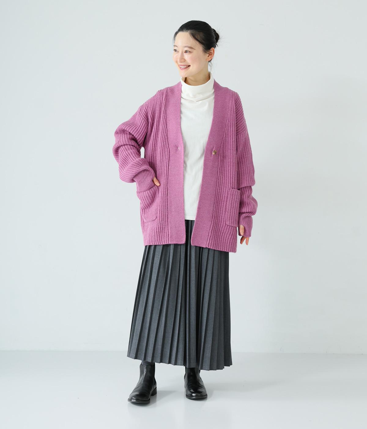 ひとつボタンのデザインで大人らしい抜け感を演出したカーディガン。リブ編みが縦ラインを強調してすっきり見えを叶えてくれます。ヒップをおおう安心感のある着丈が◎。袖口は親指を通せるサムホールつきで、長い袖が手元まであたためてくれます。