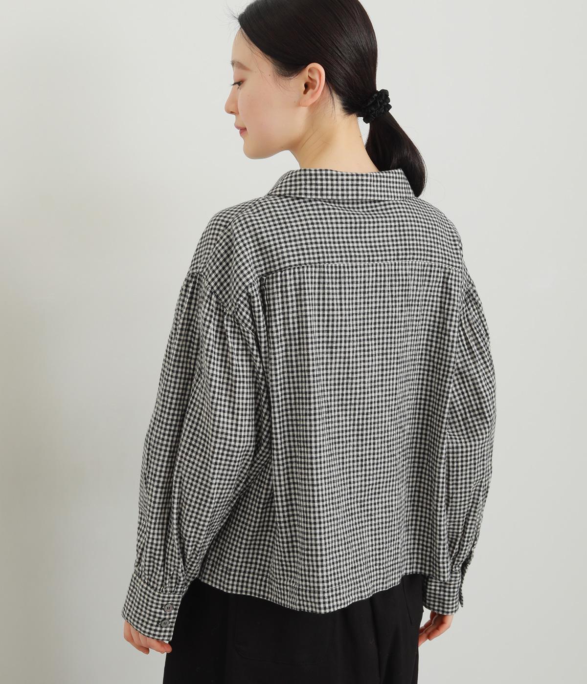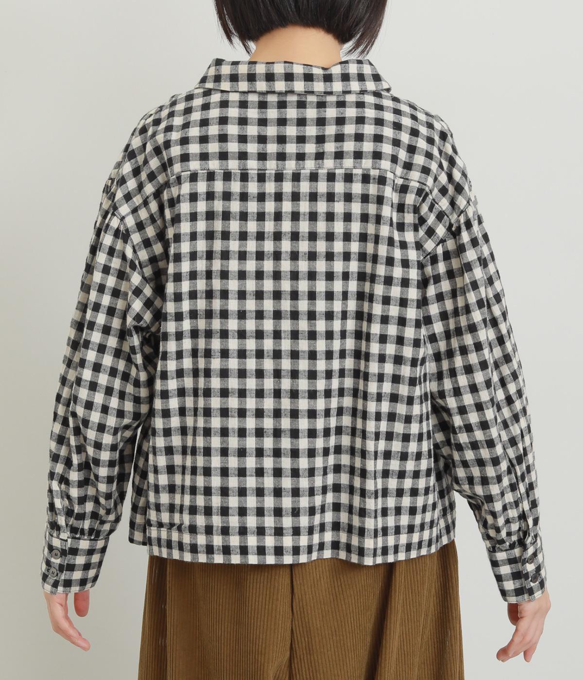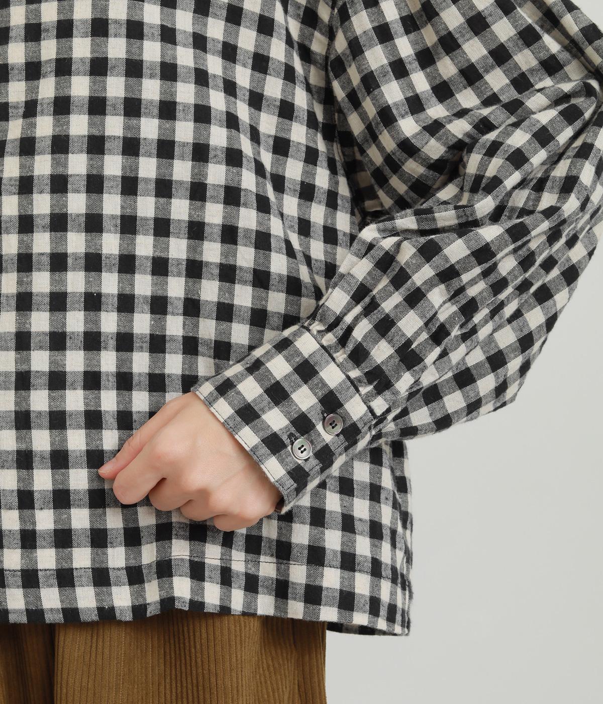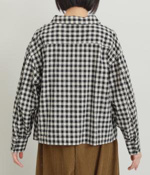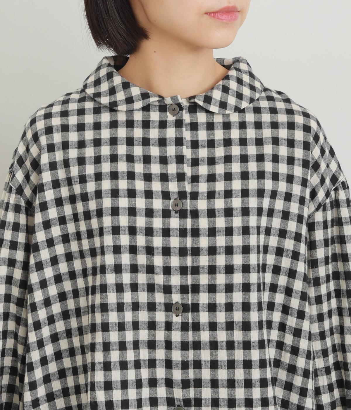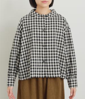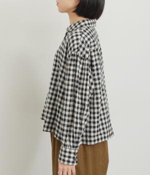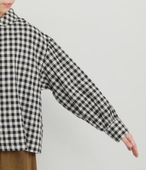モノトーンのチェック柄を活かしてスタンダードに仕立てたシャツ。小さめの丸襟やギャザーを寄せたカフス袖で、ほんのすこしガーリーな要素を加えました。身頃はすっきりとボトム合わせしやすく、羽織りにもなる前あき仕様です。
