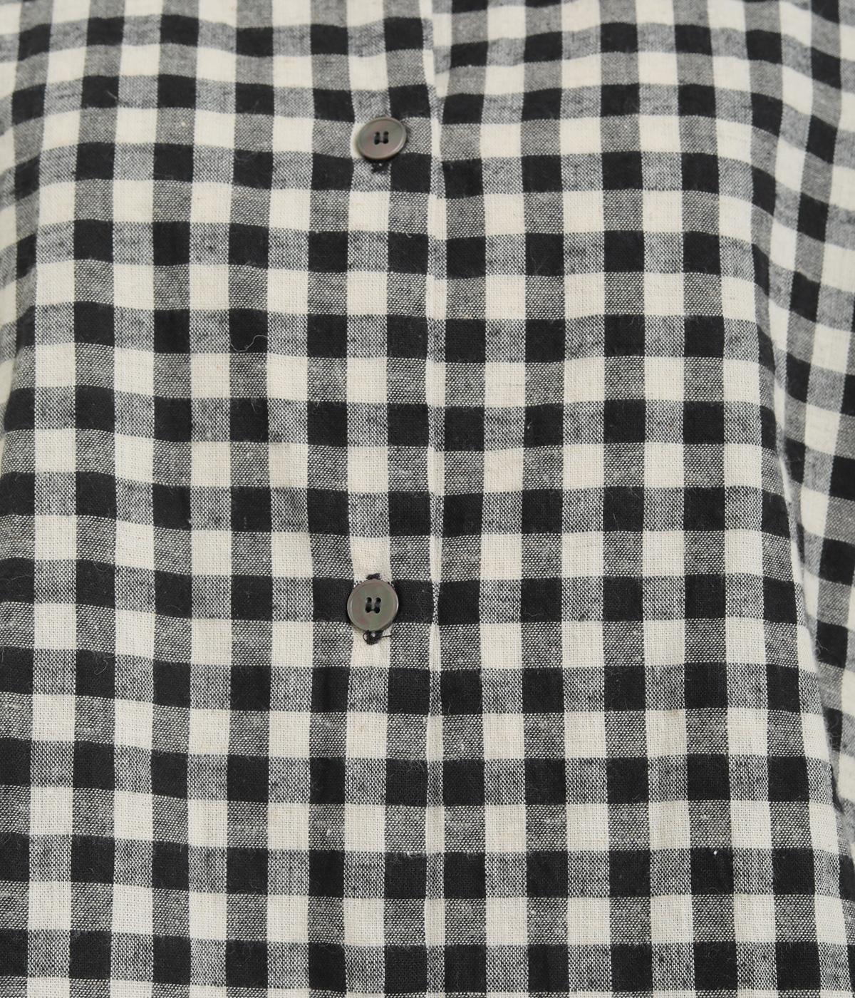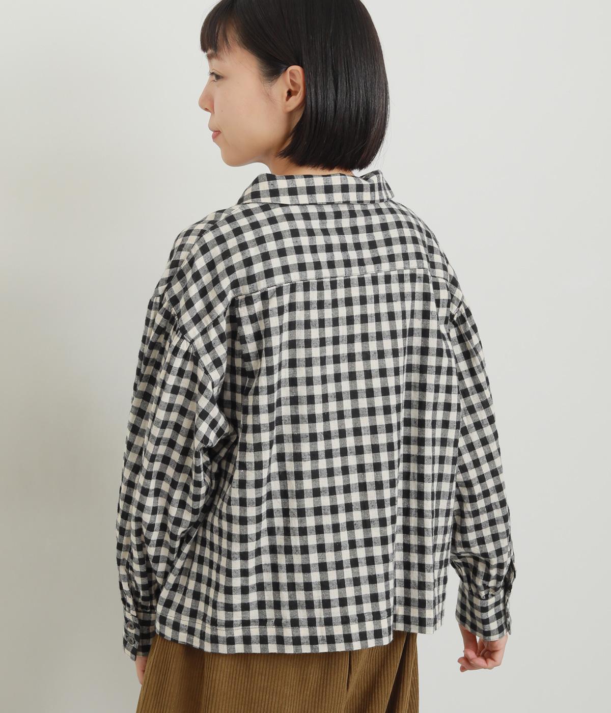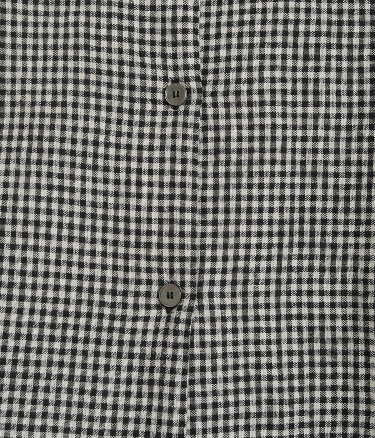 モノトーンのチェック柄を活かしてスタンダードに仕立てたシャツ。小さめの丸襟やギャザーを寄せたカフス袖で、ほんのすこしガーリーな要素を加えました。身頃はすっきりとボトム合わせしやすく、羽織りにもなる前あき仕様です。