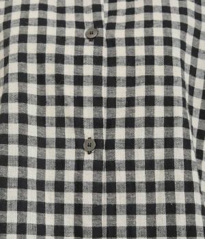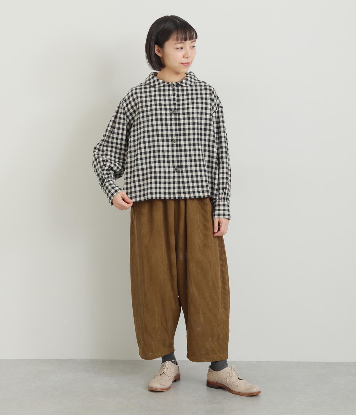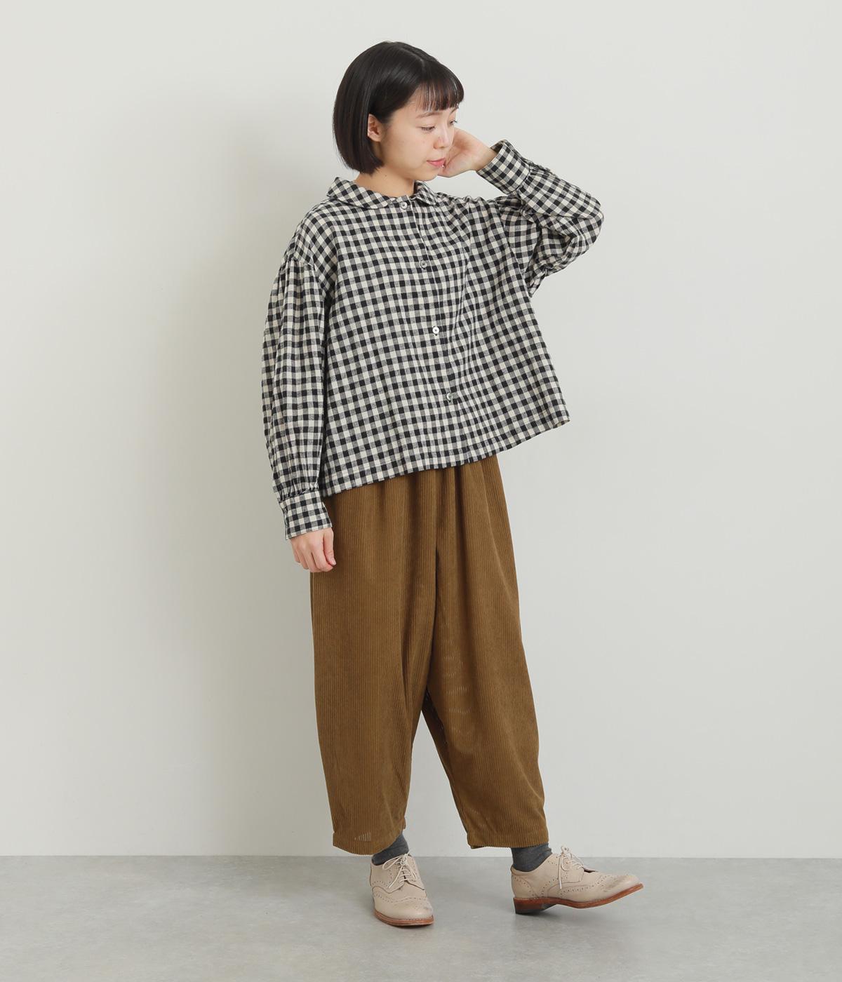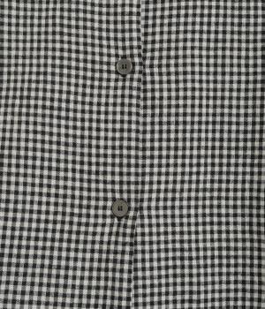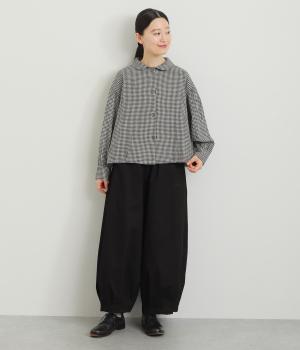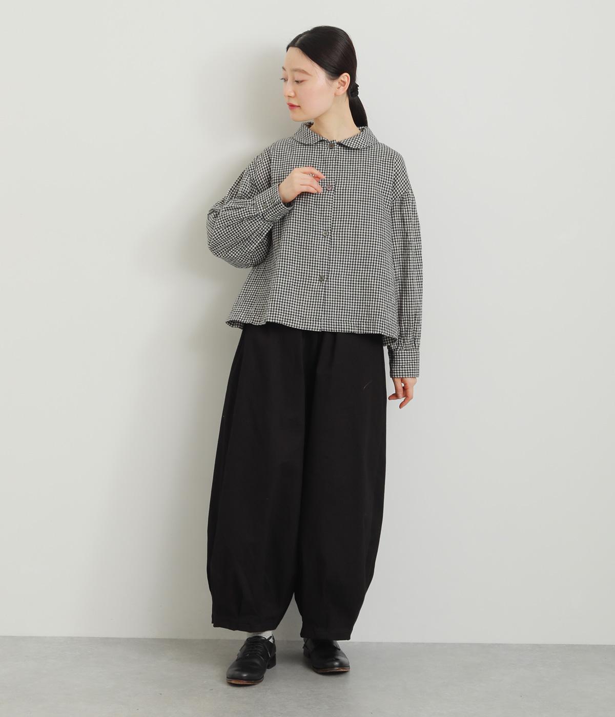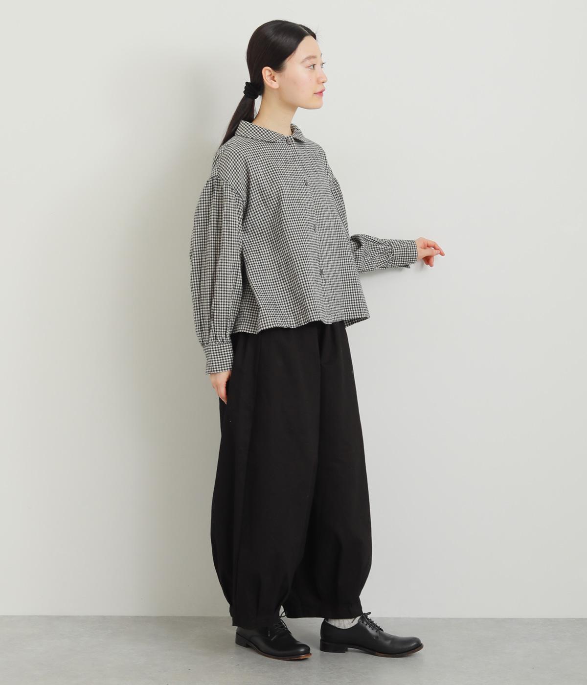 モノトーンのチェック柄を活かしてスタンダードに仕立てたシャツ。小さめの丸襟やギャザーを寄せたカフス袖で、ほんのすこしガーリーな要素を加えました。身頃はすっきりとボトム合わせしやすく、羽織りにもなる前あき仕様です。
