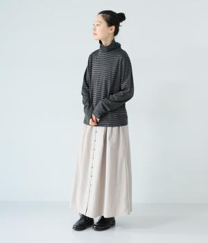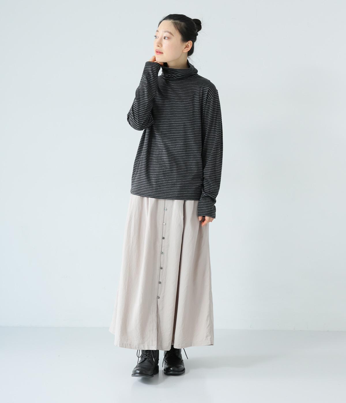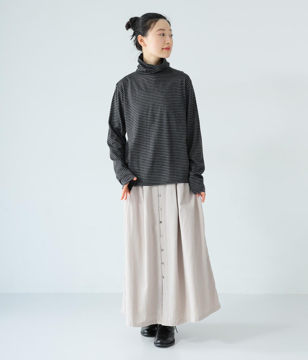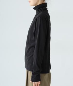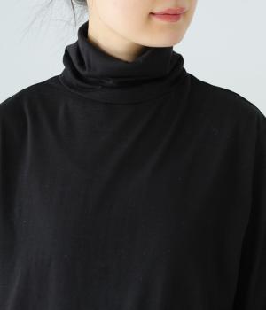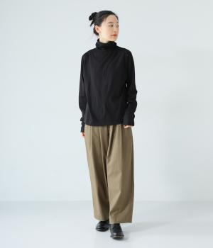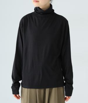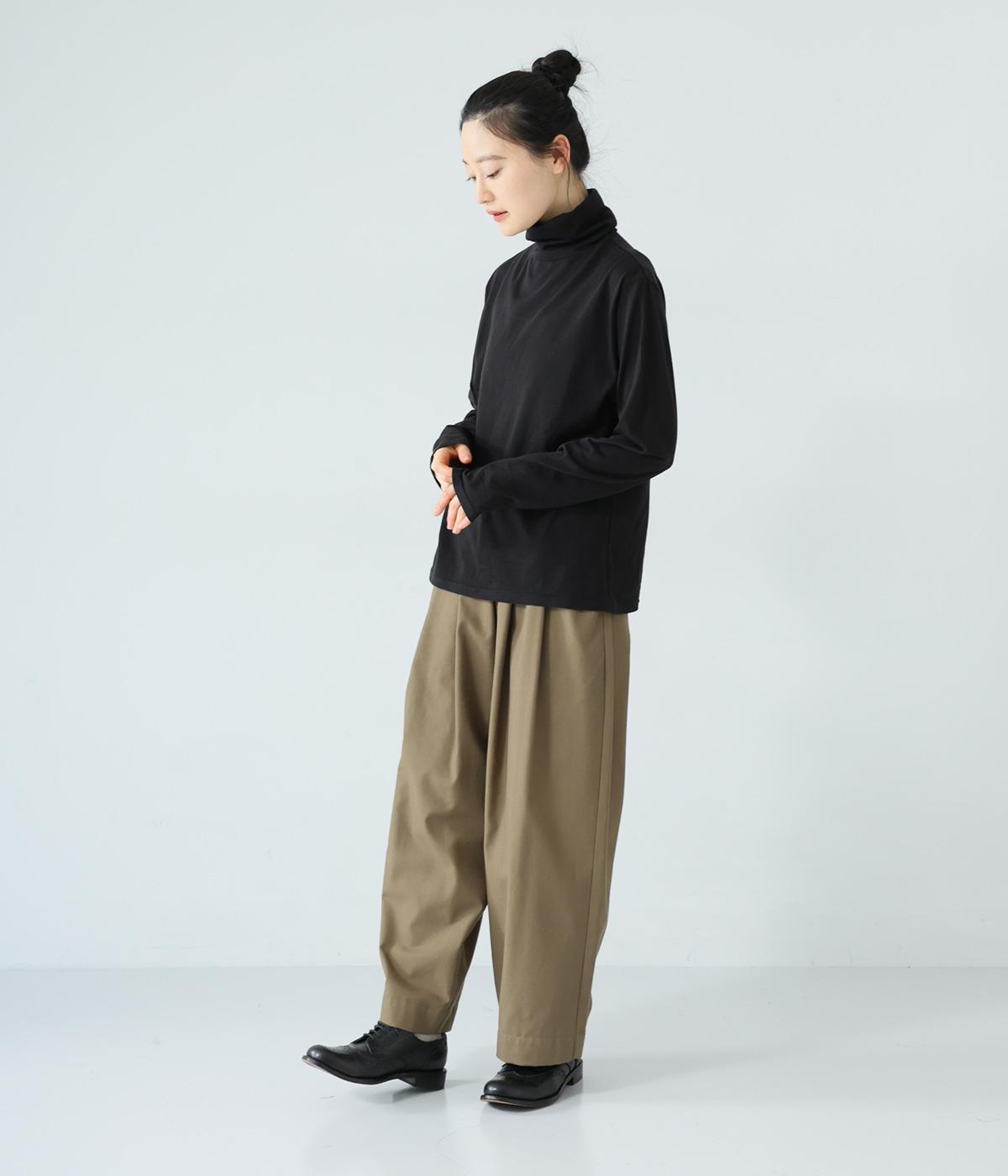 着まわし力の高いシンプルなタートルネックカットソー。全体にほどよくゆとりがあり、ぴたっとしすぎないので一枚でも着やすいのが◎です。長めの袖丈と、自然にくしゅっとさせたネックが大人らしいこなれ感を演出します。