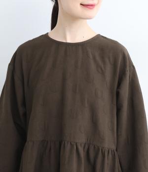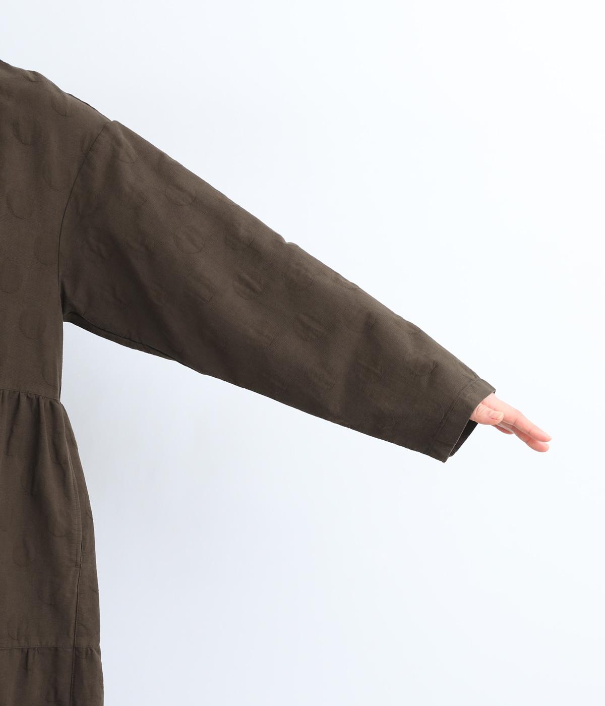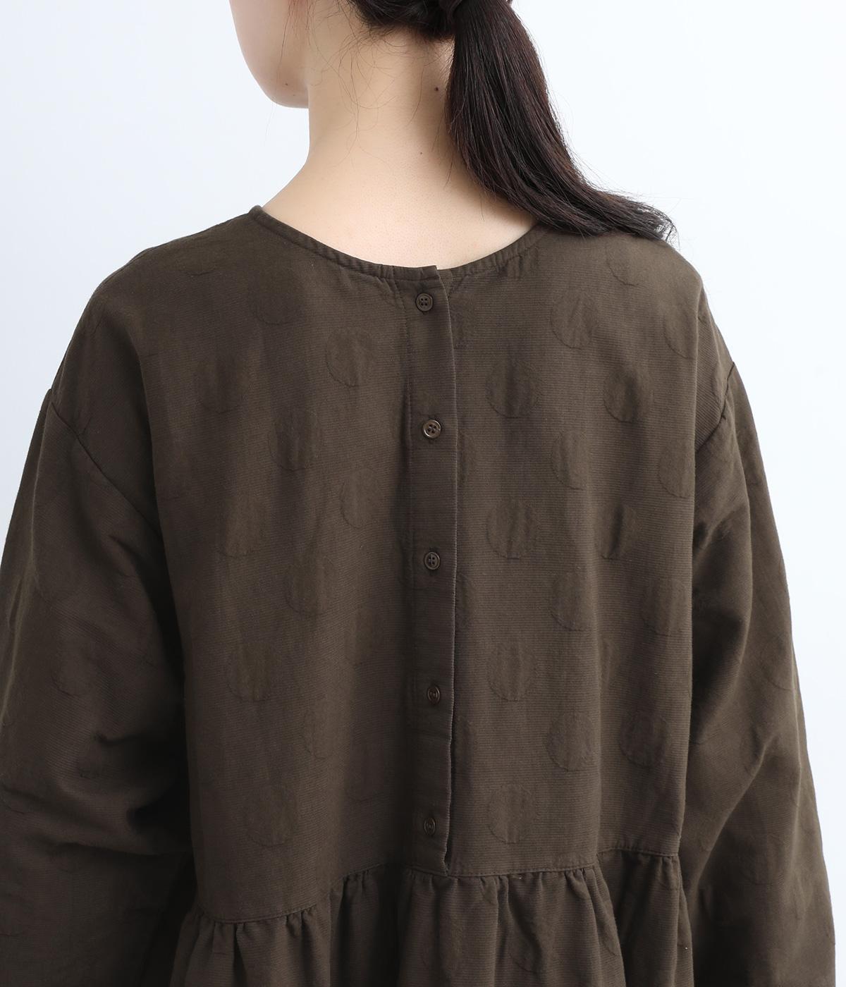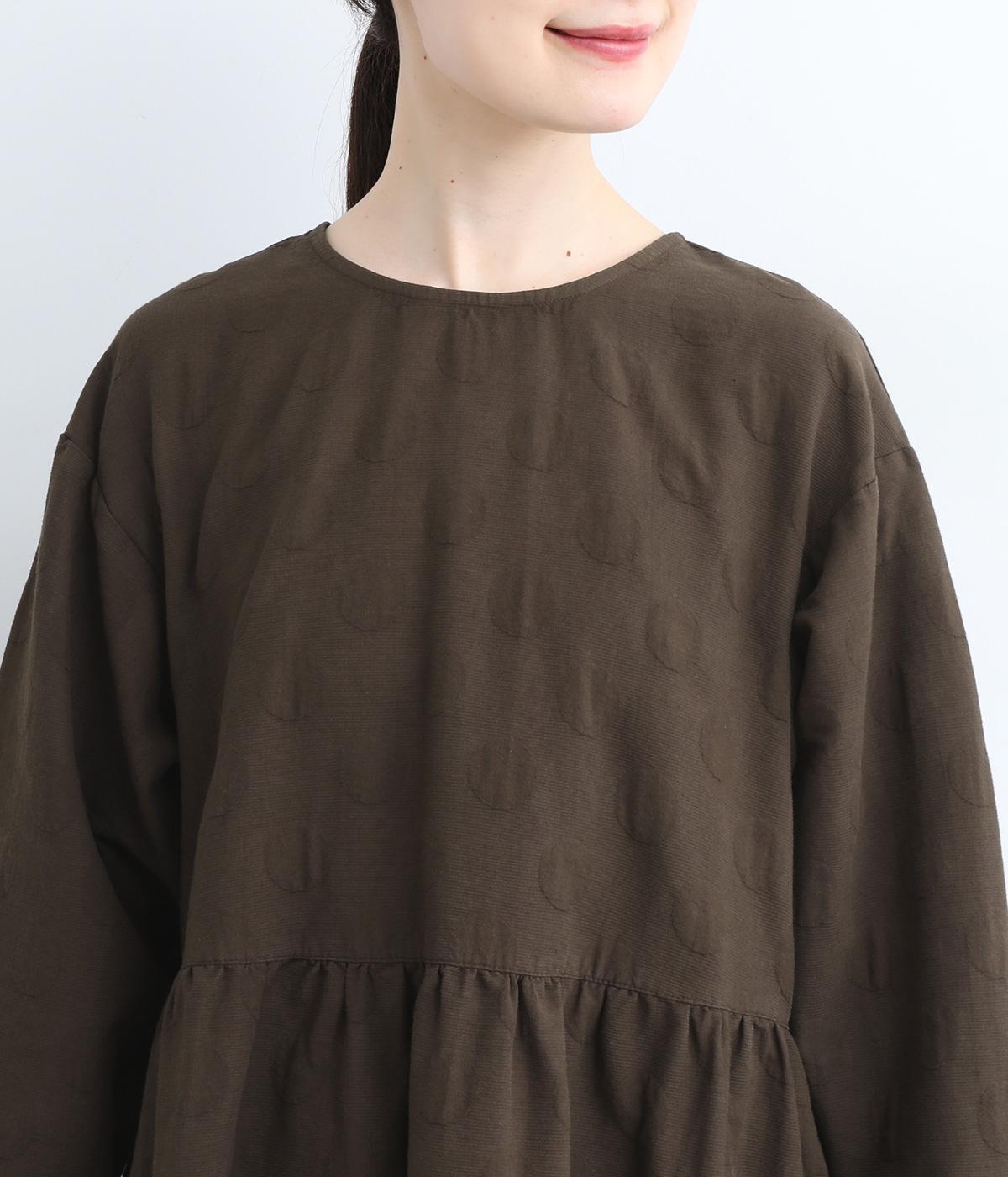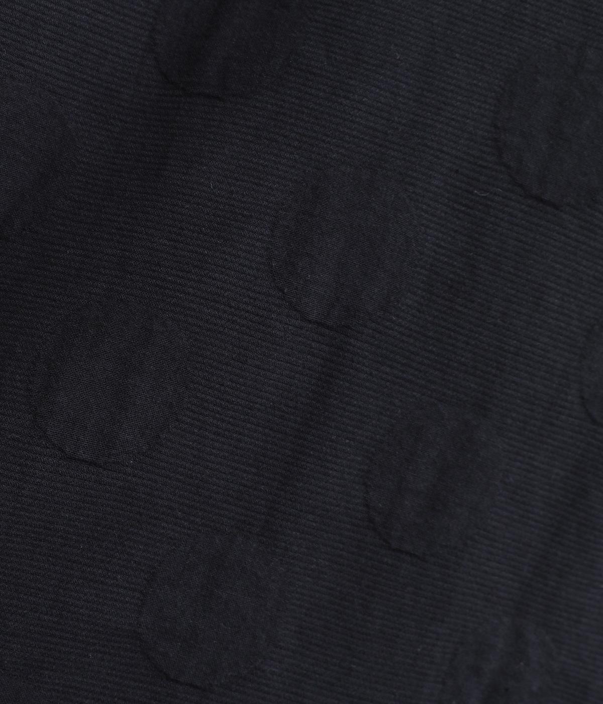 さり気なく表情をつけてくれるドットジャカードのコットン生地を使用。使い勝手のいい薄め中厚手のしっかりとした生地感で、縫製後の製品染めによるヴィンテージ感のある風合いがたのしめます。