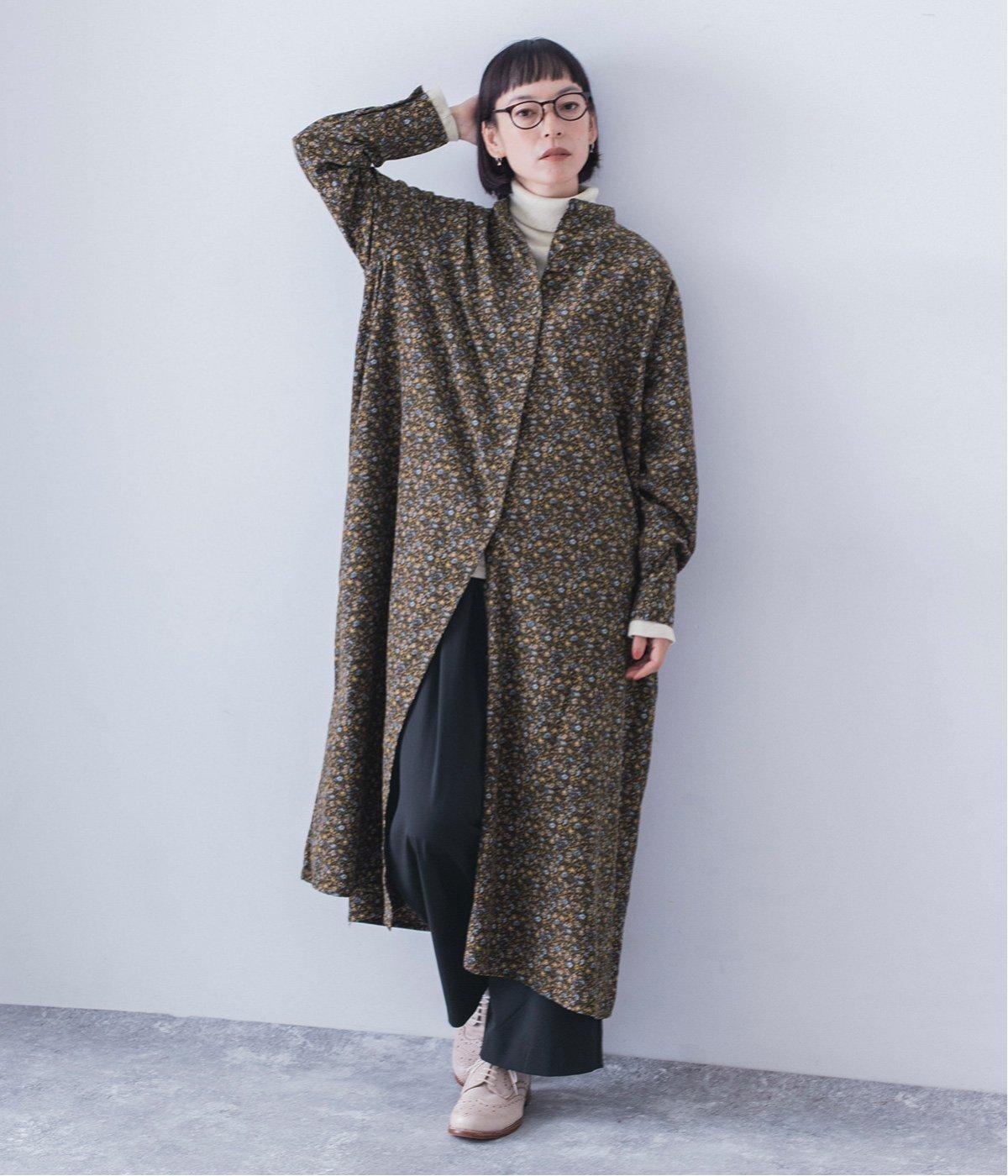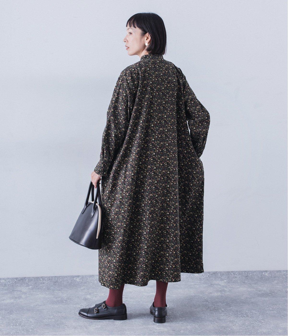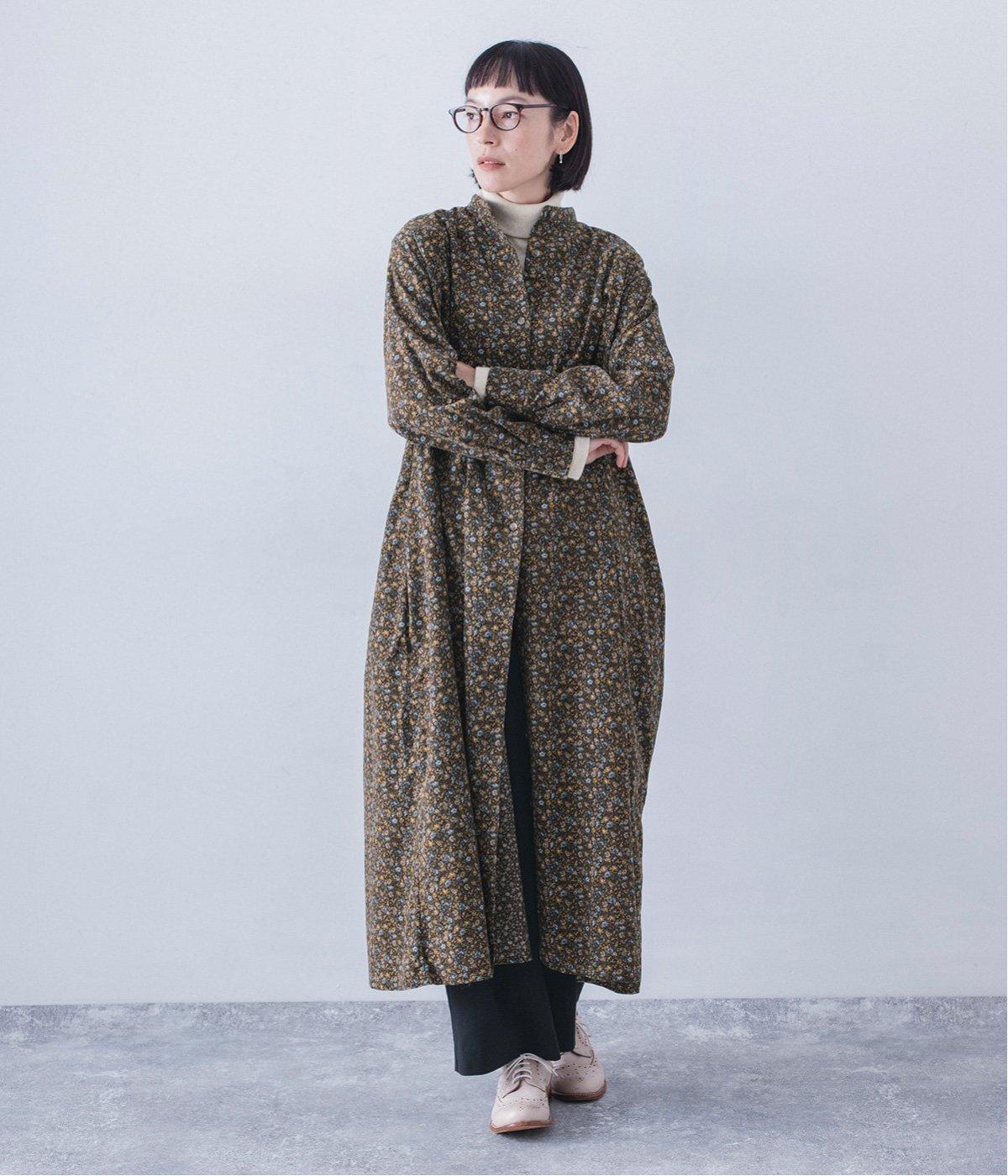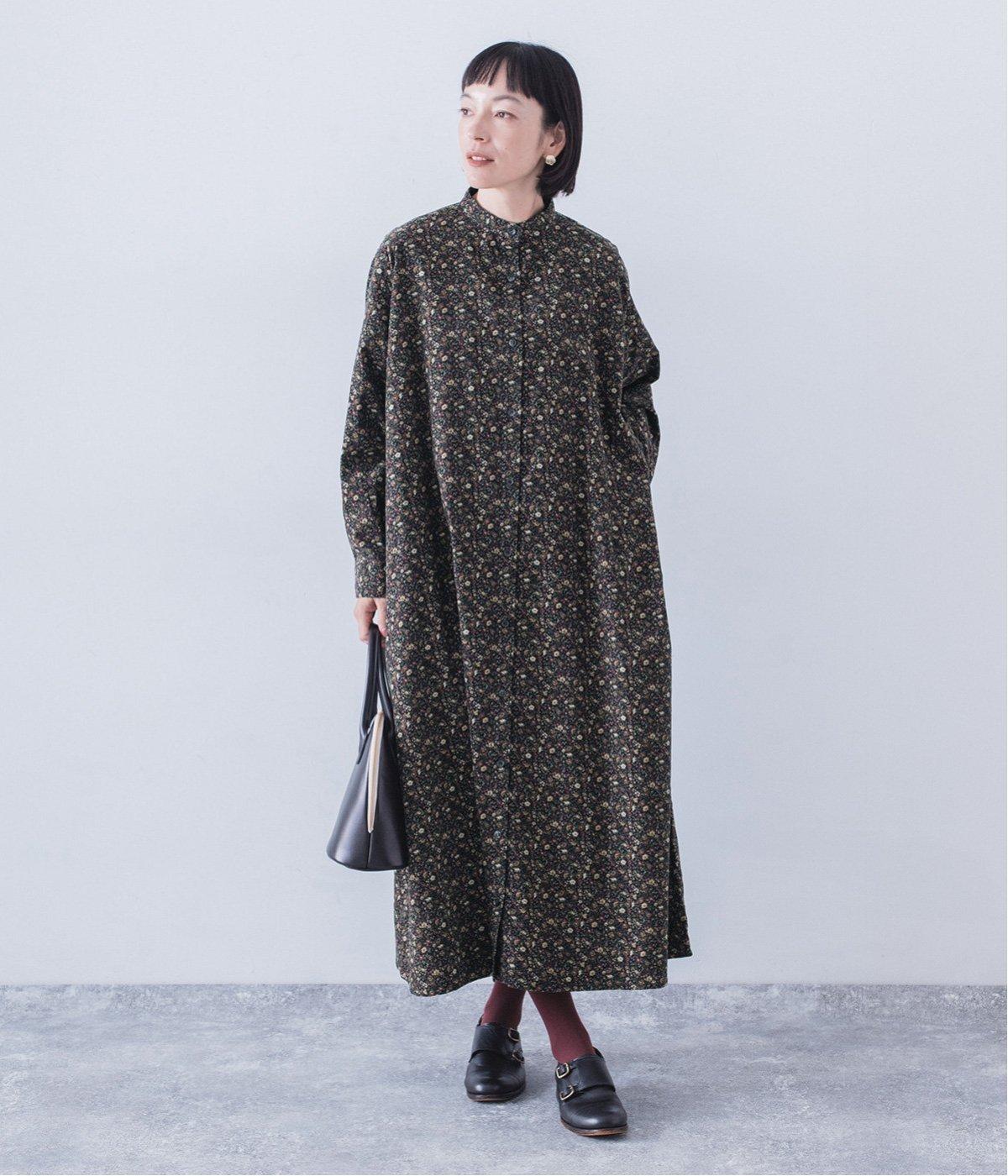 レトロさのあるクラシカルな総花柄で着映え力のあるワンピース。ゆるやかに広がるシンプルなAラインシルエットも雰囲気を盛り上げ、顔まわりはバンドカラーですっきりバランスよく。前あきの羽織りスタイルもお洒落度アップ。