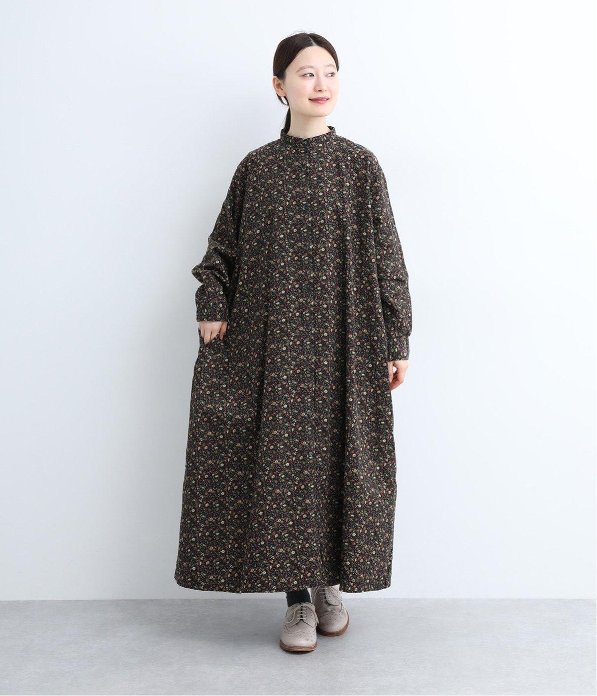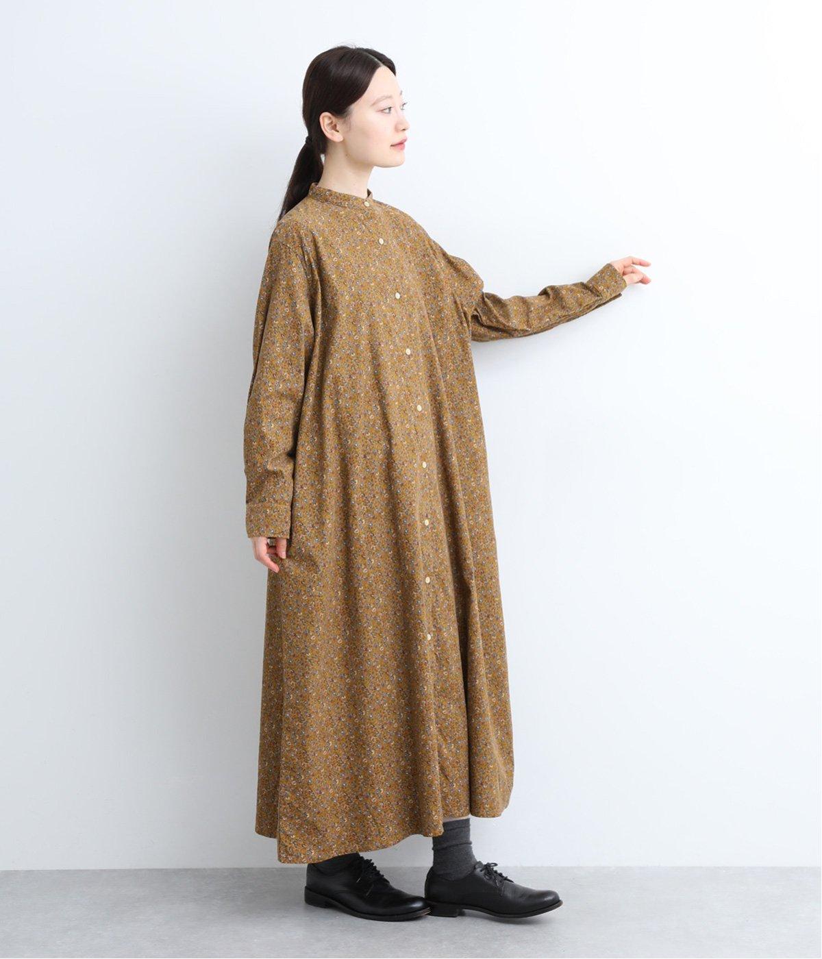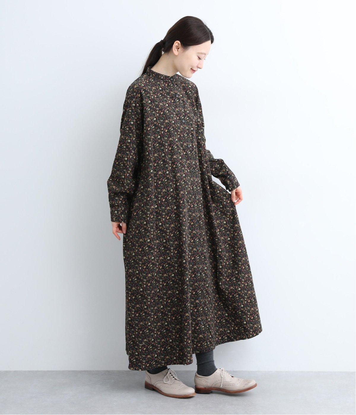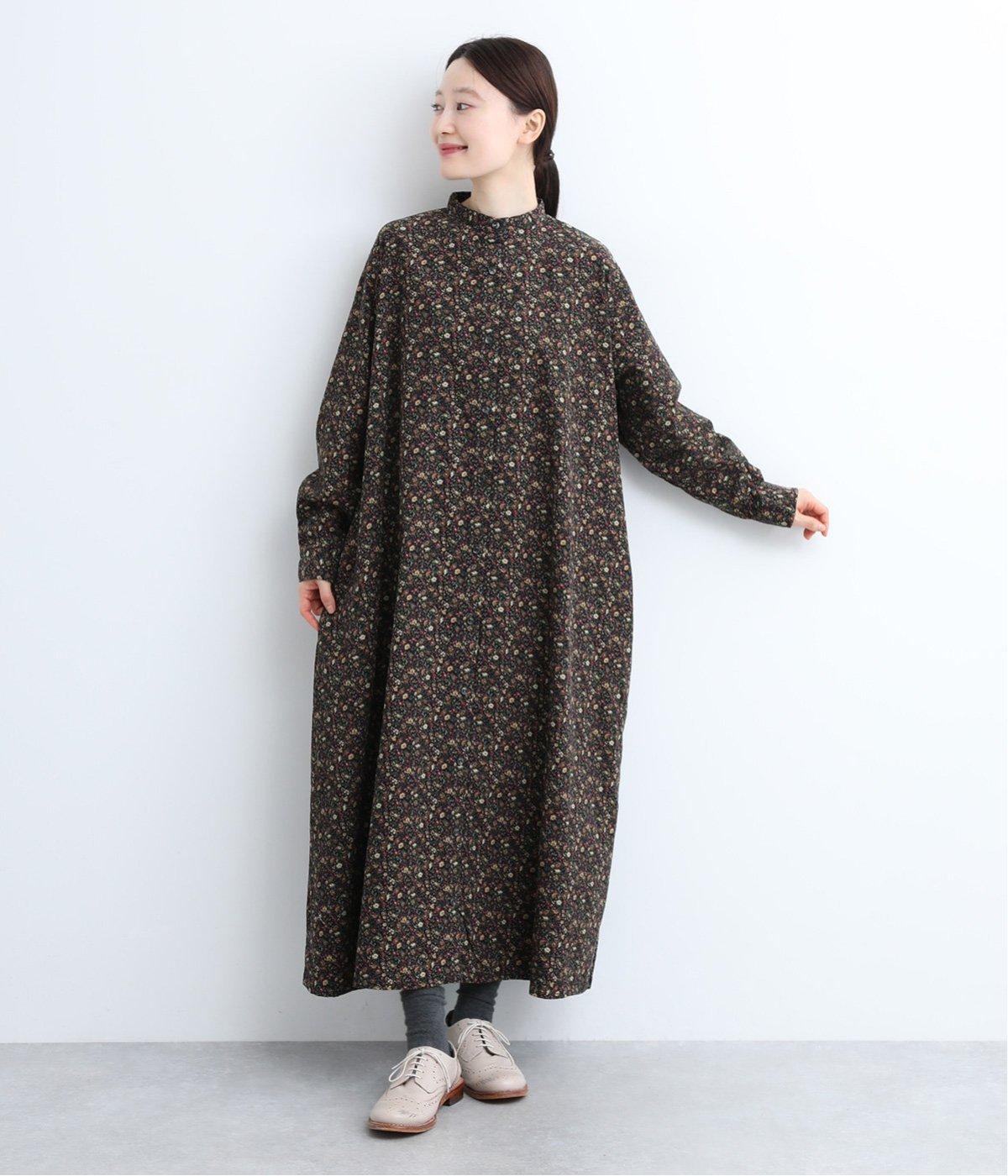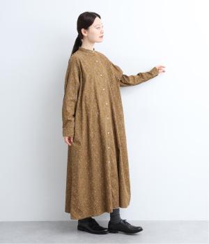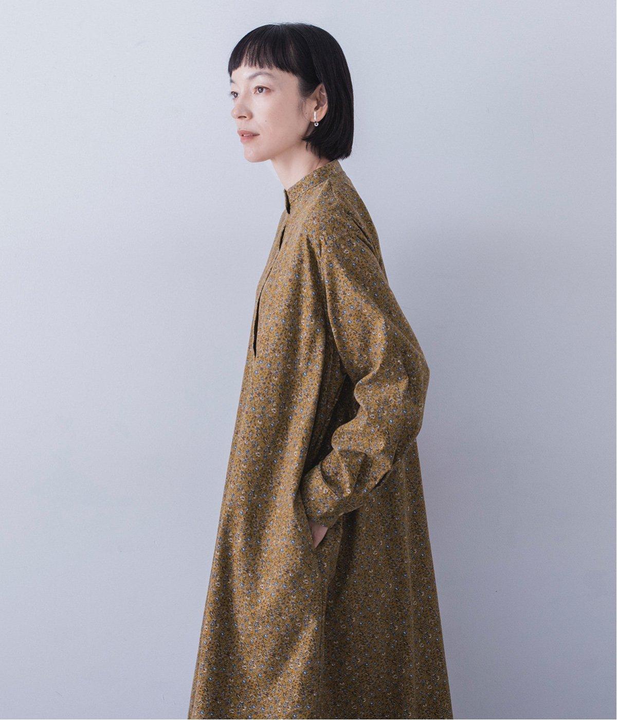 レトロさのあるクラシカルな総花柄で着映え力のあるワンピース。ゆるやかに広がるシンプルなAラインシルエットも雰囲気を盛り上げ、顔まわりはバンドカラーですっきりバランスよく。前あきの羽織りスタイルもお洒落度アップ。