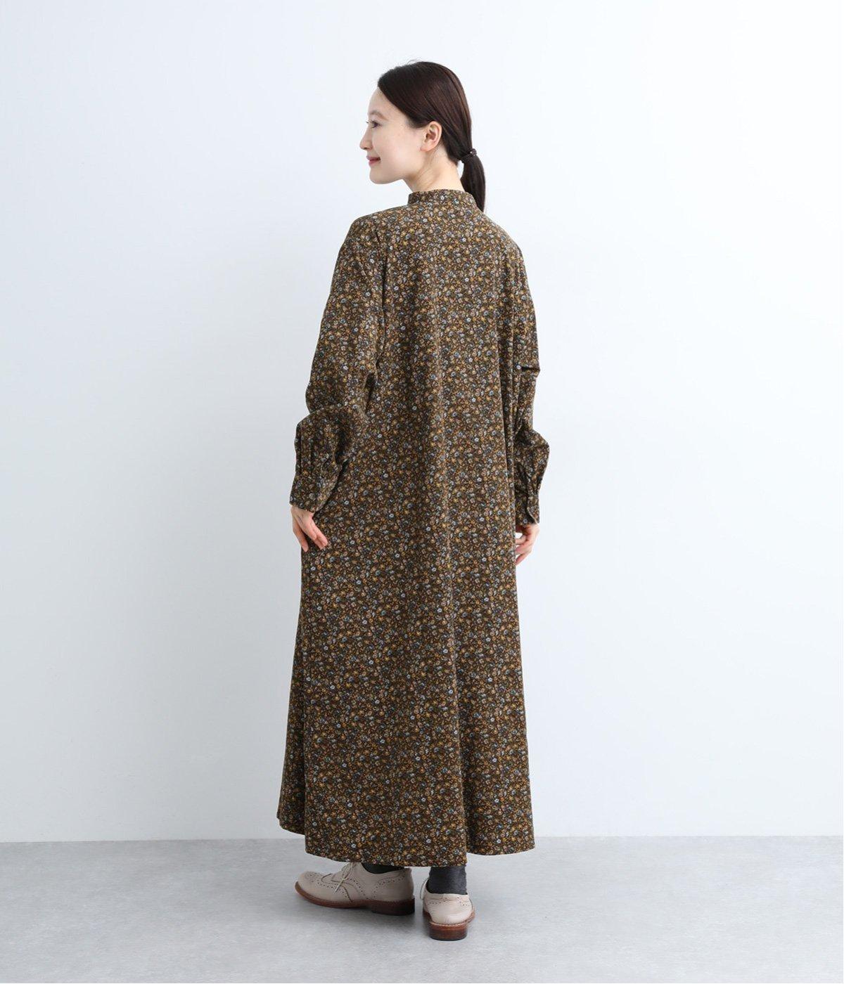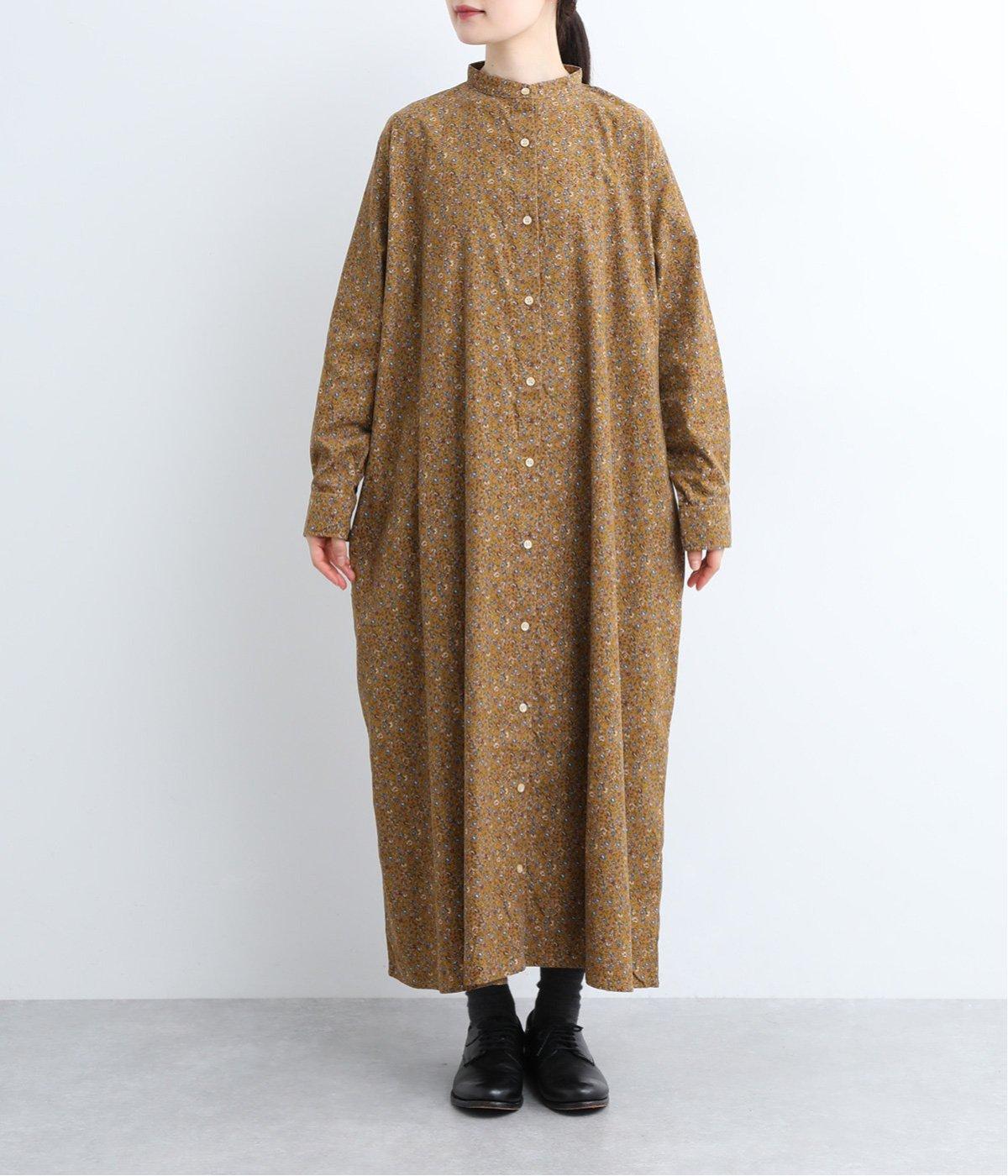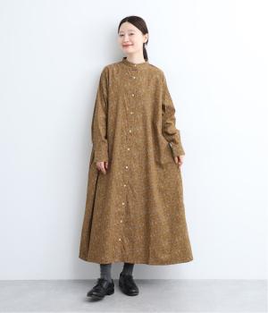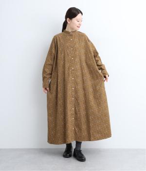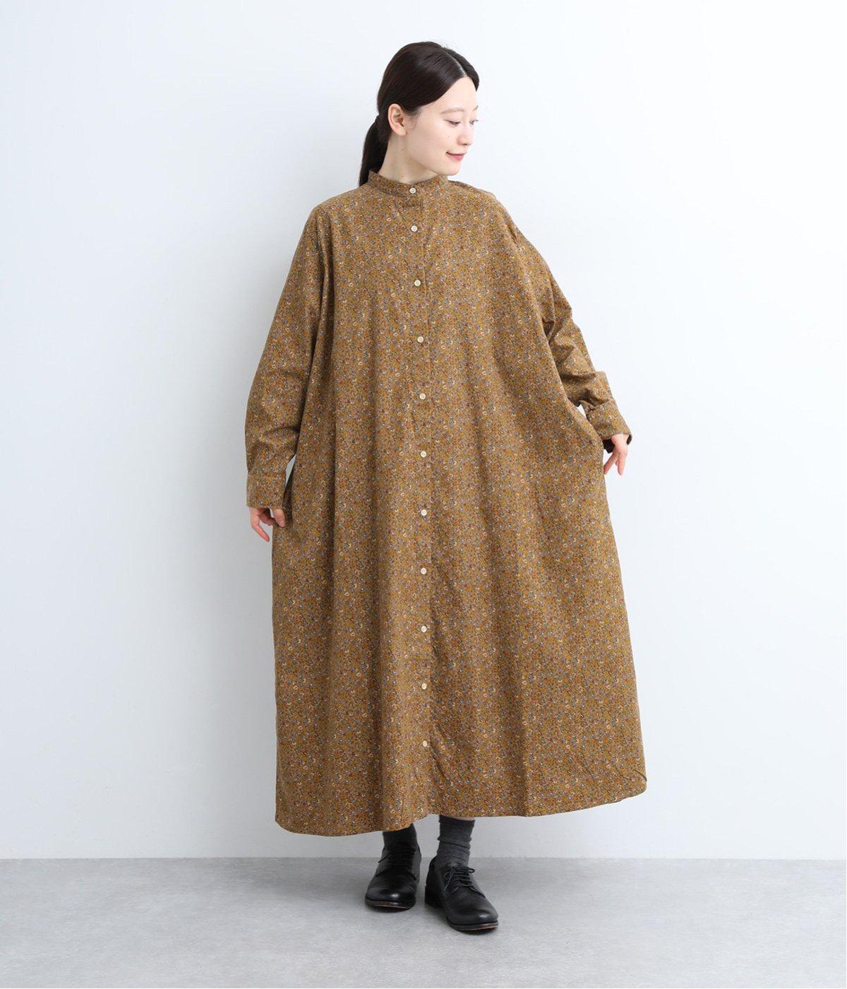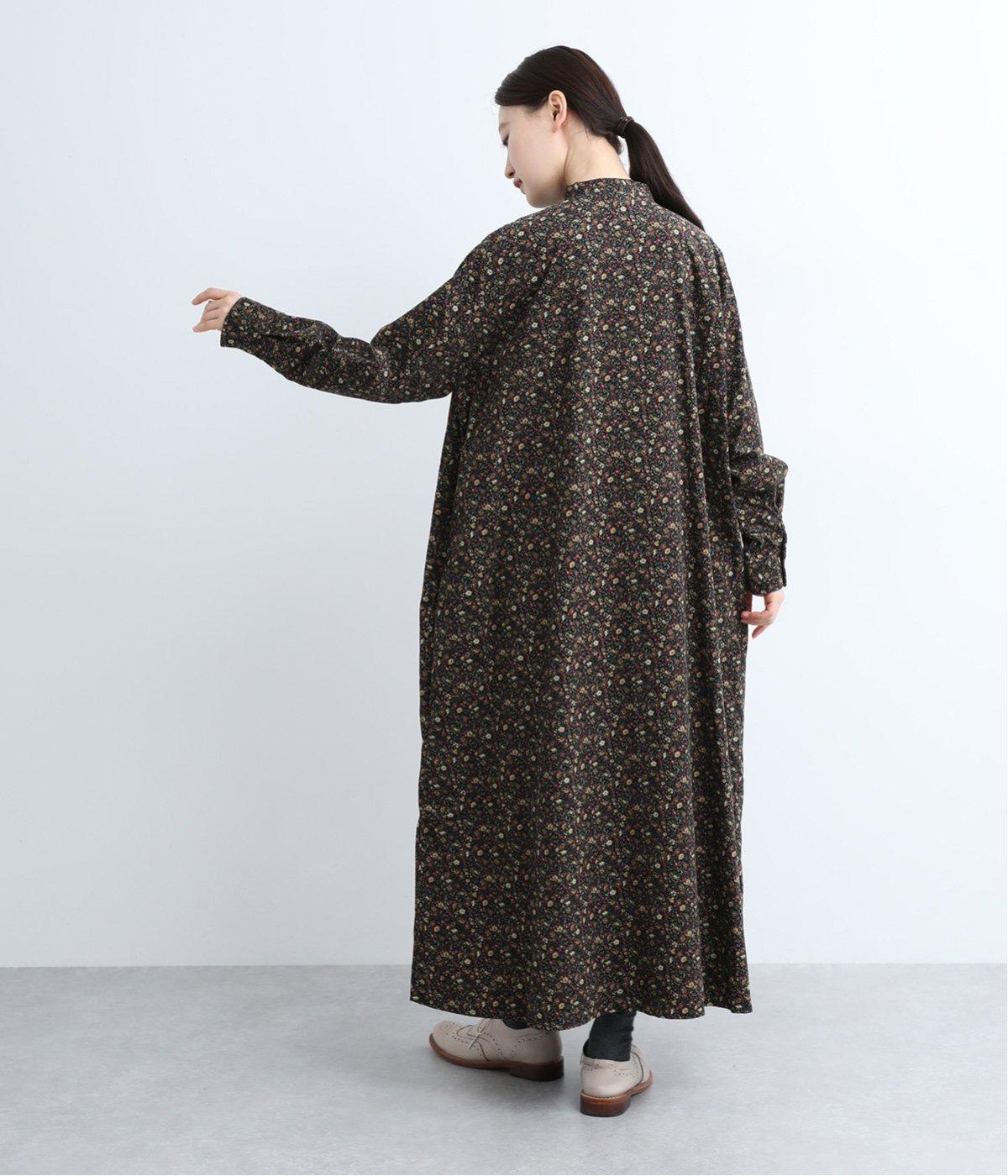 レトロさのあるクラシカルな総花柄で着映え力のあるワンピース。ゆるやかに広がるシンプルなAラインシルエットも雰囲気を盛り上げ、顔まわりはバンドカラーですっきりバランスよく。前あきの羽織りスタイルもお洒落度アップ。